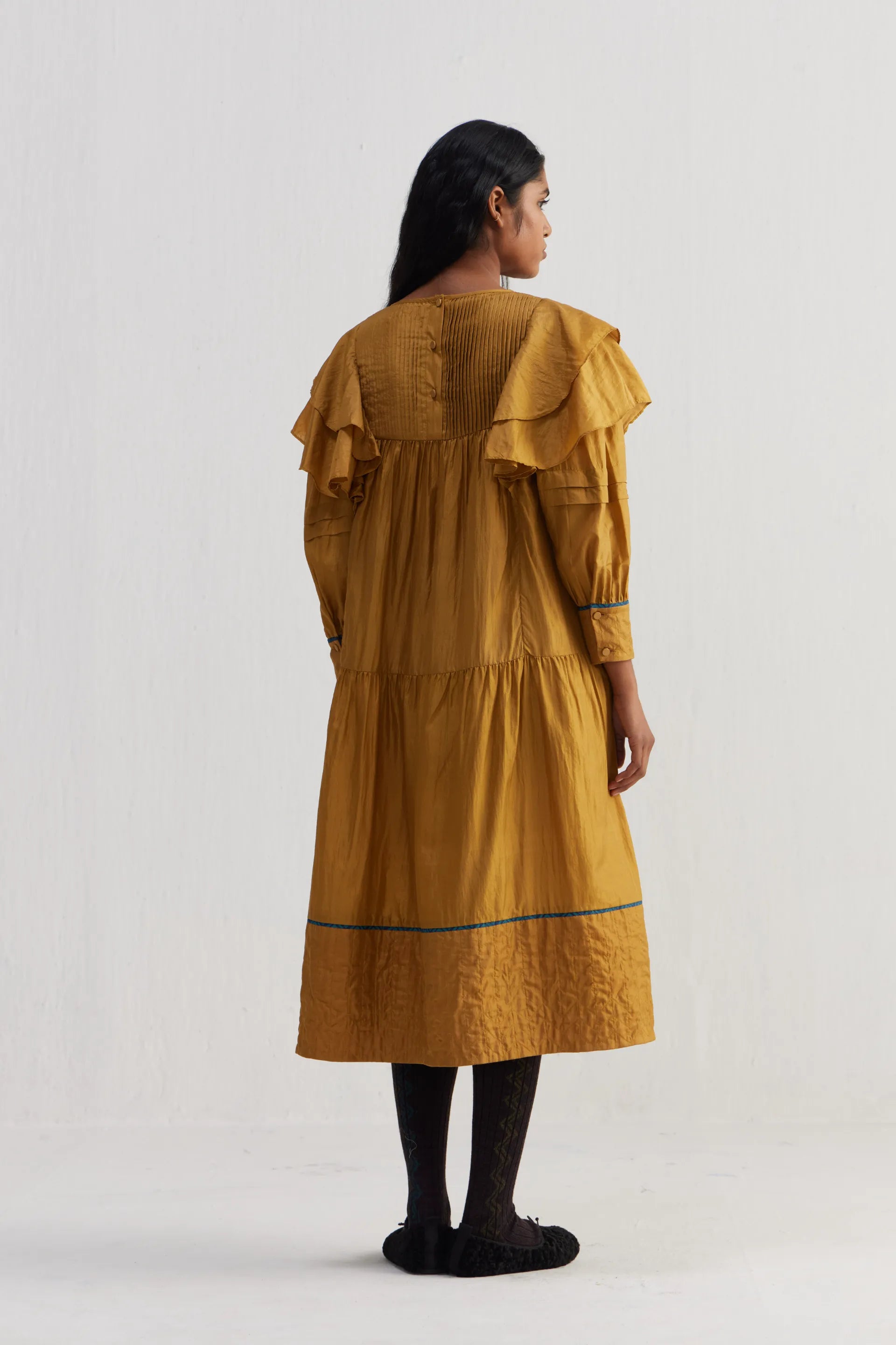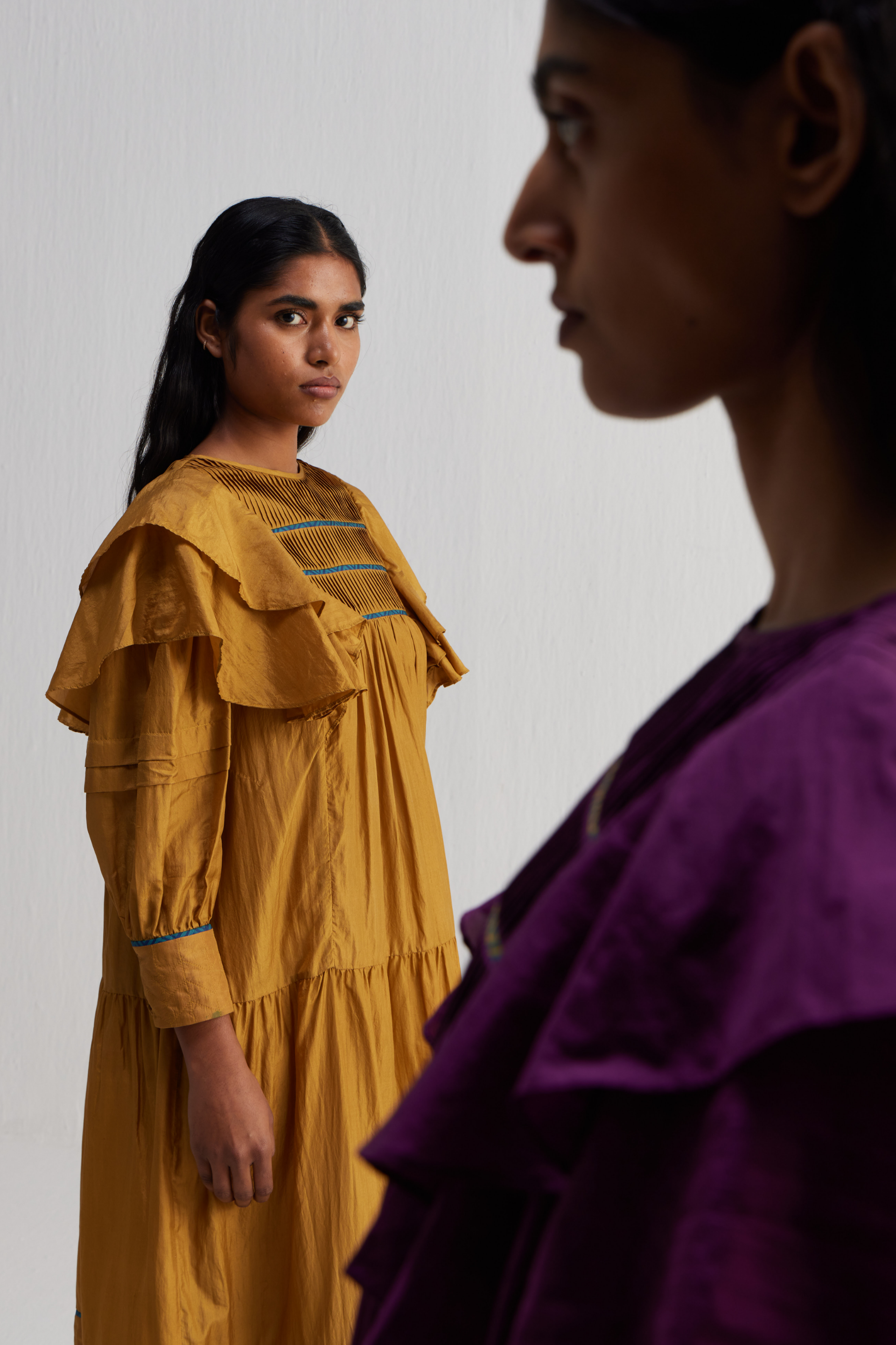 Round neckline gathered tier detail midi dress with 3/4 puff sleeves, ruffle detail on armhole and quilting detail on hem. Constructed in solid 100% silk fabric. Finished with contrast handblock print 100% silk fabric piping detail across the seams of the dress and contrast collage handblock print 100% silk fabric facing detail.