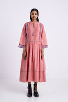 Mandarin collar front tye-up detail 3/4 sleeve length midaxi length dress with front yoke, gathers on the waistline and floral embroidery inserts on yoke and sleeve and ladder lace insert detail on hem. Constructed in solid 100% silk fabric.