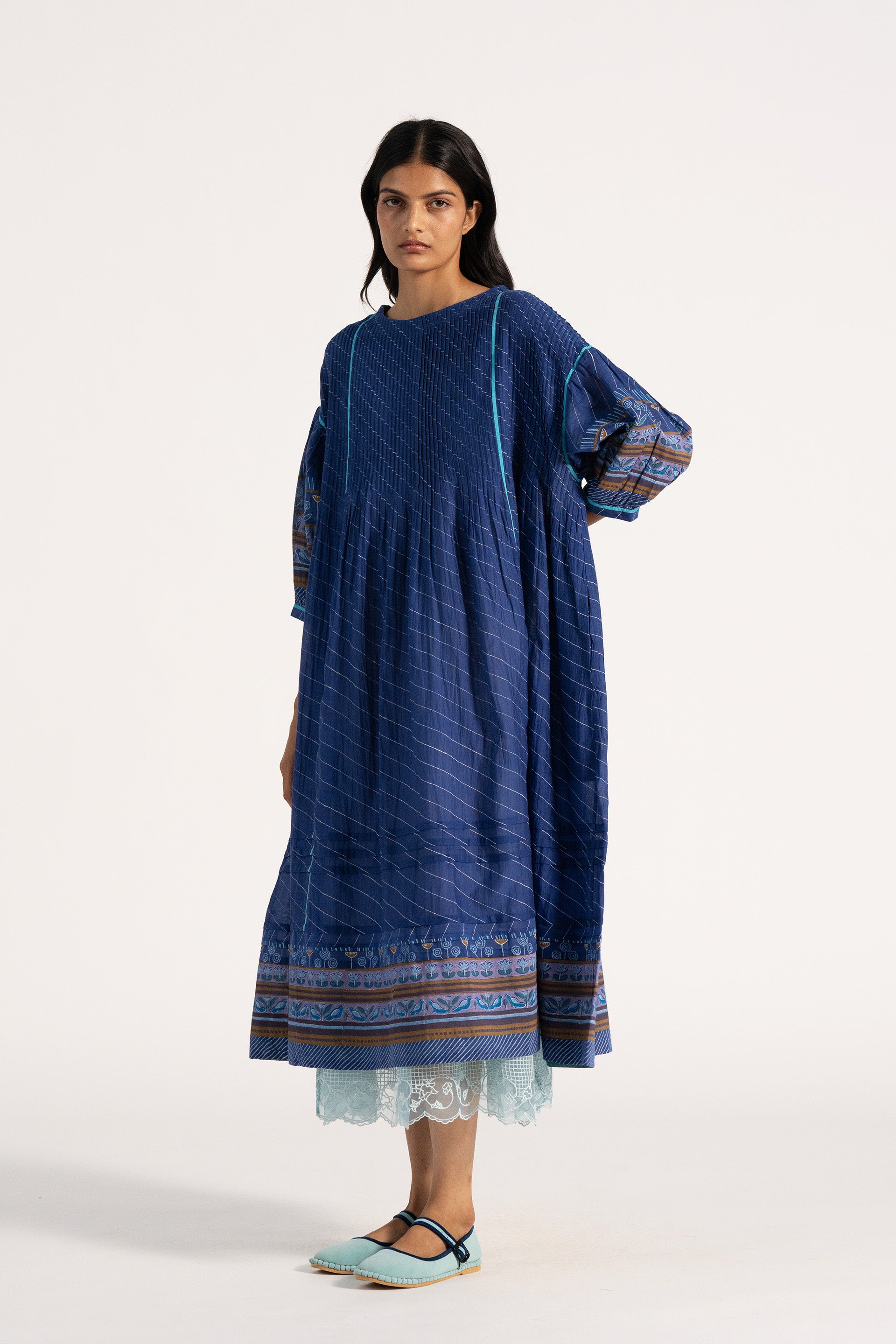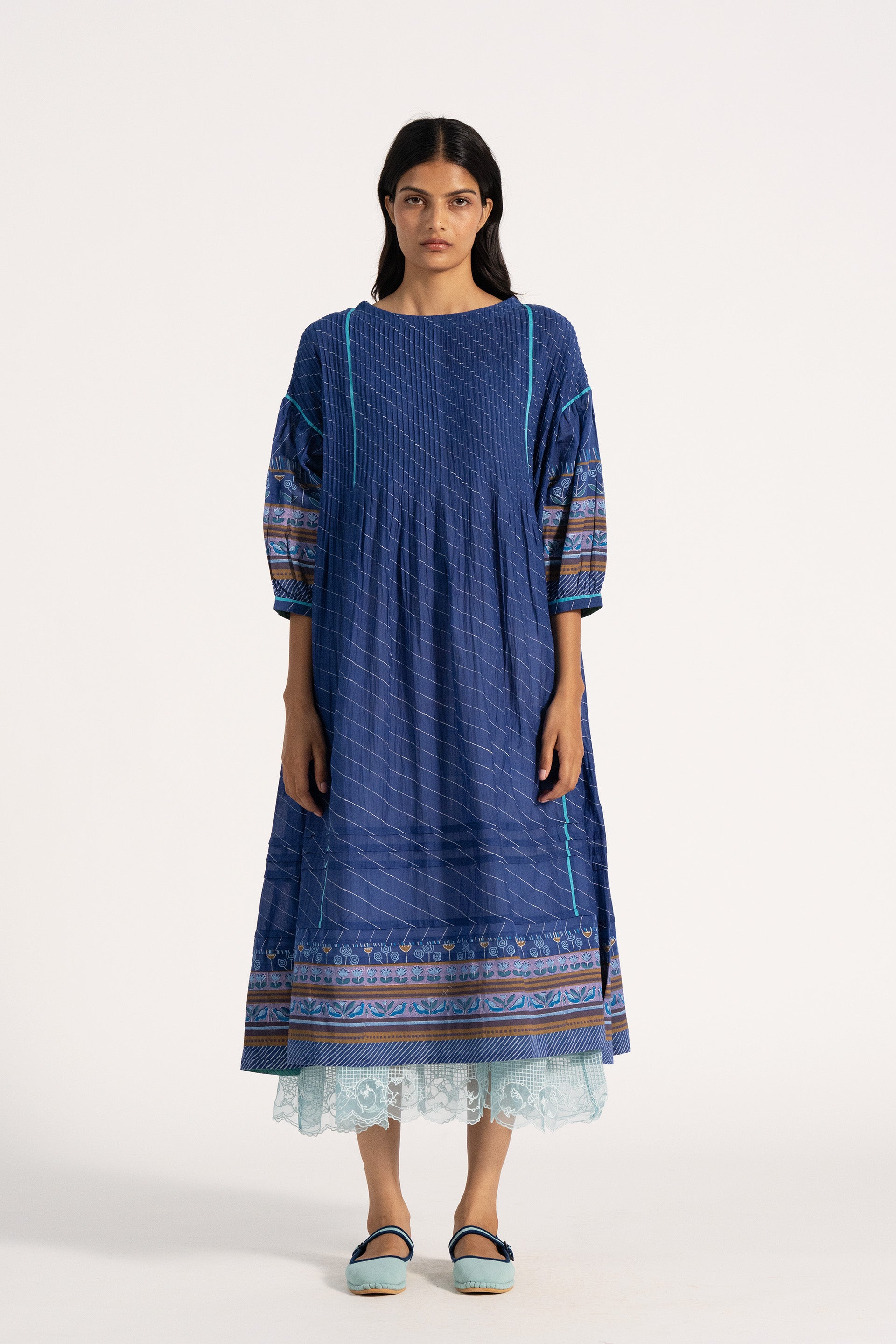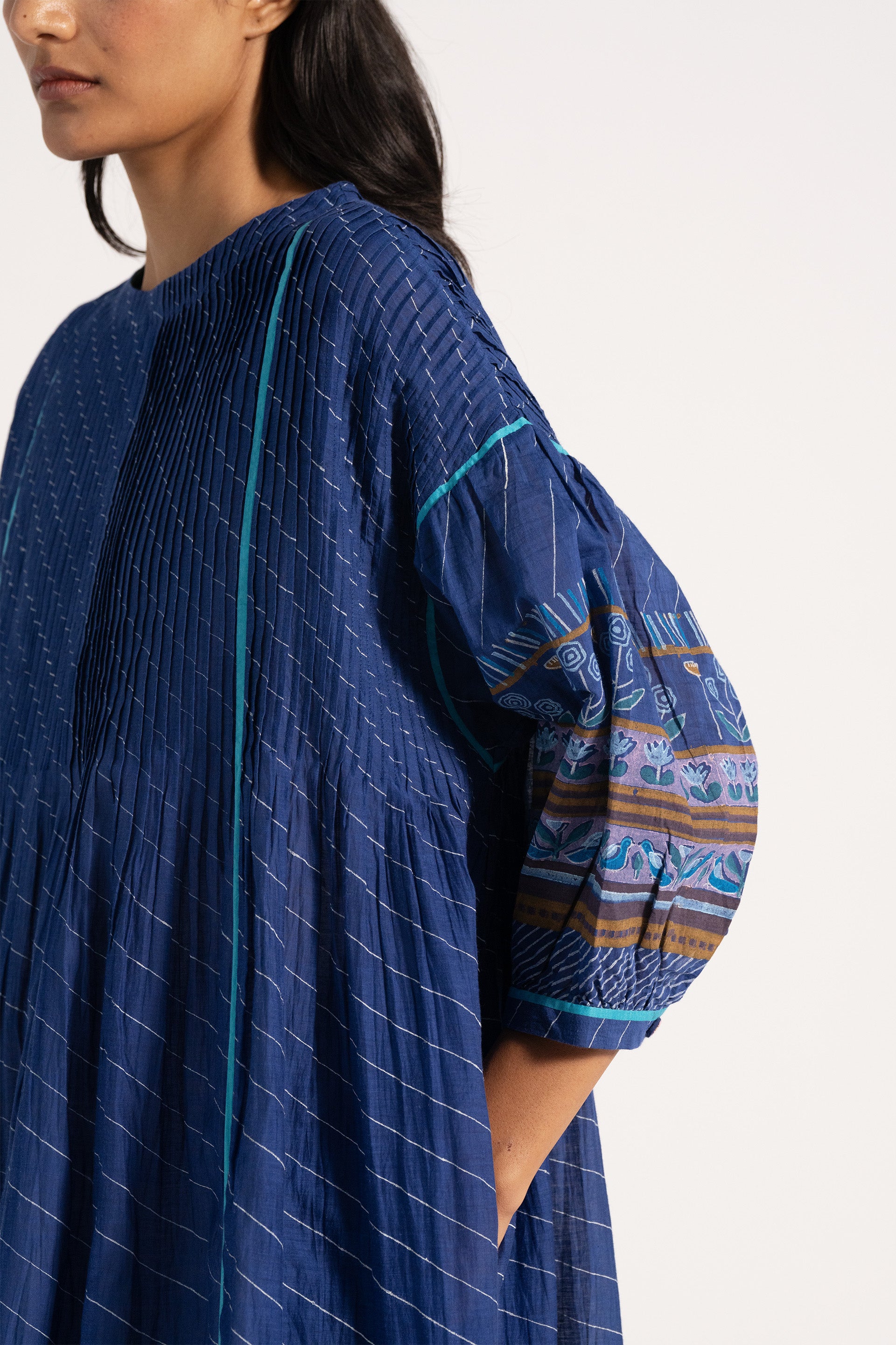 Relaxed fit boat neck dress in cotton silk blend. With all over pintuck detail in multicolor handblock print border and puff sleeves.