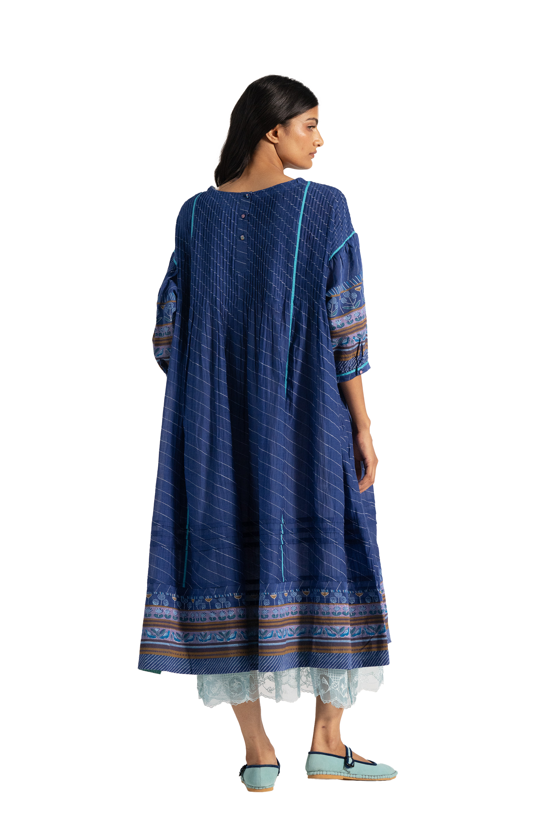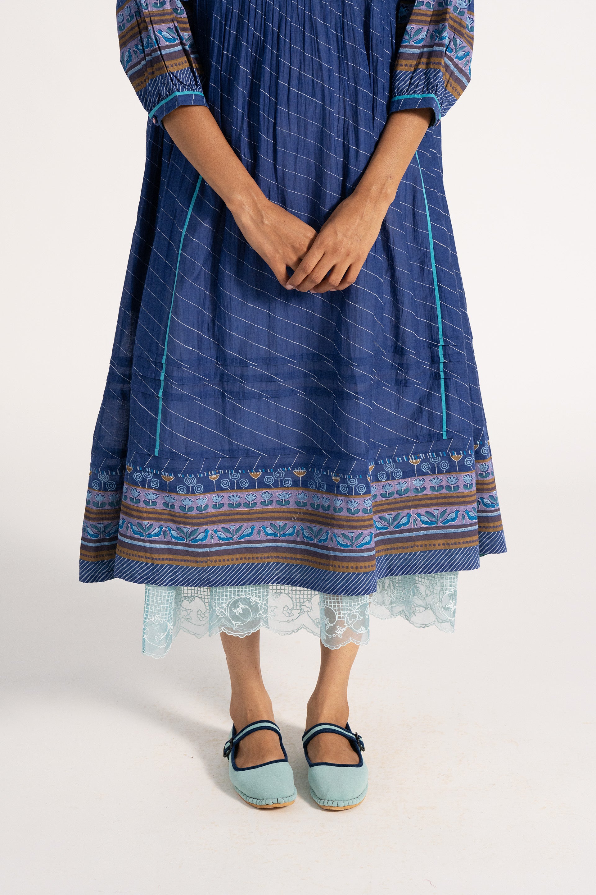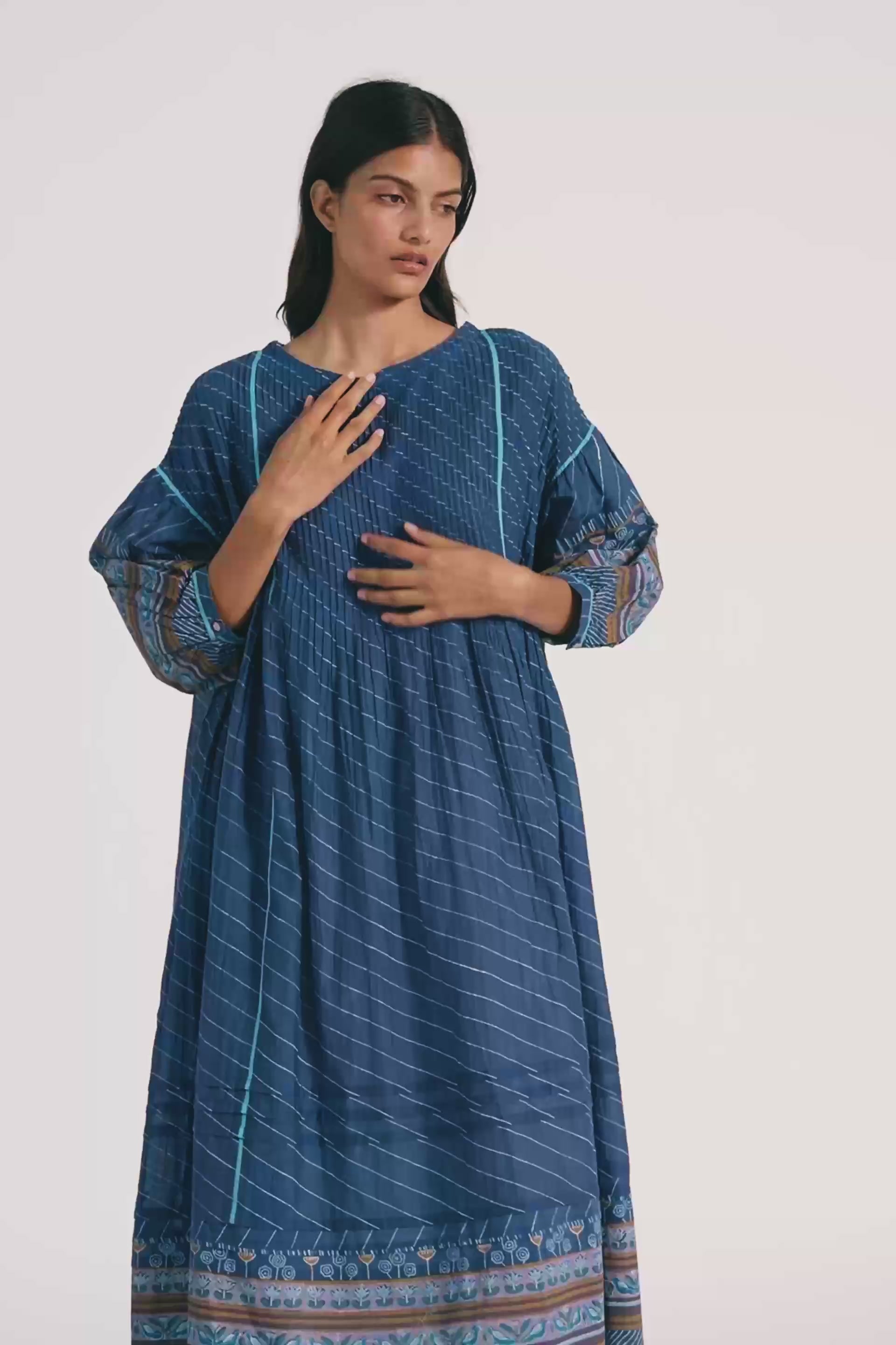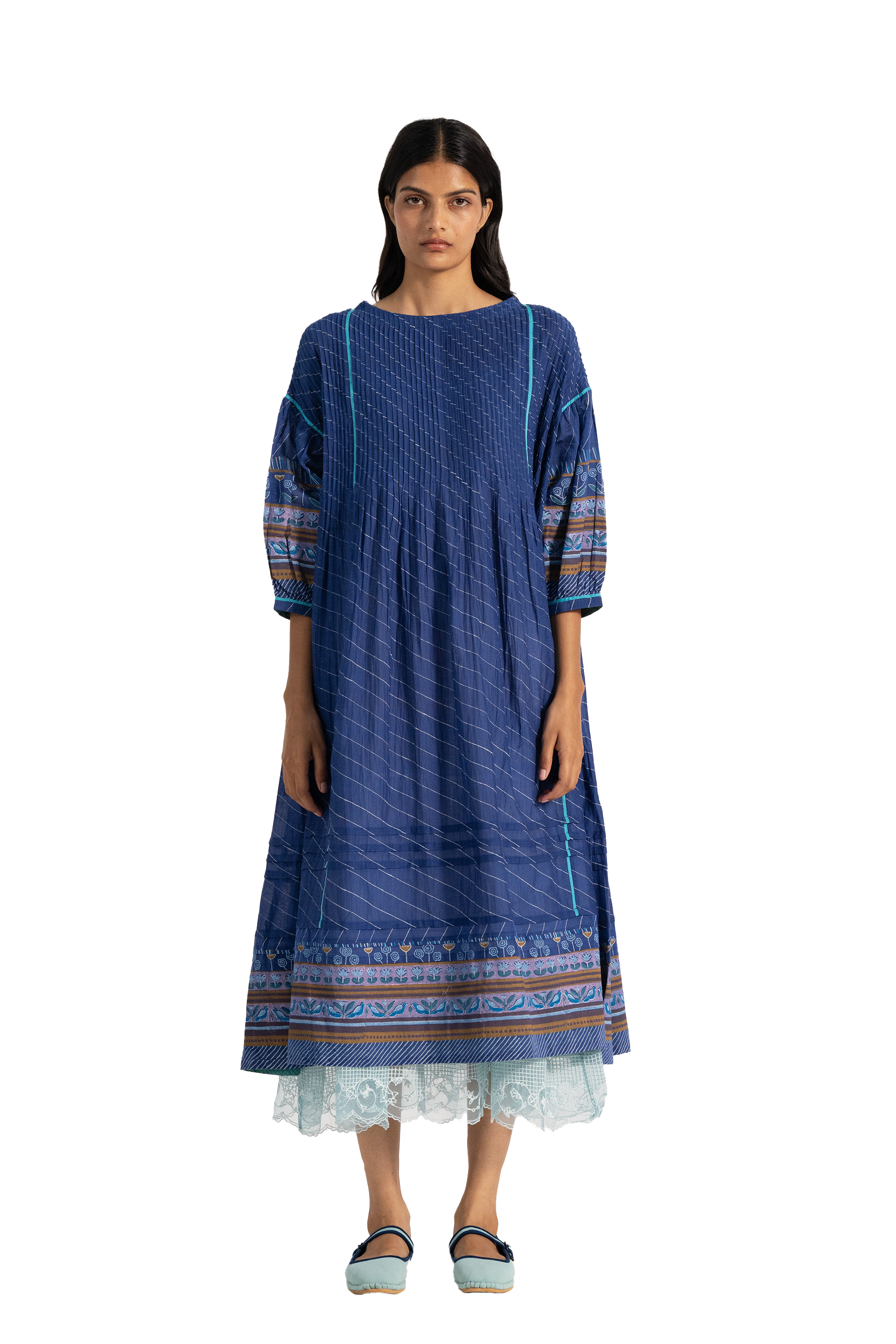 Relaxed fit boat neck dress in cotton silk blend. With all over pintuck detail in multicolor handblock print border and puff sleeves.