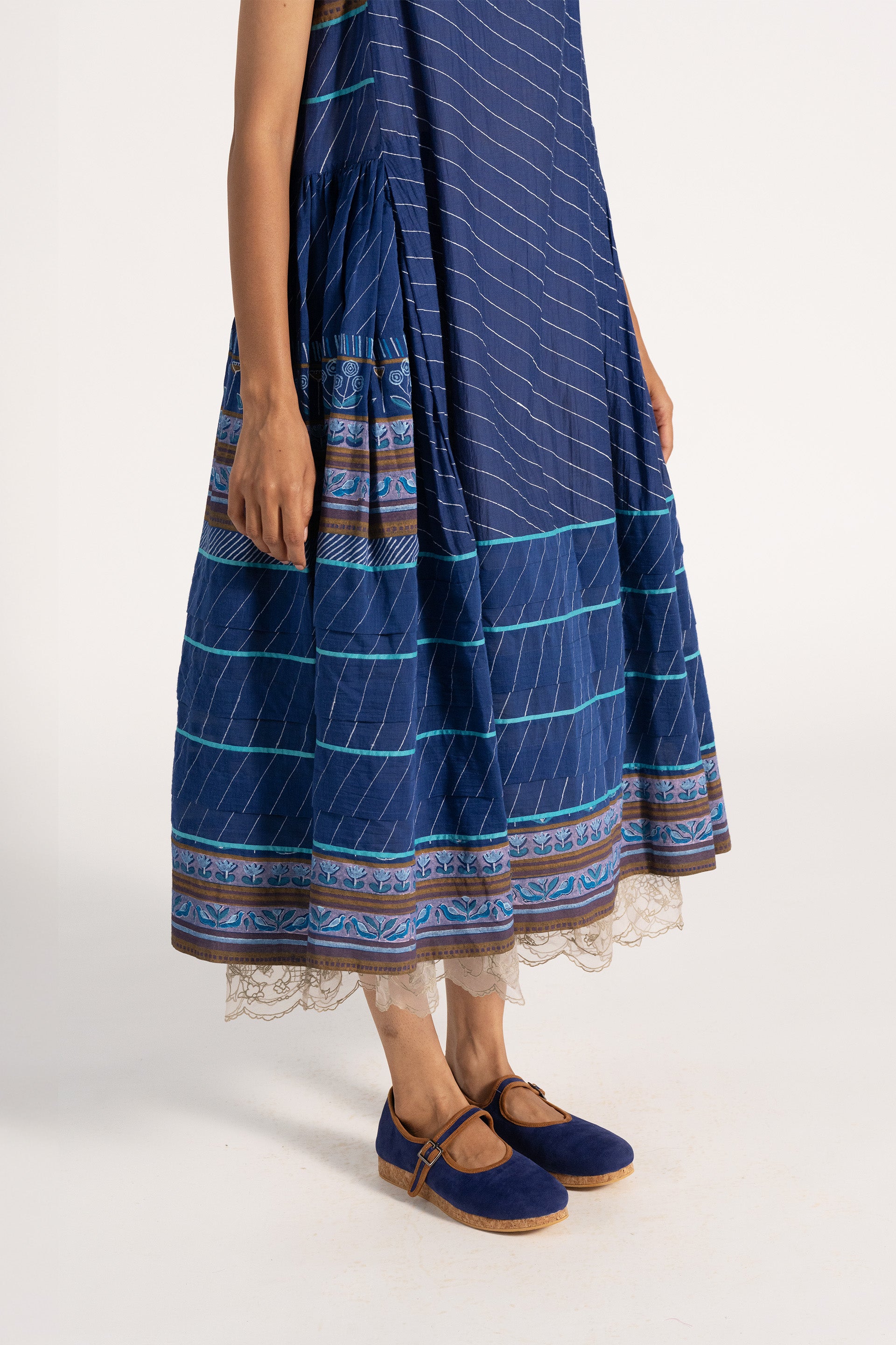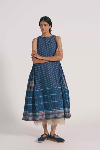 Boat neck sleeveless gathered midi dress in cotton silk blend.