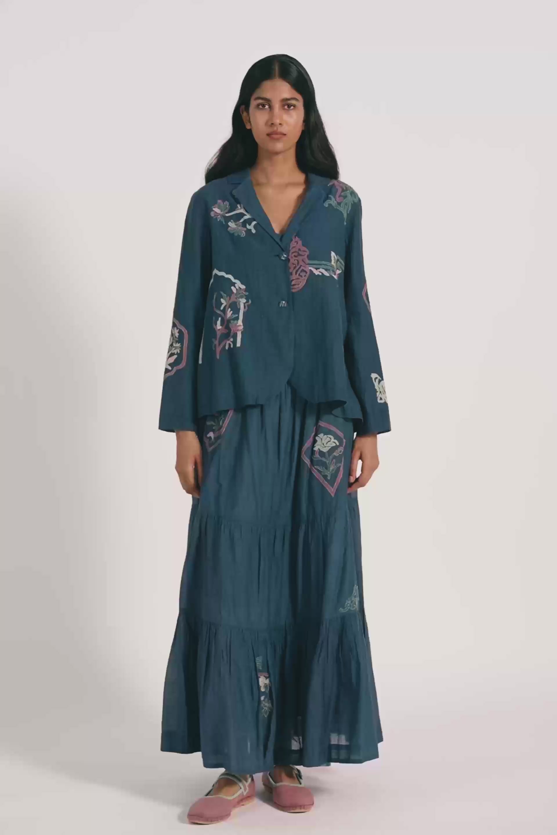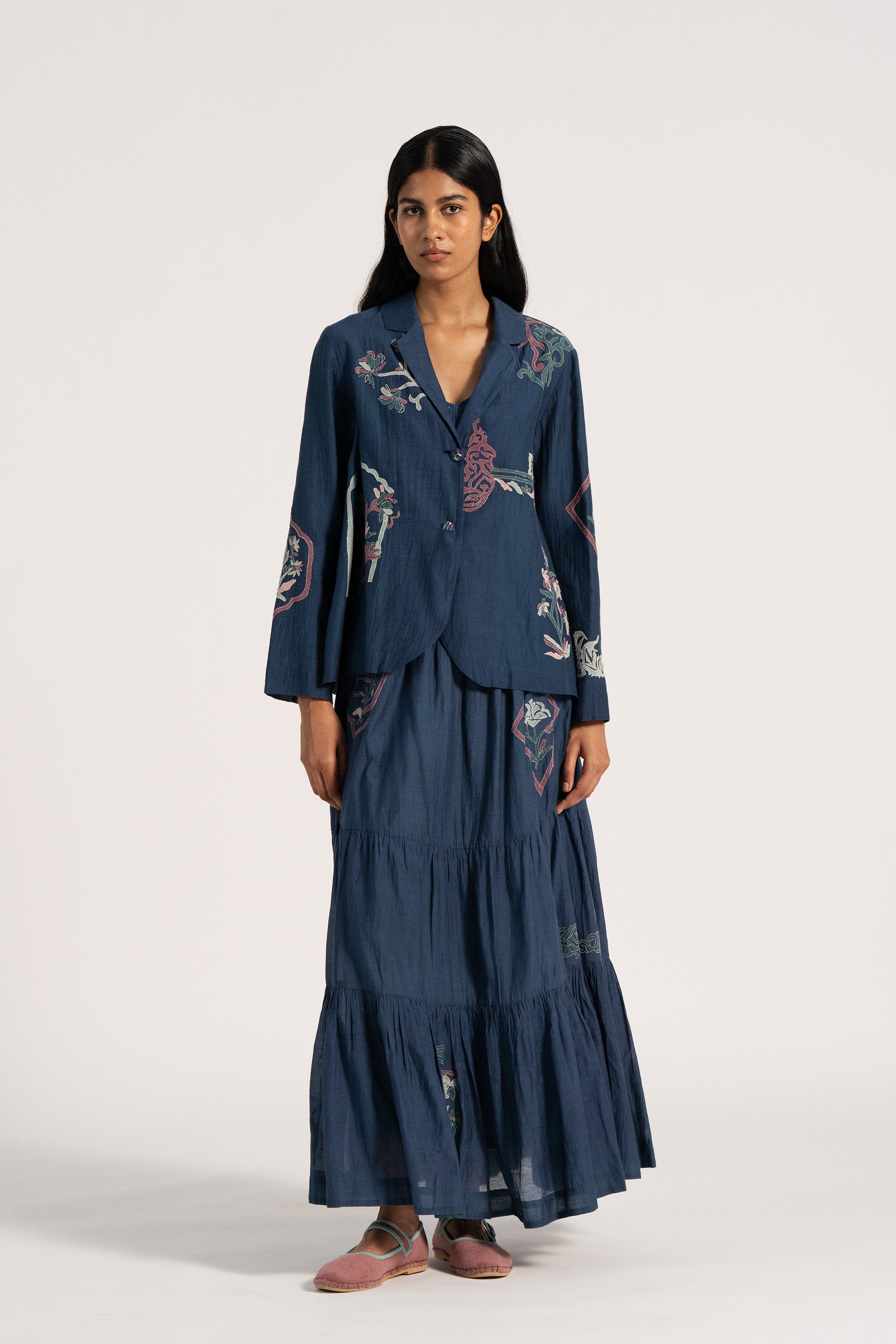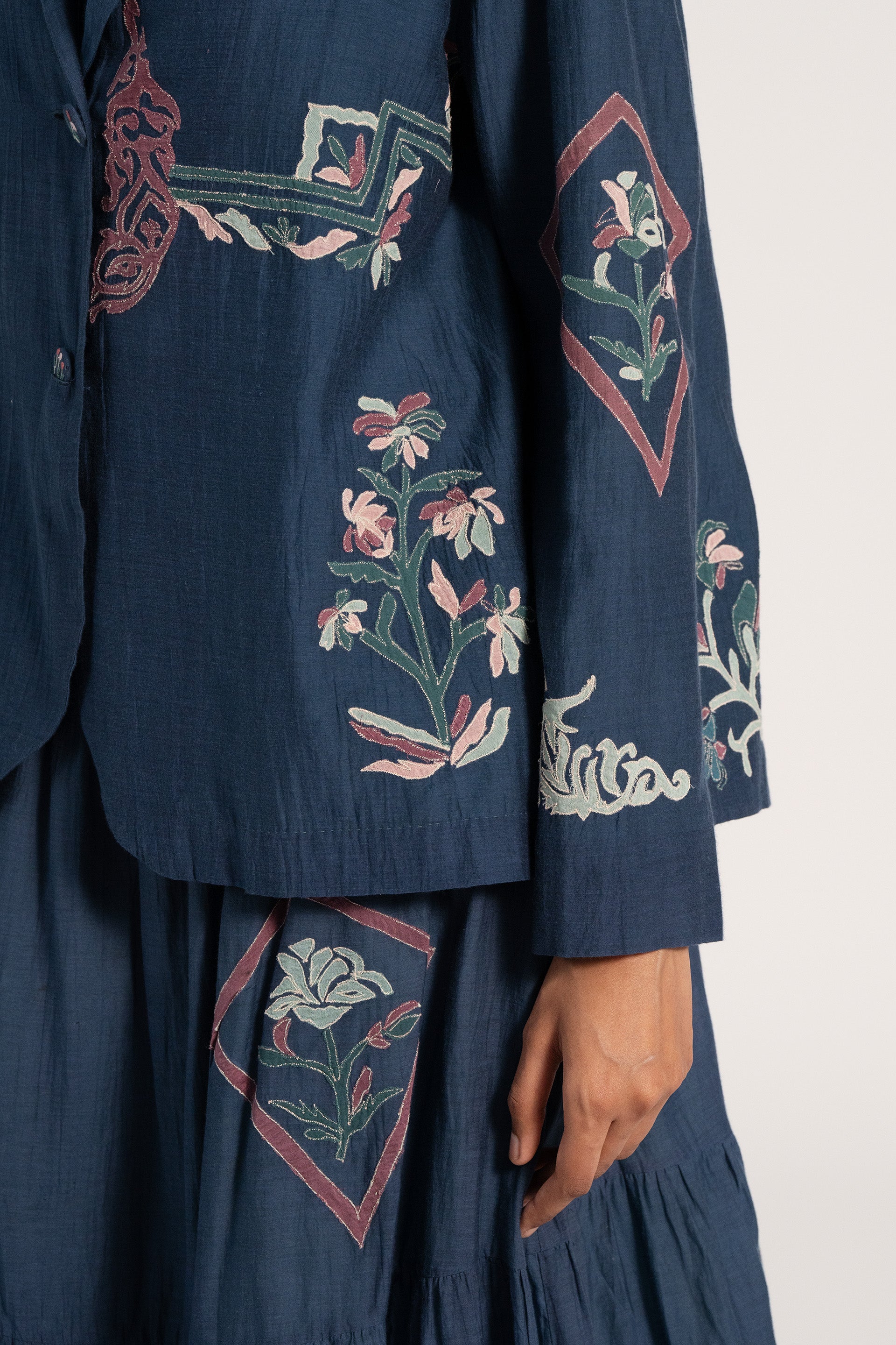 Short jacket with allover contemporary multicolor placement applique motifs in cotton silk blend. Comes with an attached handblock print cotton silk lining.