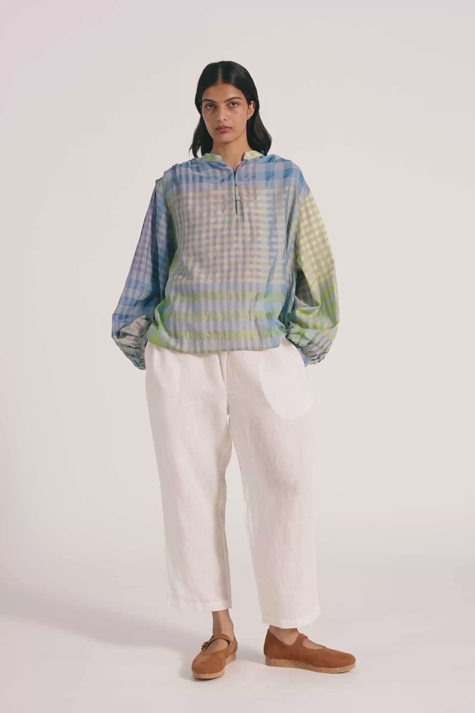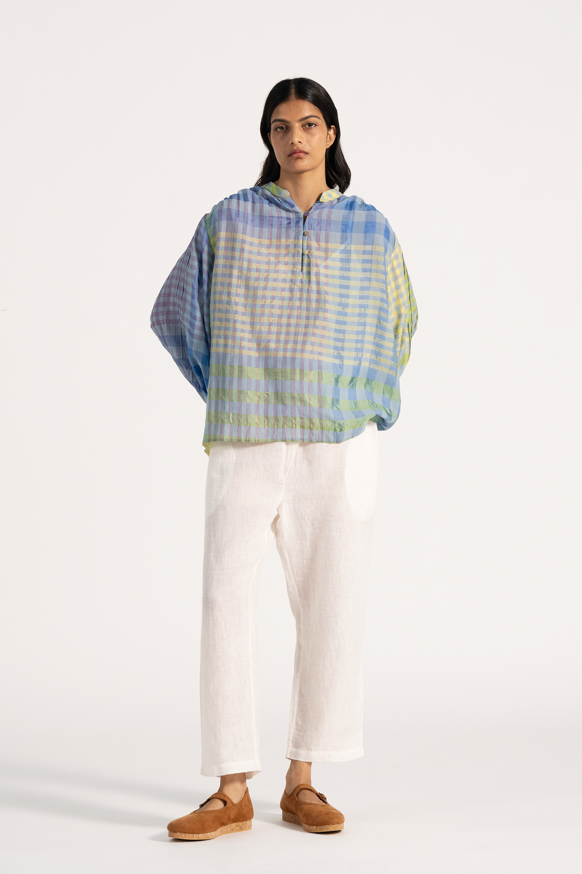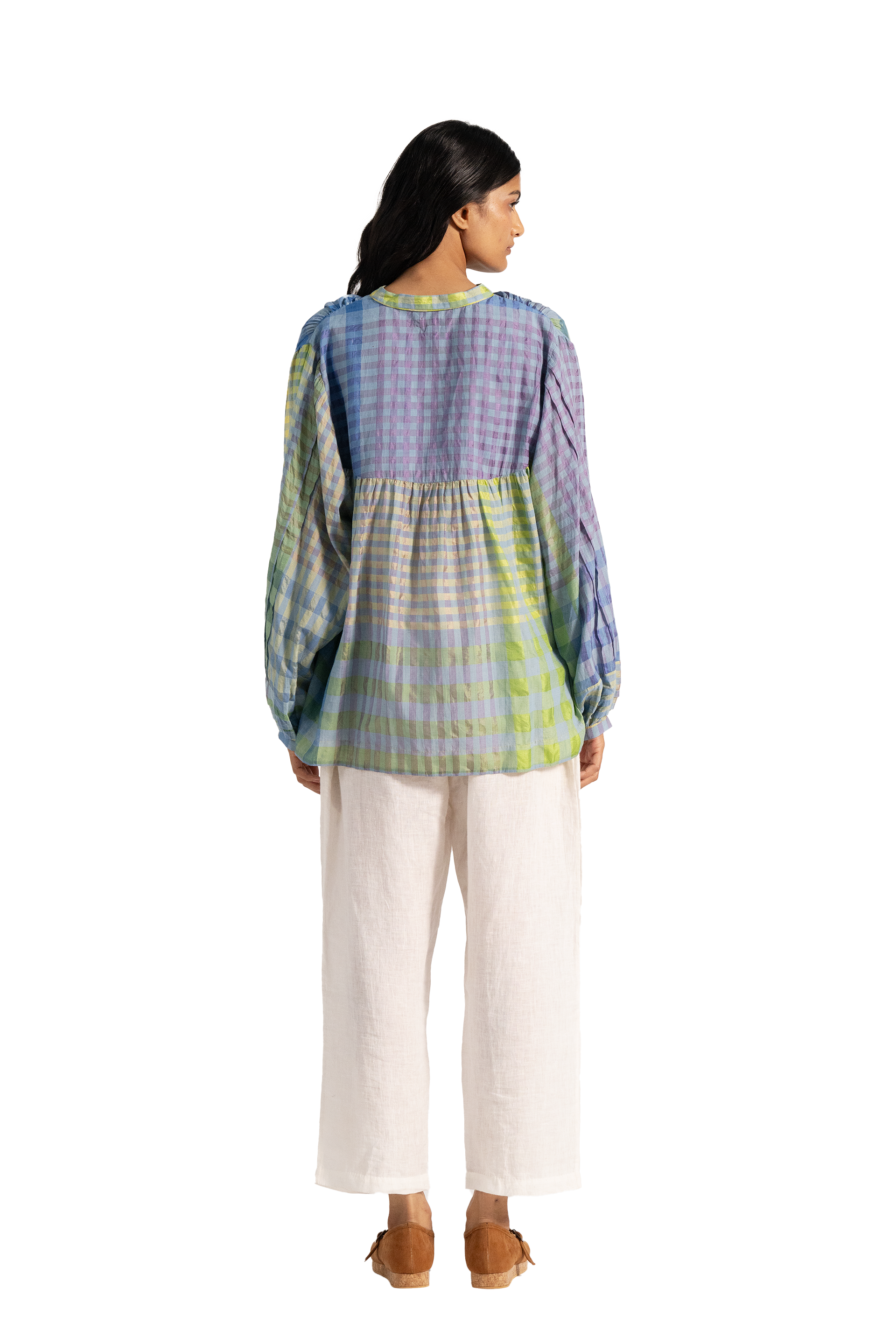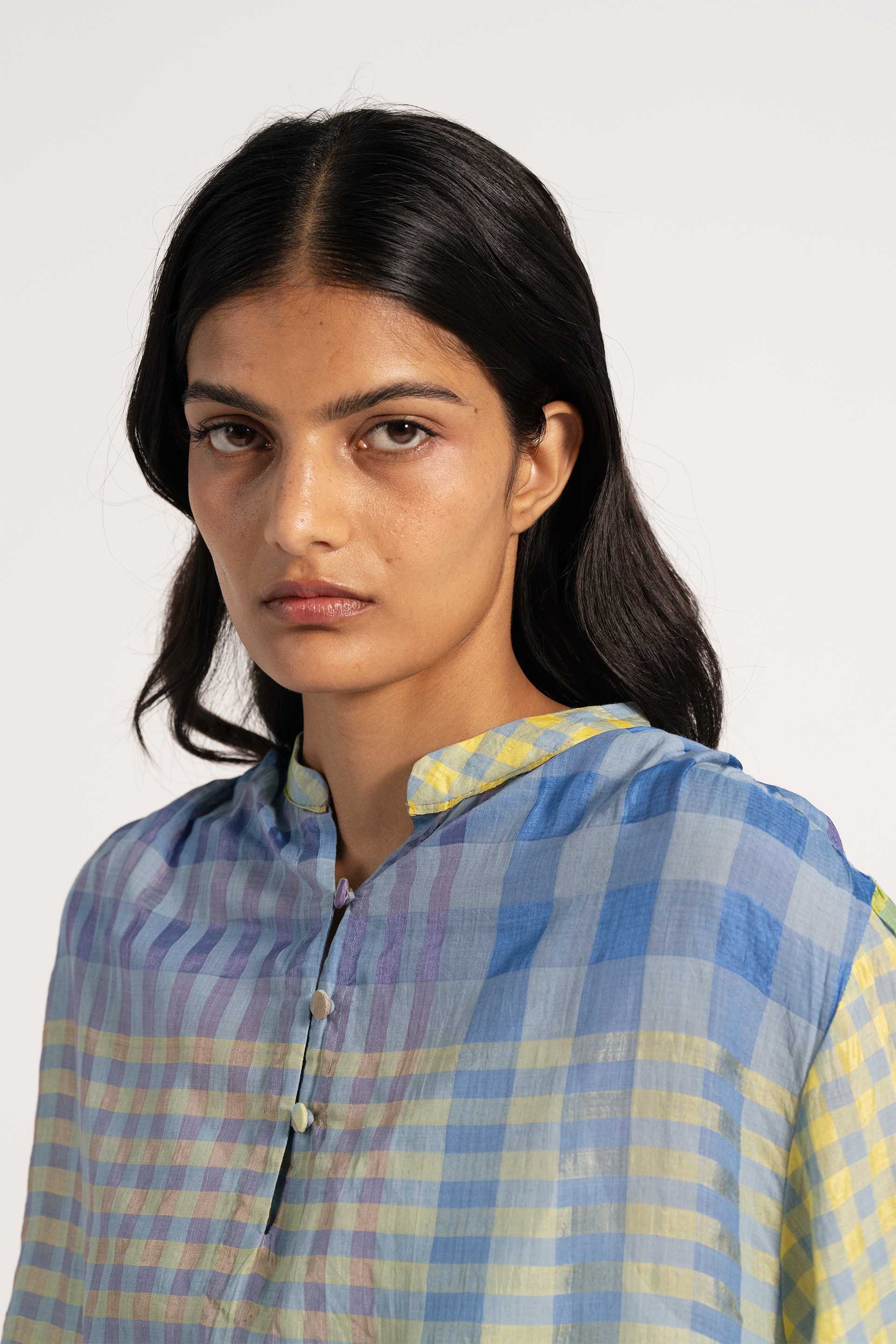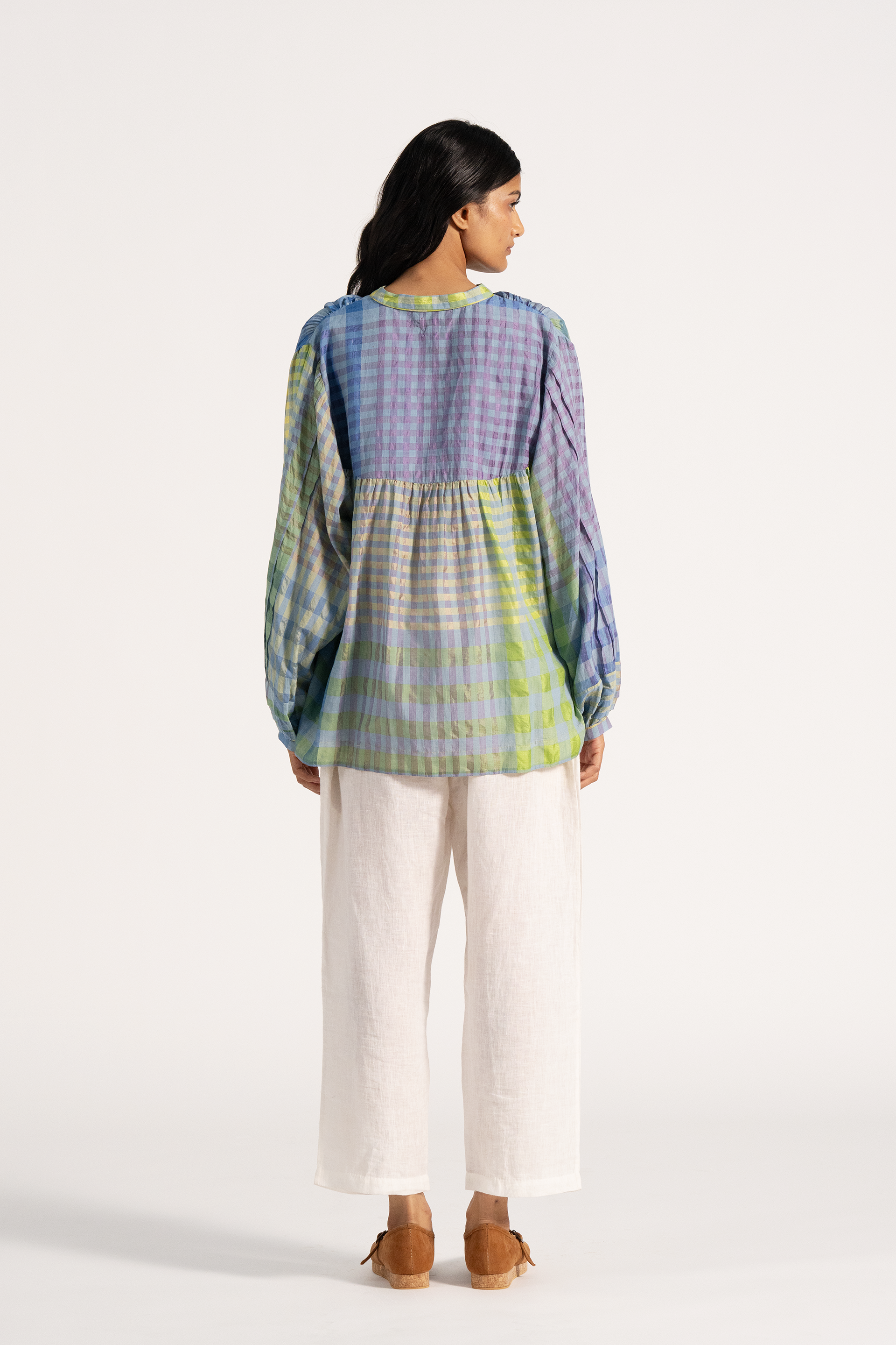 Multicolor checkered puff sleeved top in cotton silk blend.