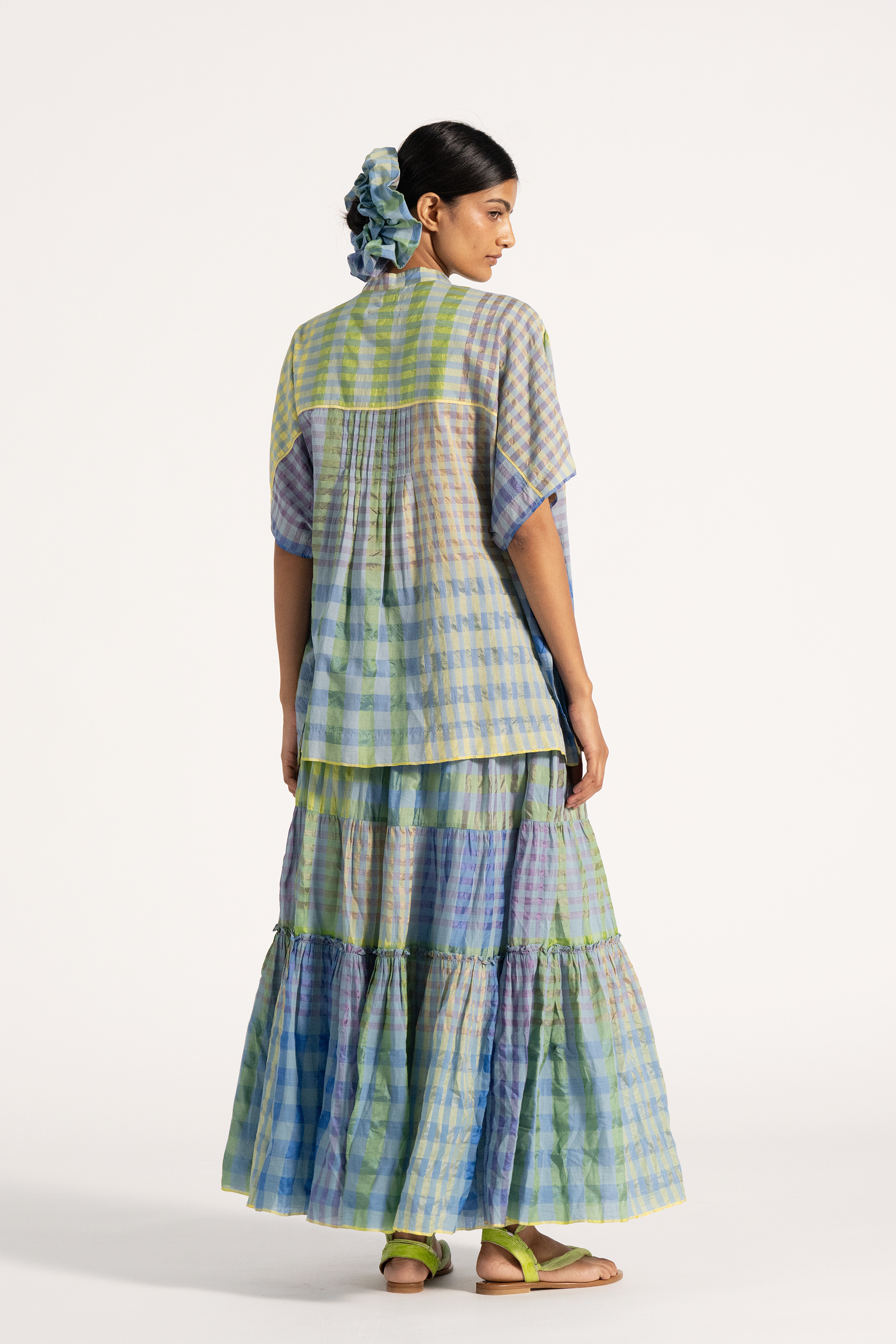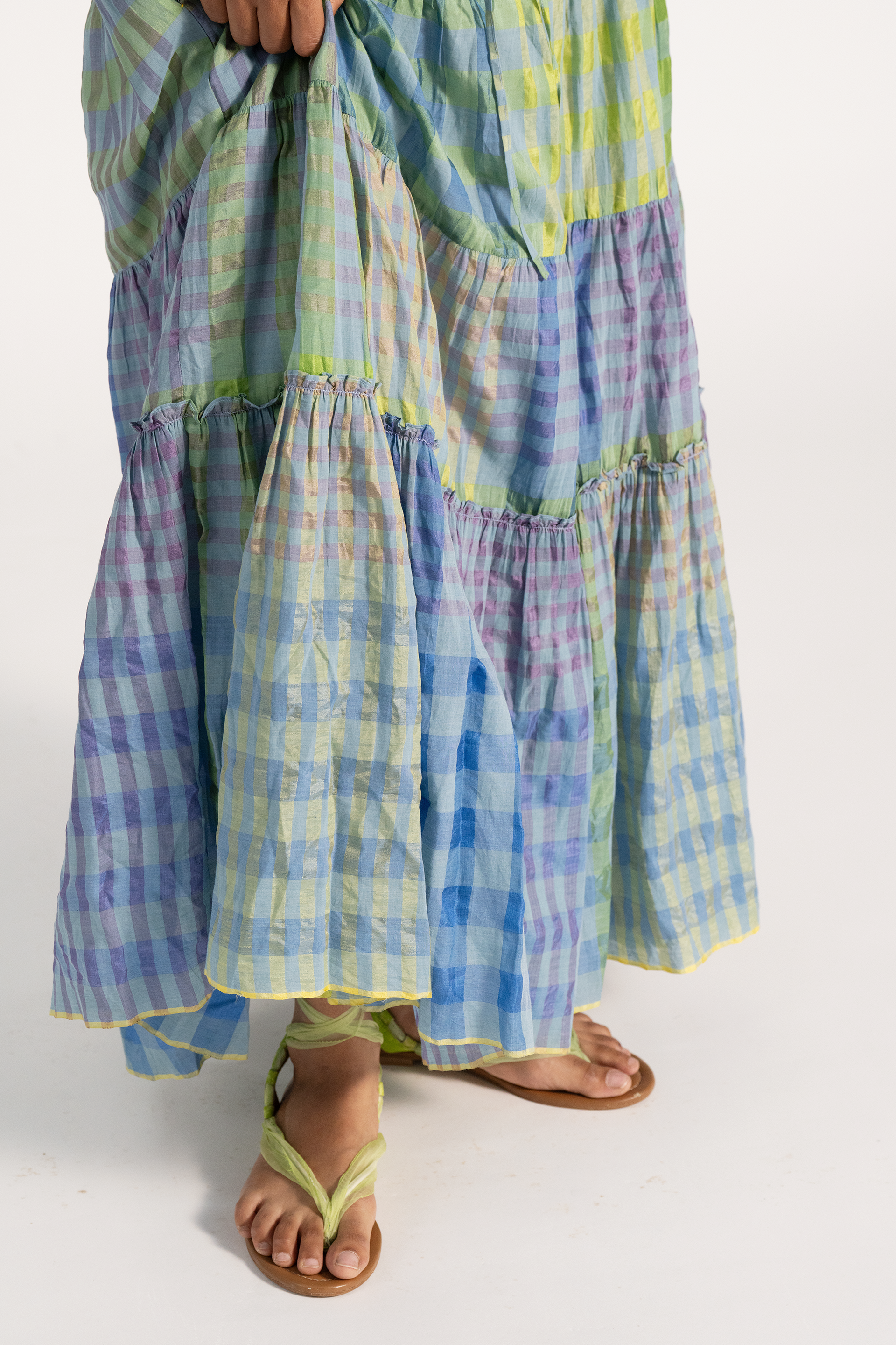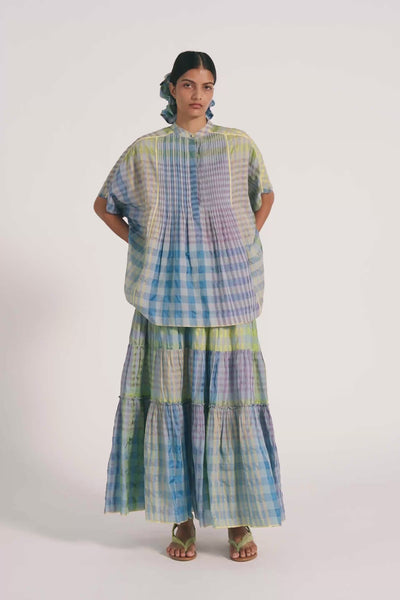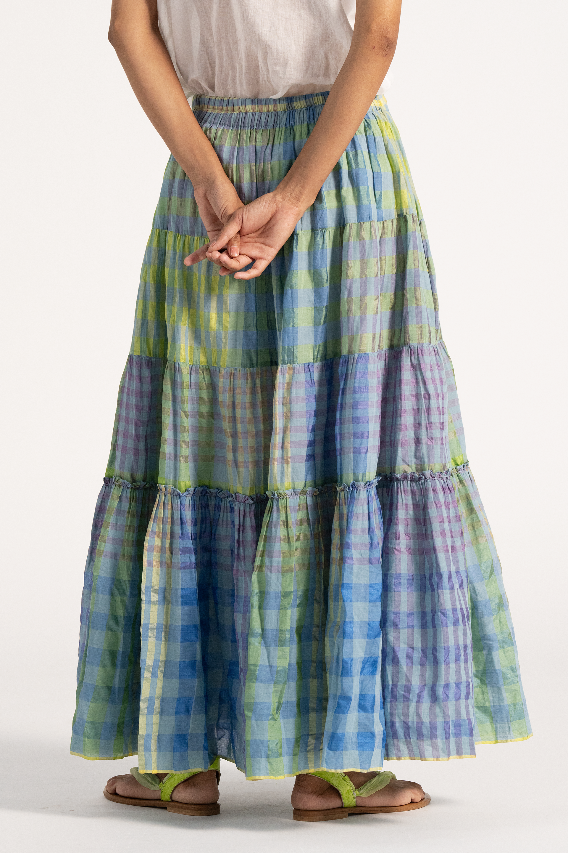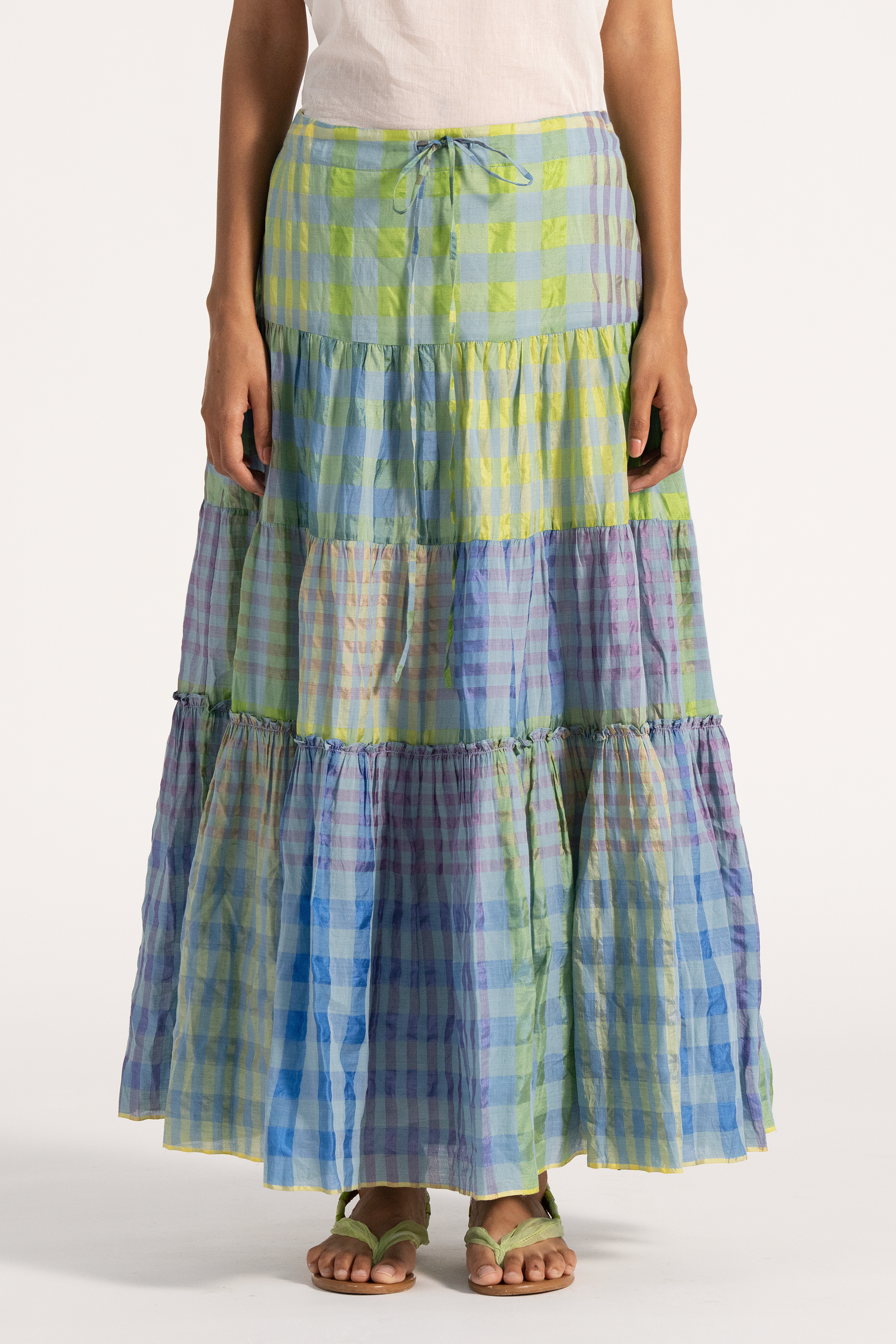 Multicolor checkered maxi length tiered skirt in cotton silk blend.