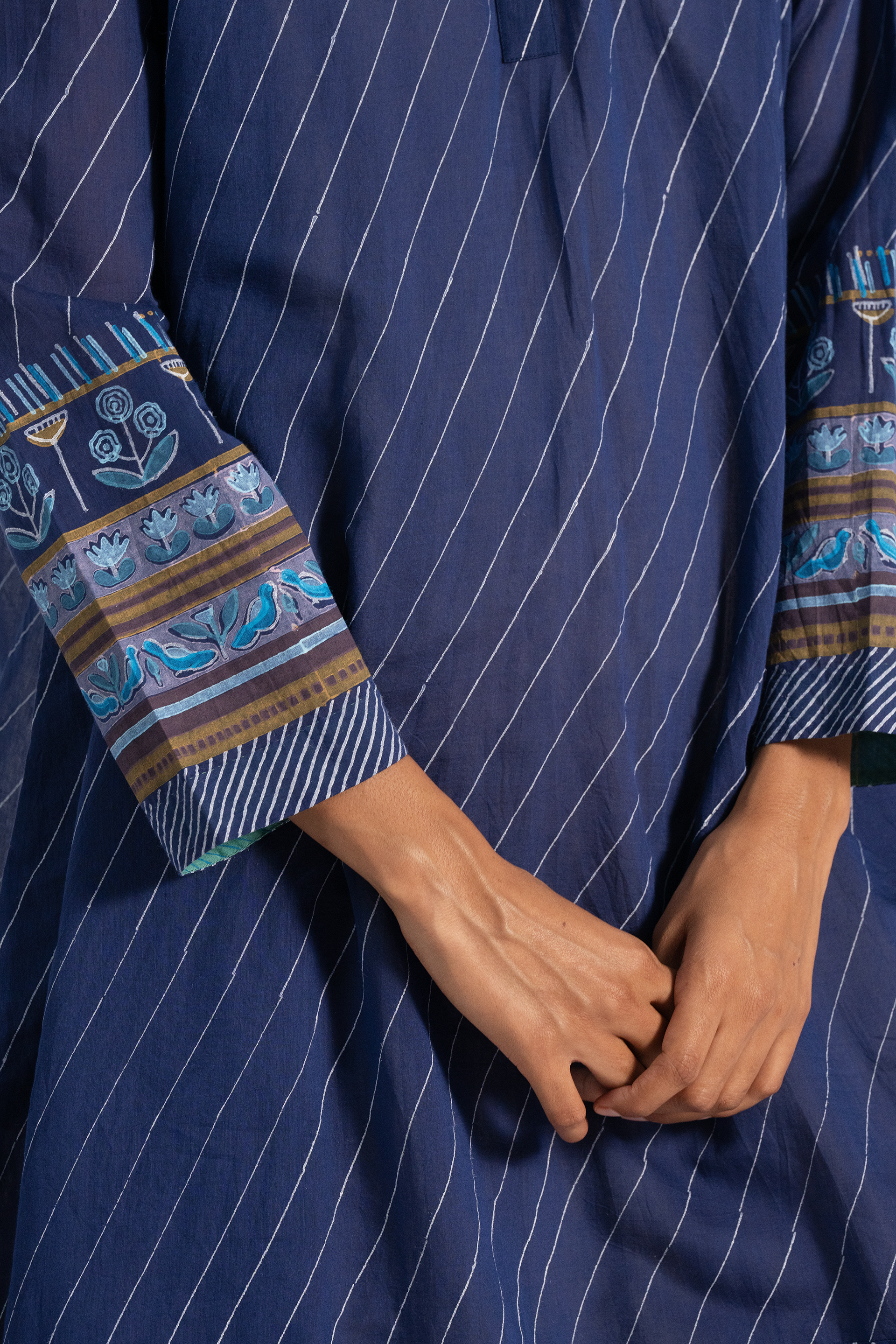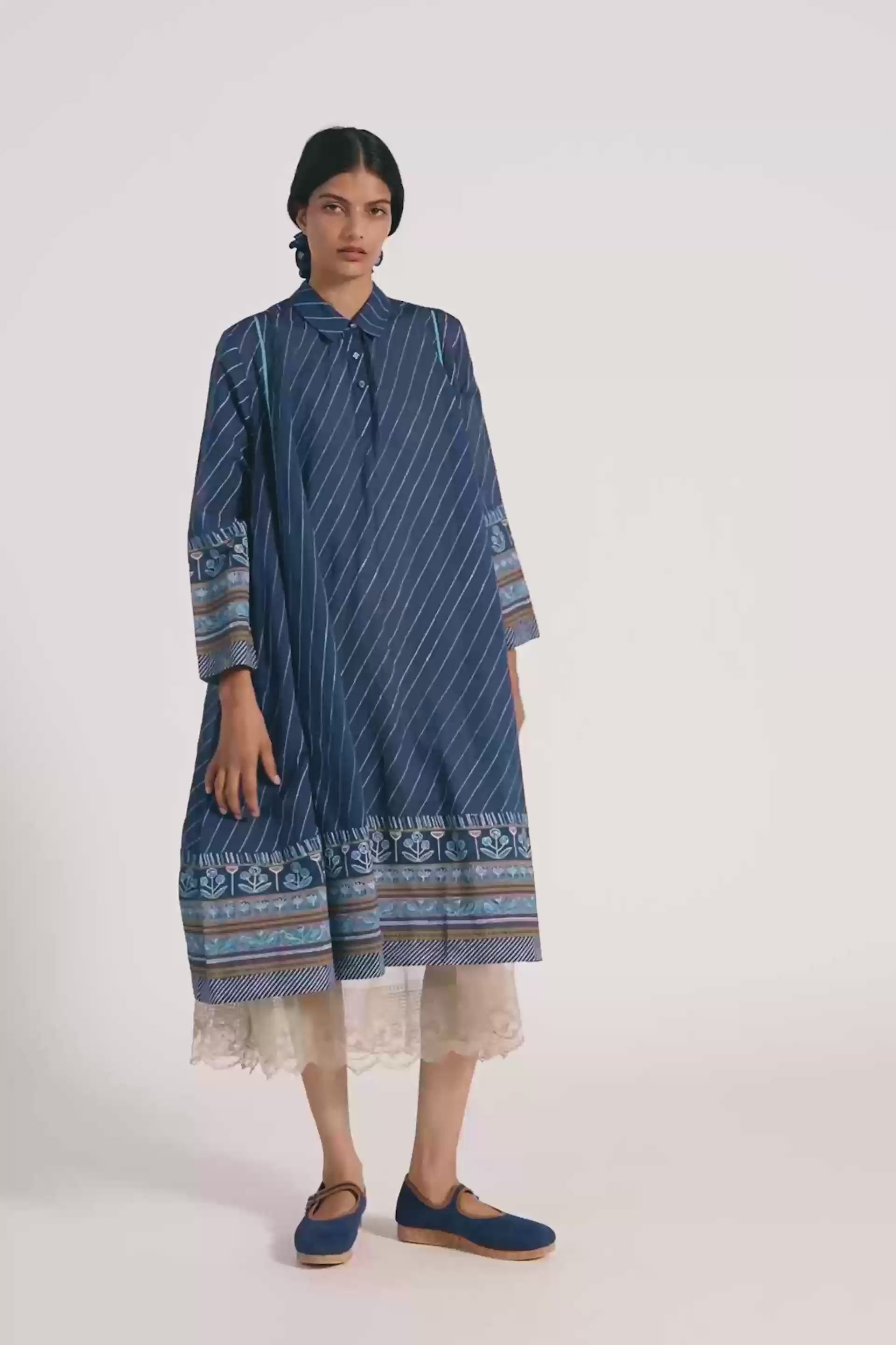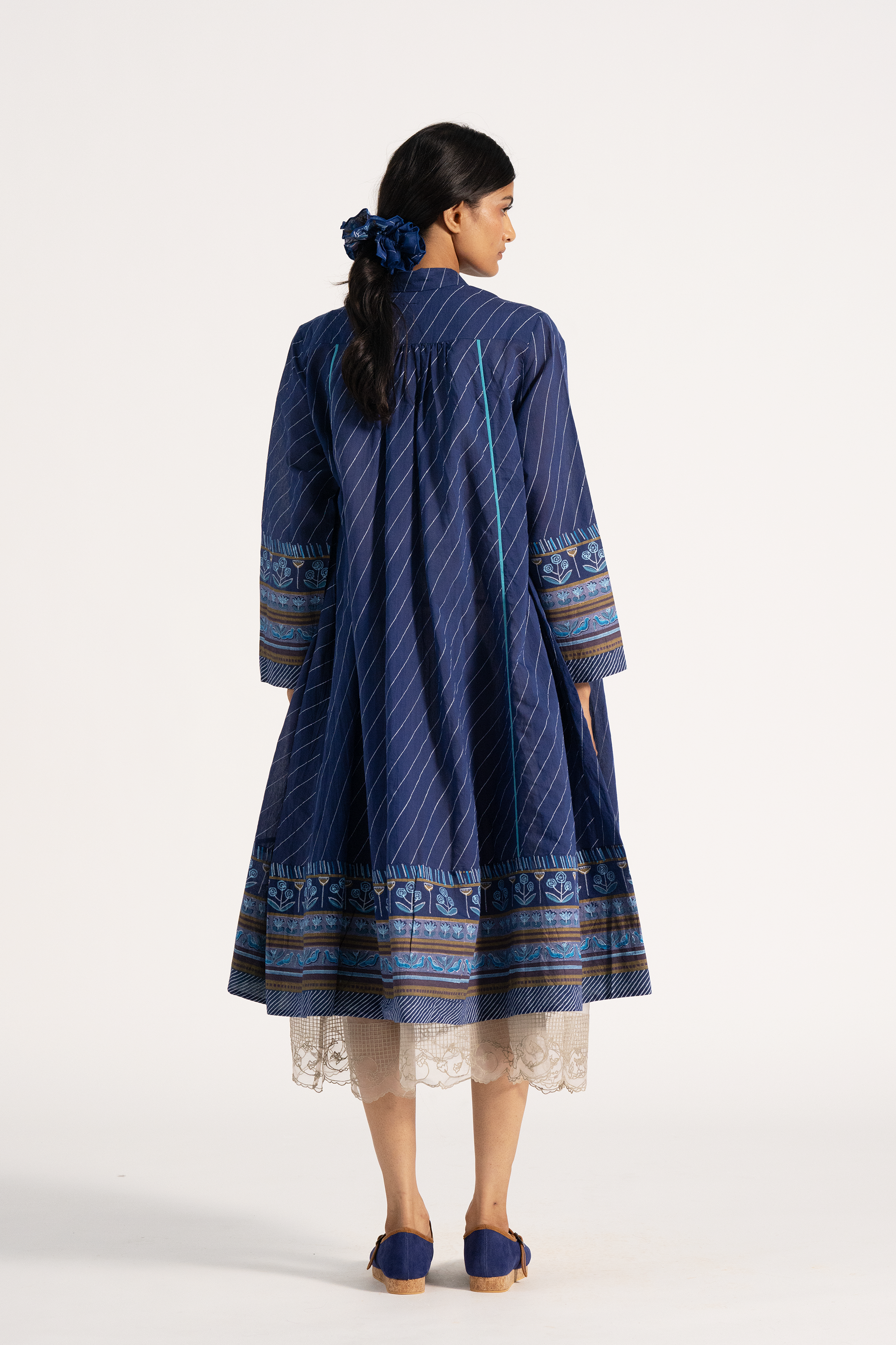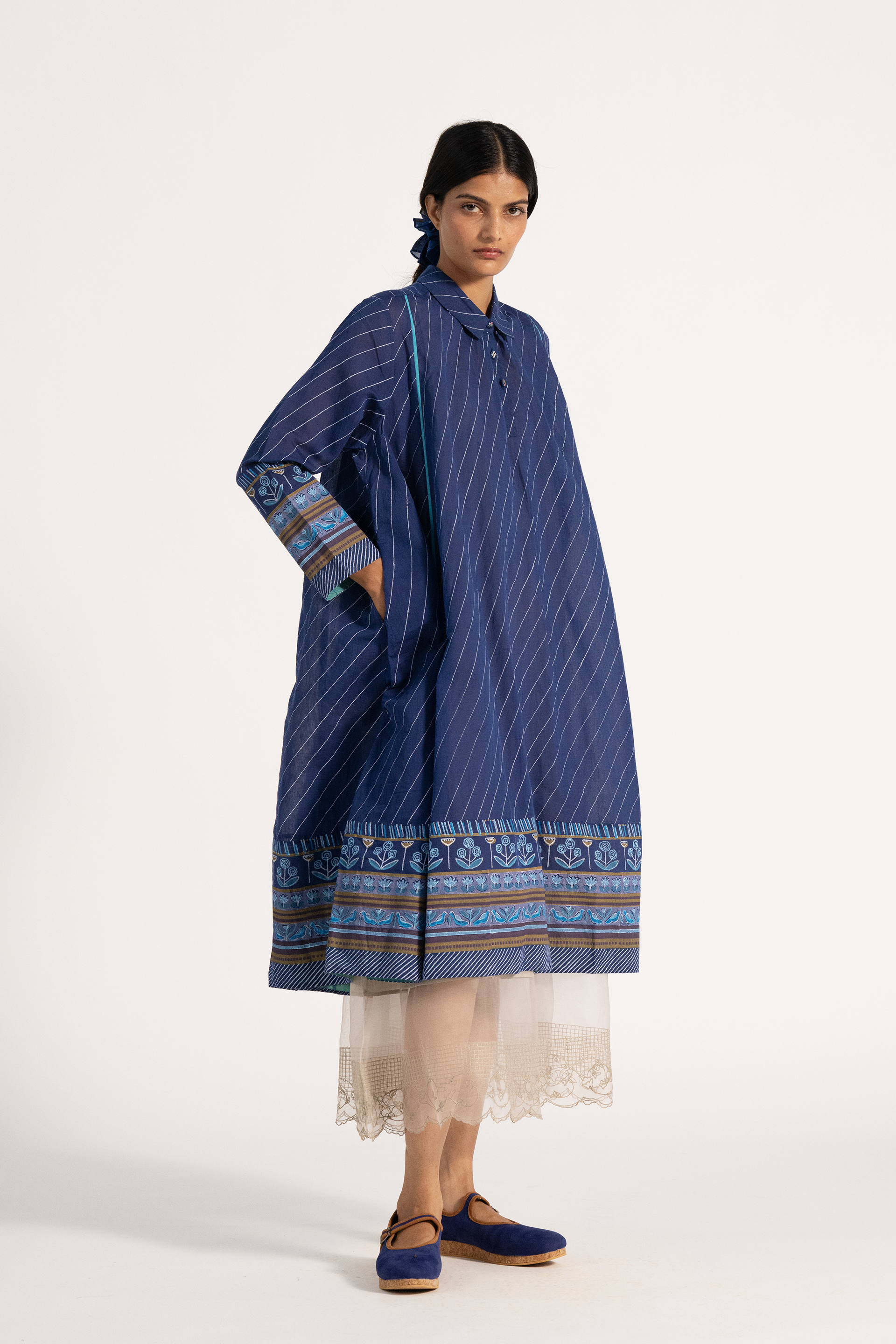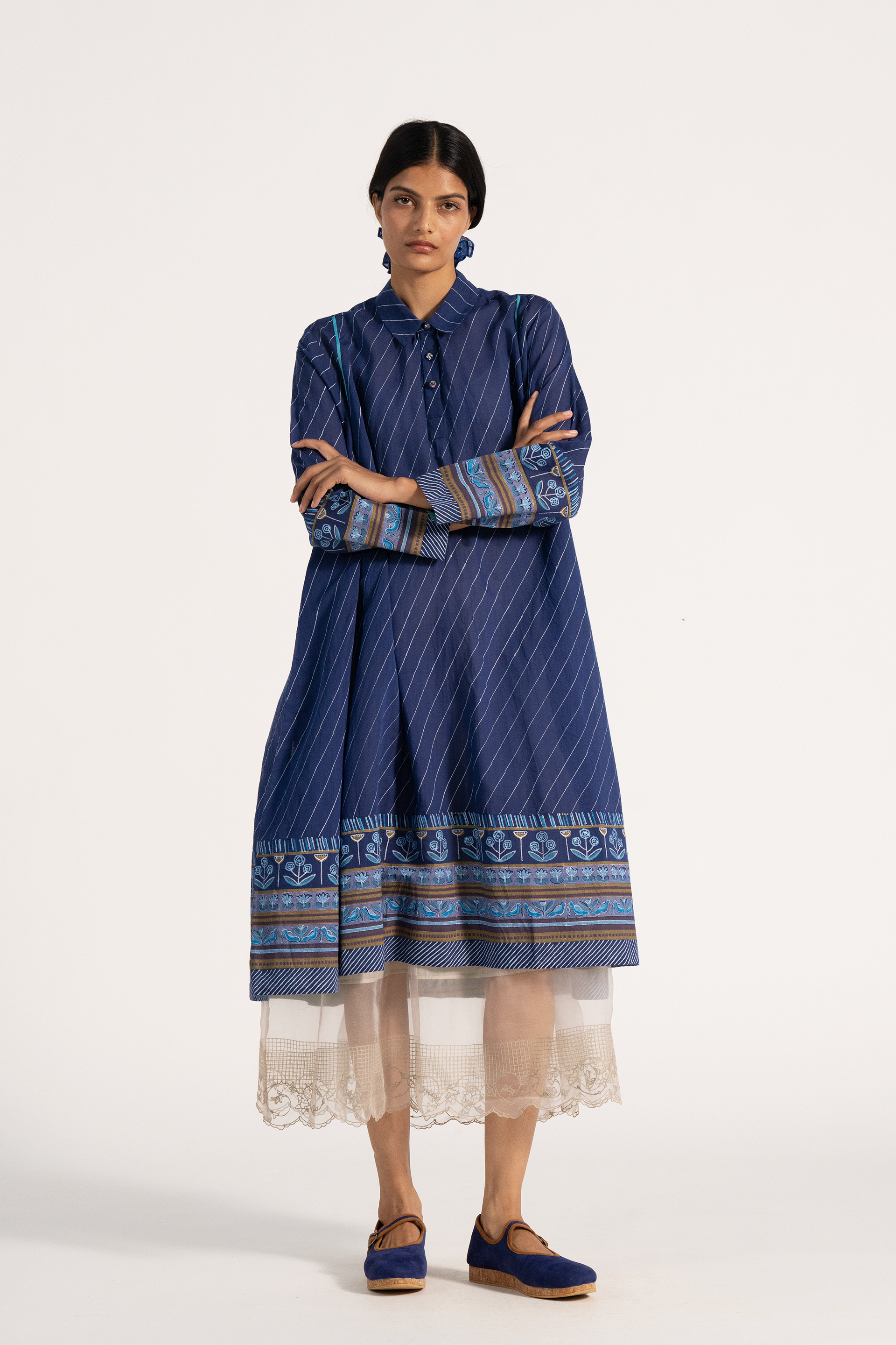 Semi fitted midi dress in cotton silk. With handblock diagonal stripes and border print and color binding in style lines.