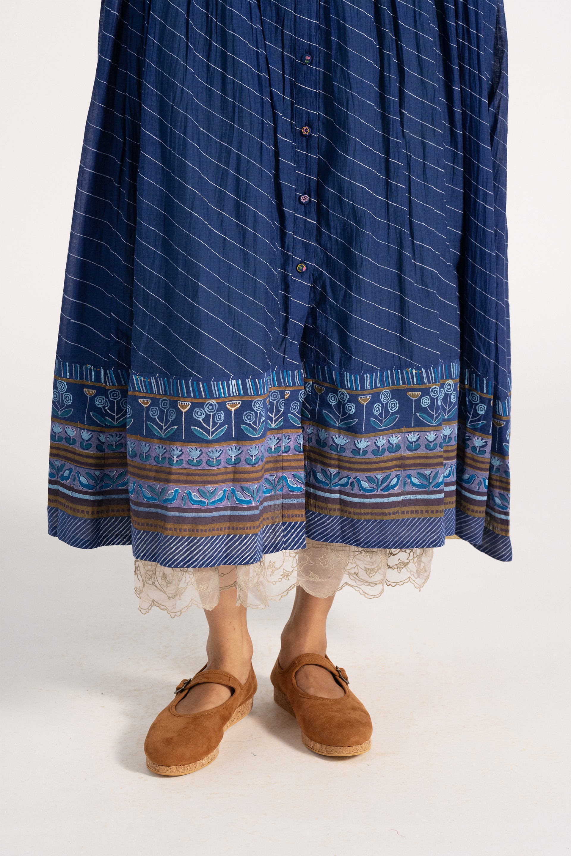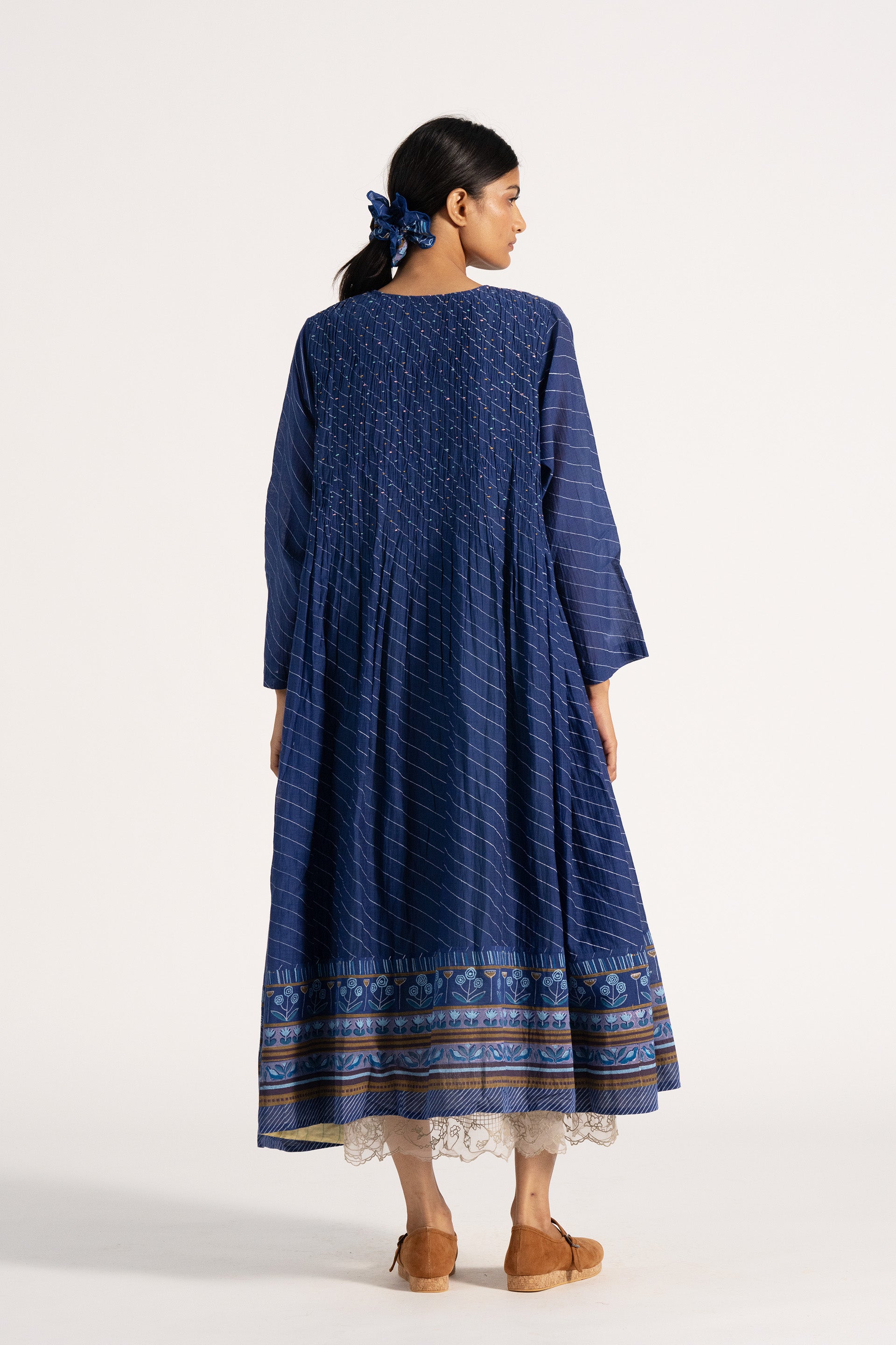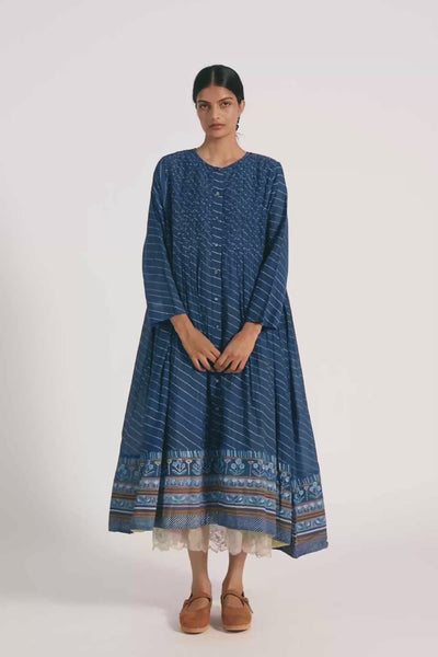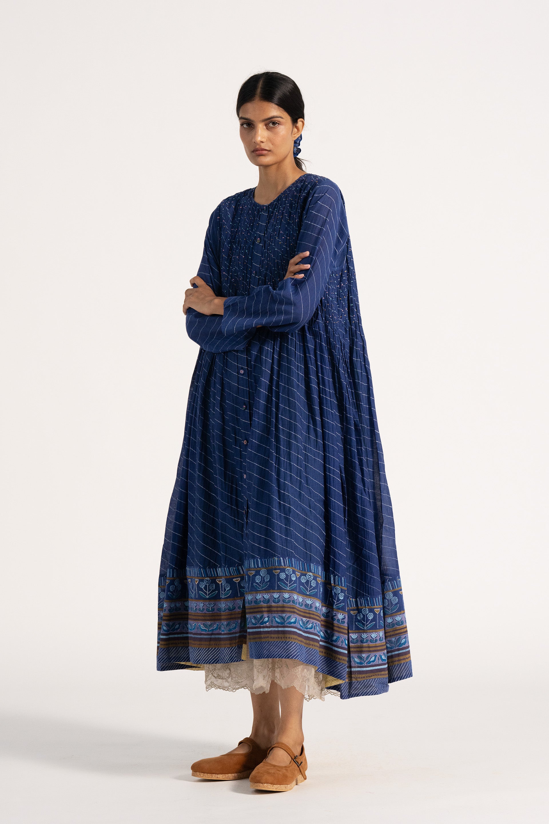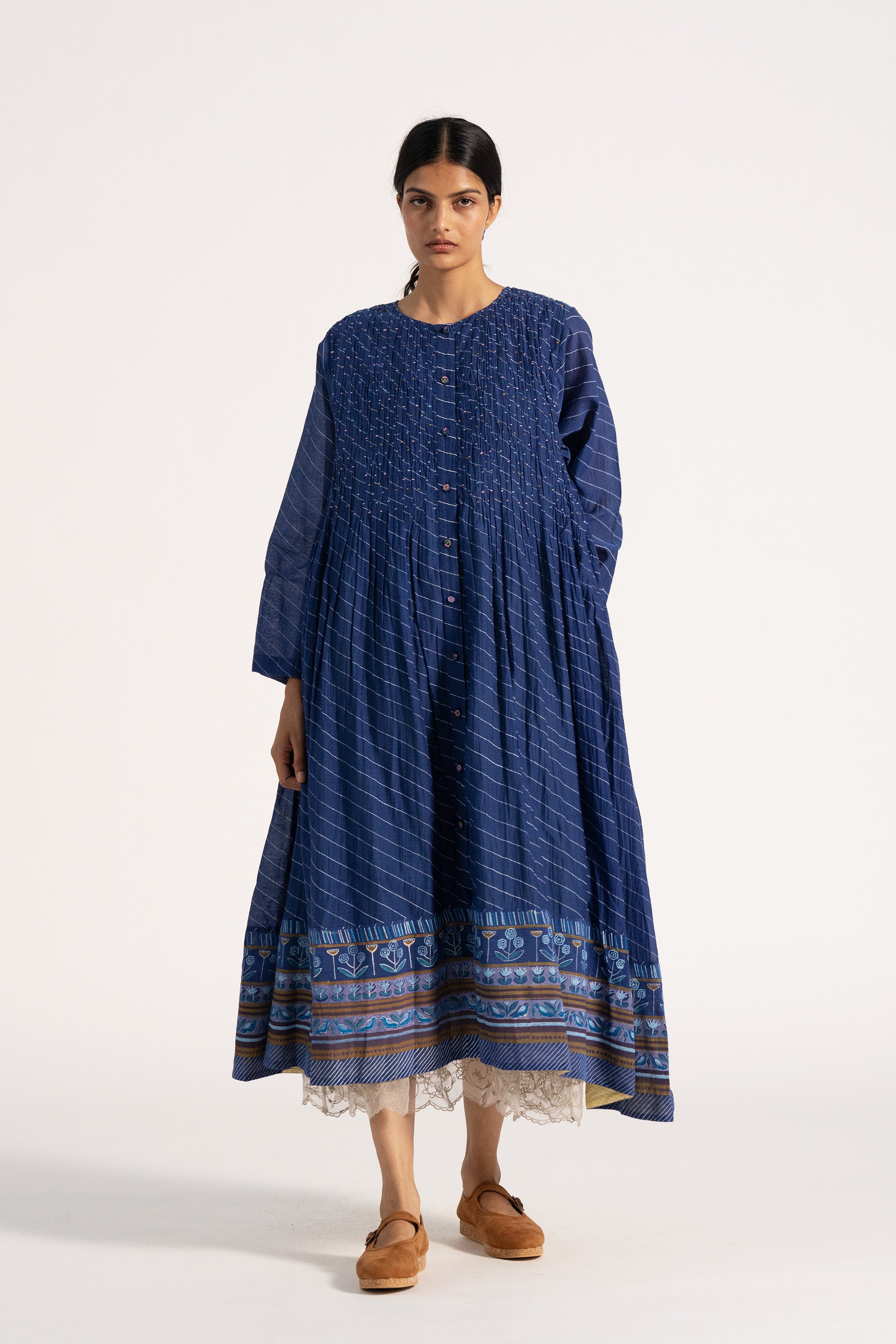 Relaxed fit button down dress in cotton silk blend with hand smocking detailing bodice.