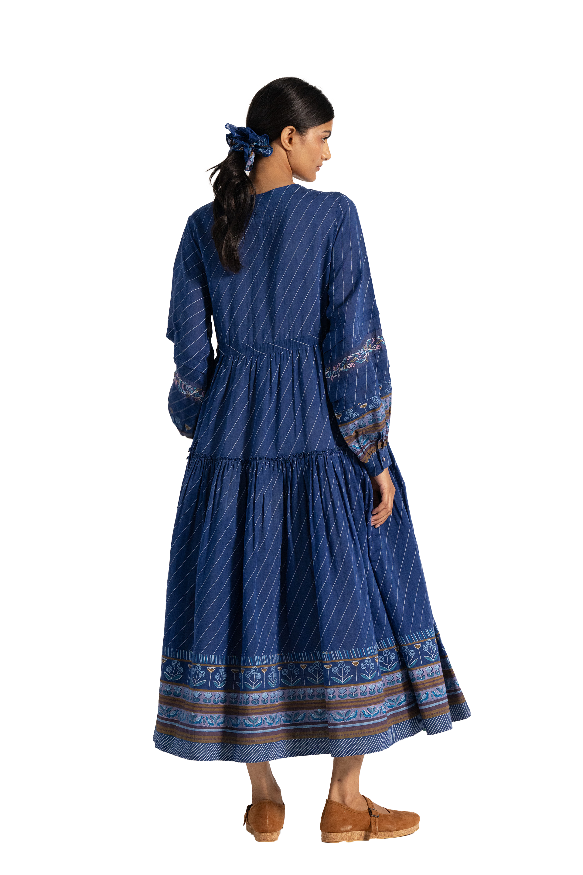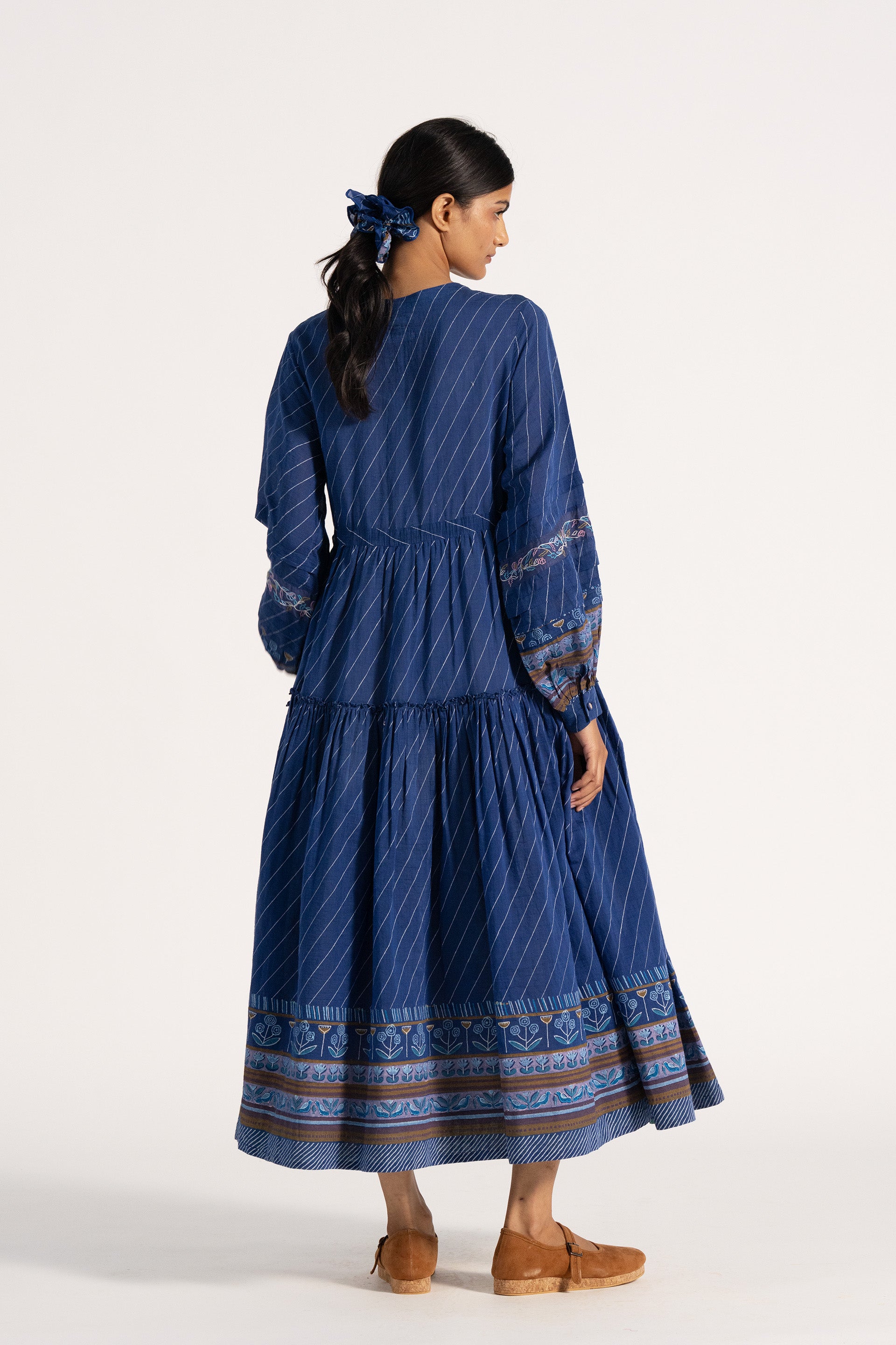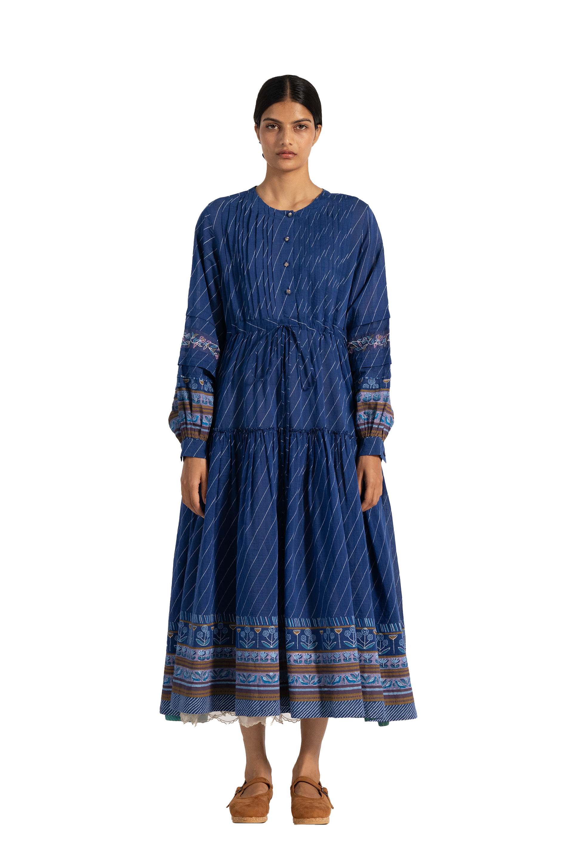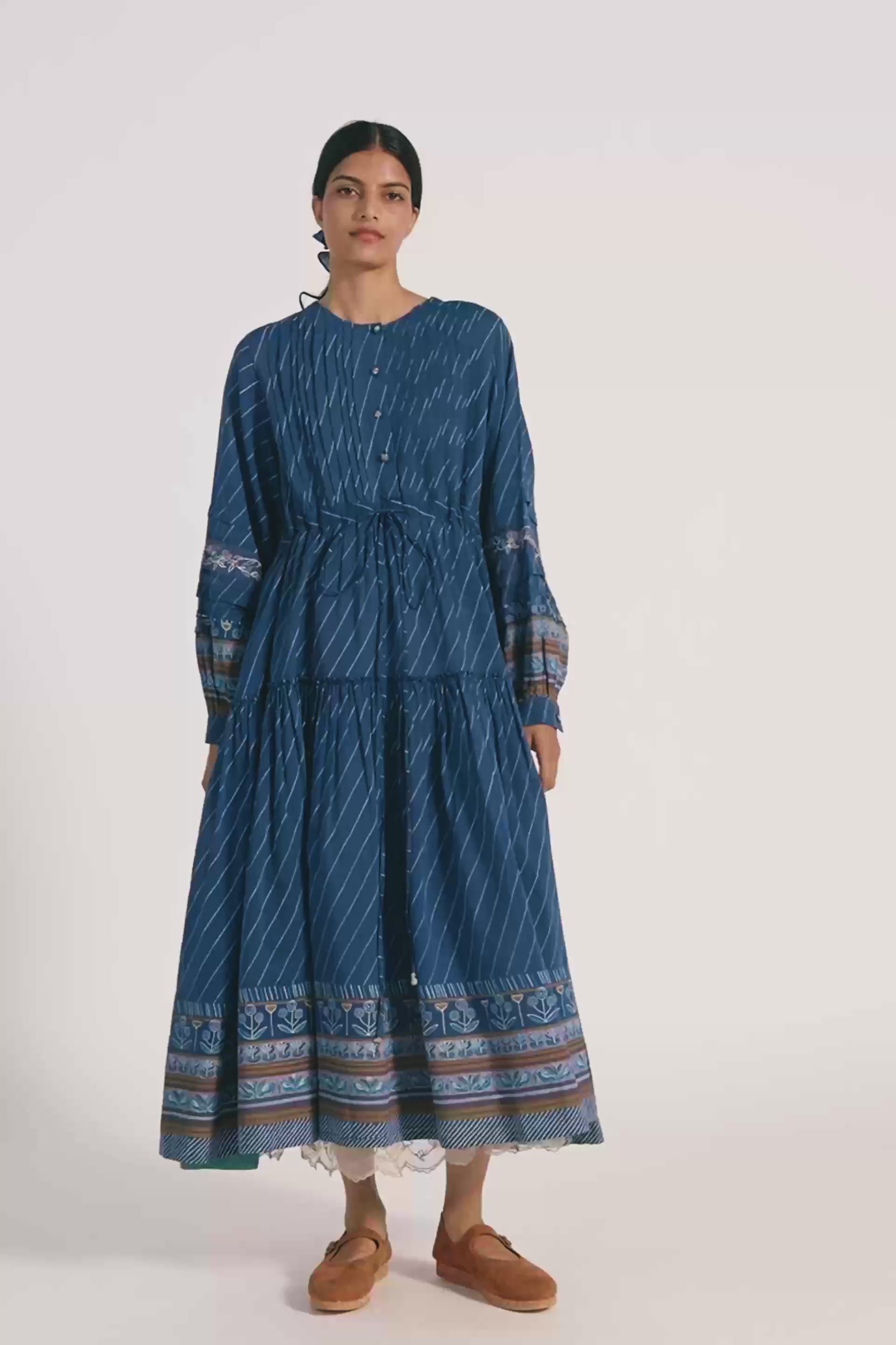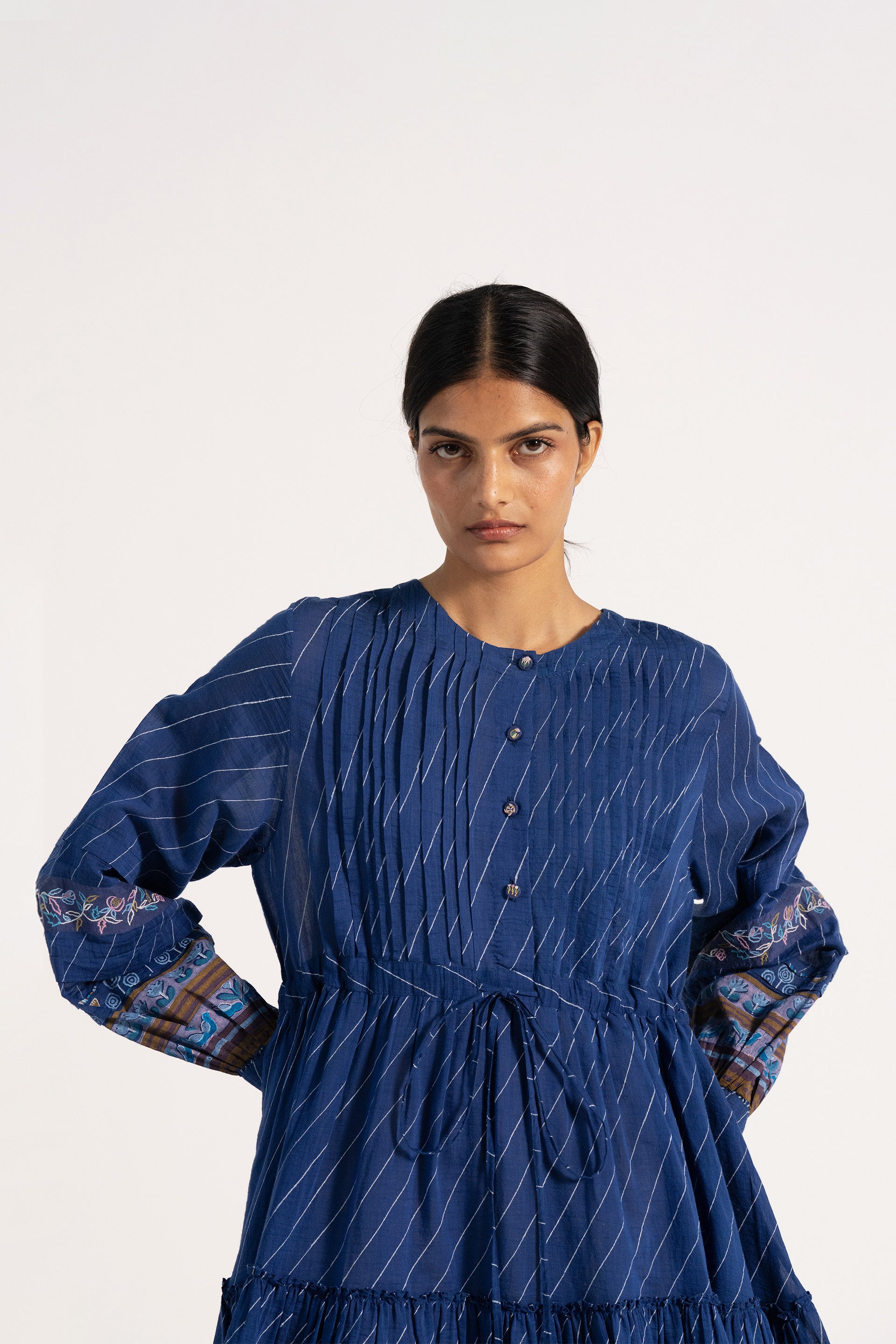 Round neck with tie up detail dress in cotton silk blend with multicolor embroidey detail on sleeve.