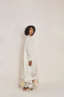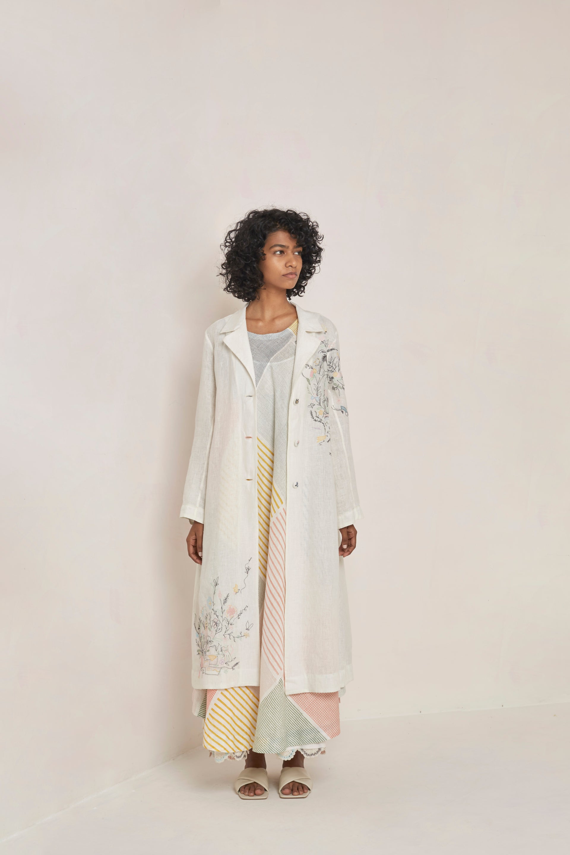 White handwoven linen long jacket with delicate engineered placement embroidery and applique work, accented with hand embroidered buttons on the placket