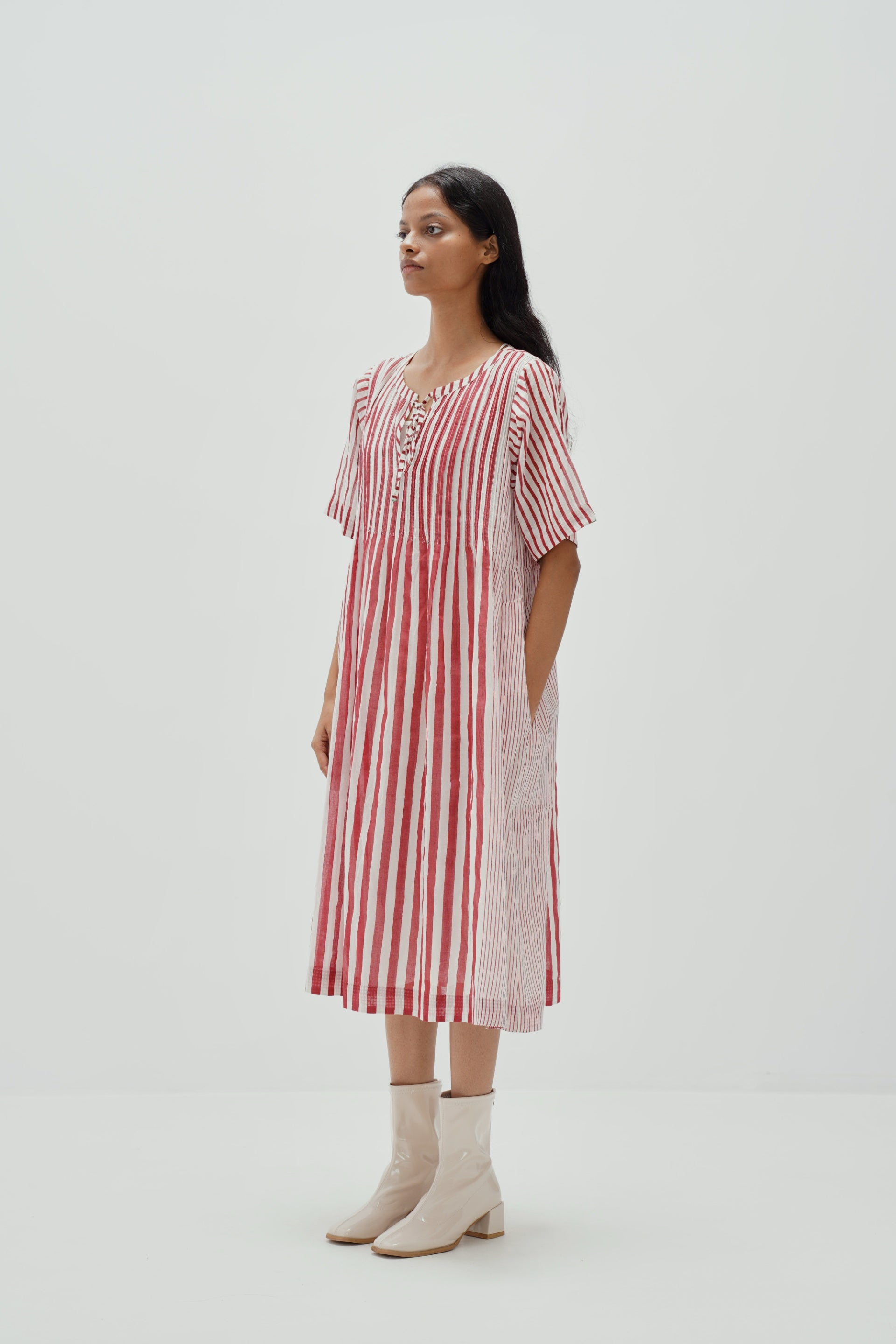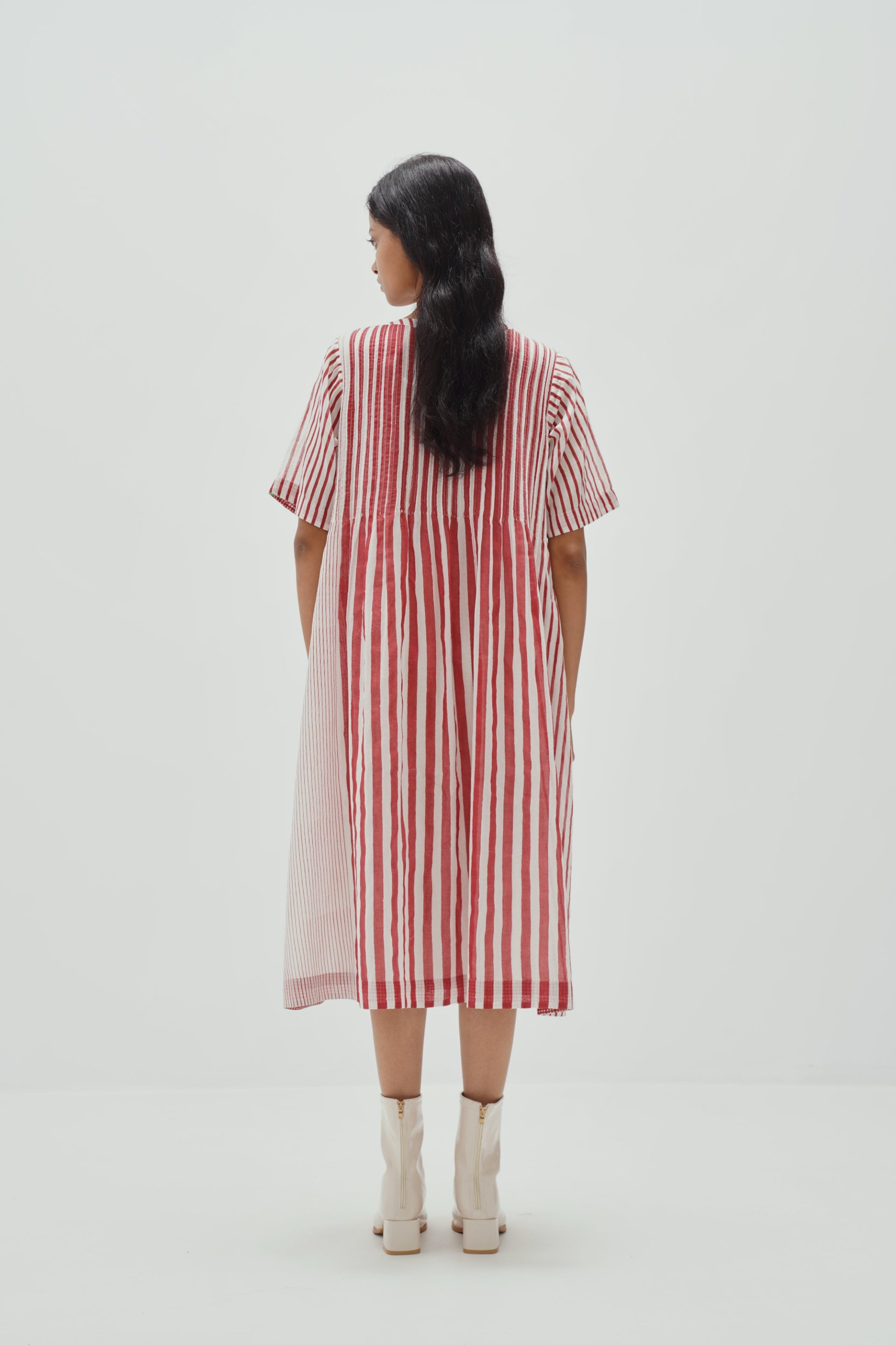 Front - tie dress with contrast stripes all over and pintucks on front and back