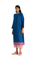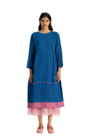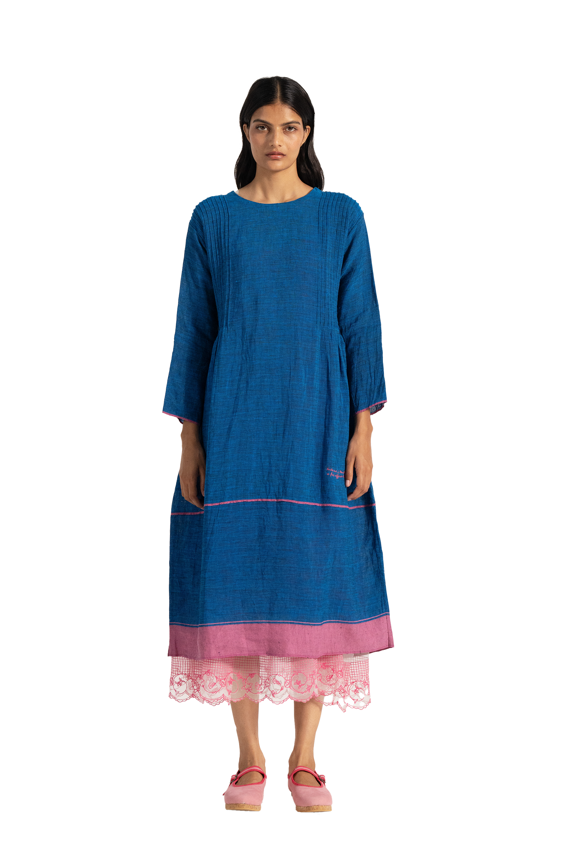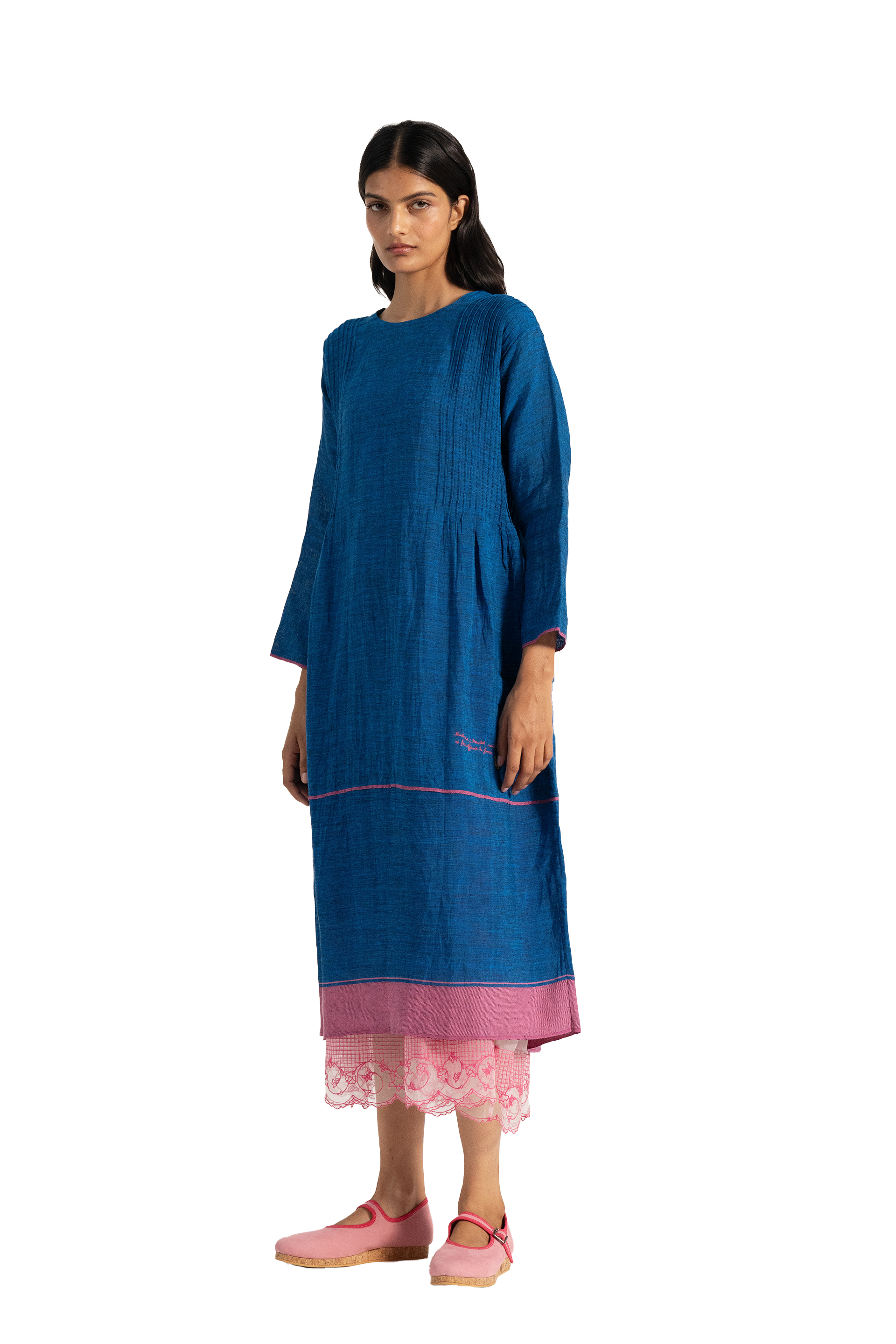 Round neck full sleeved midi dress in 100% linen. With pin tucks on side, contrast selvedge and border detail across hem and sleeves.
