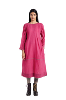A - line dress in 100% merino wool with pintucks and contrast selvedge detail on hem and placket.