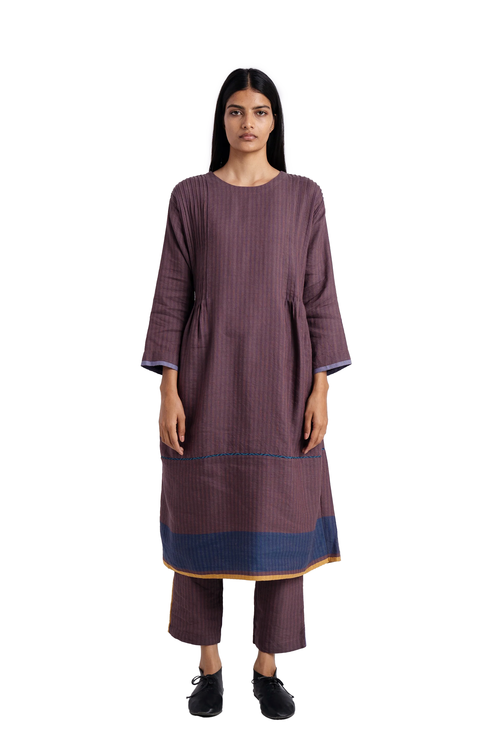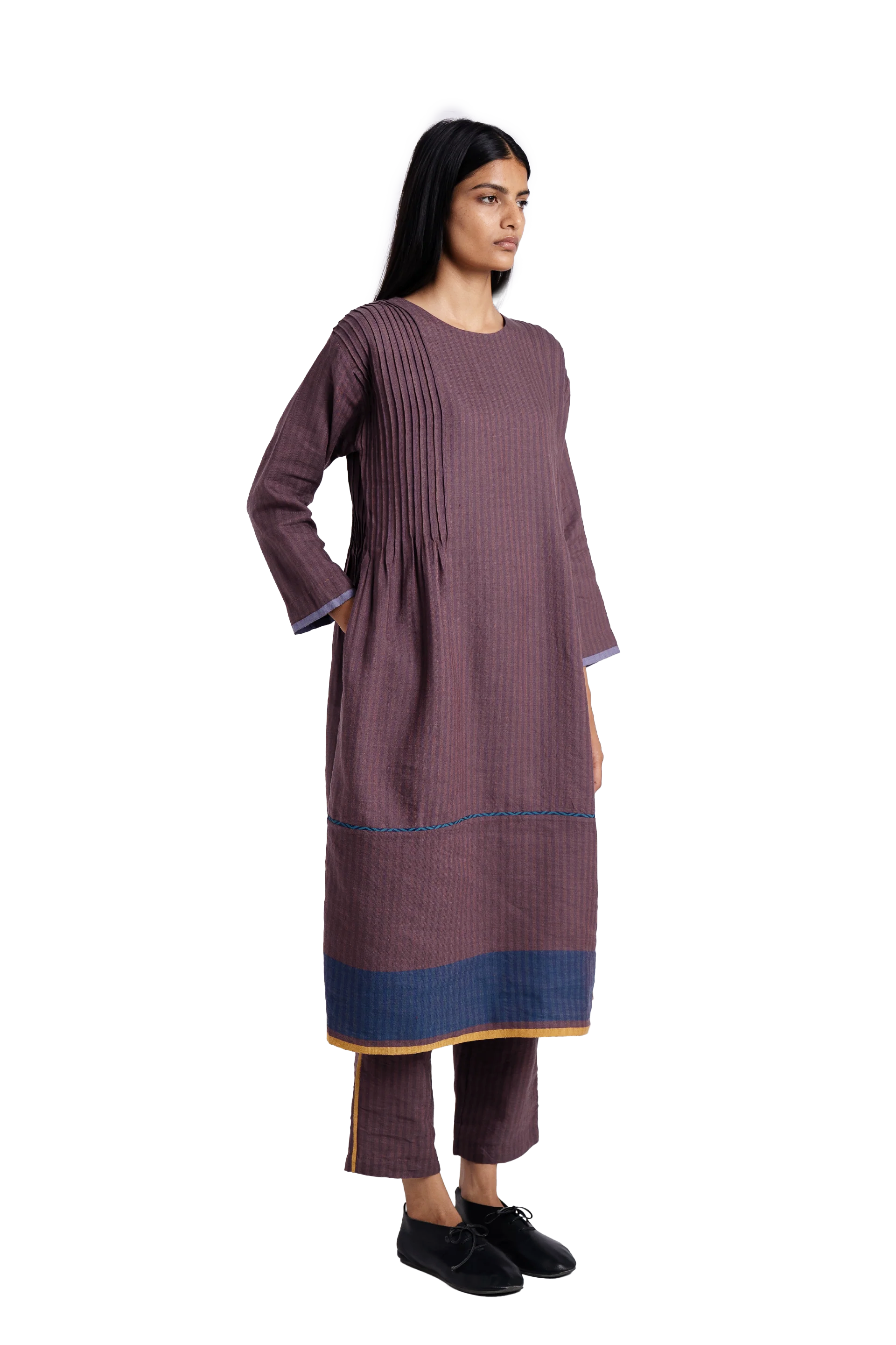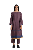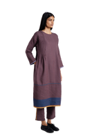 A - line dress in wool linen with pintucks and contrast selvedge detail on hem and placket.Comes with straight fit trouser .