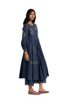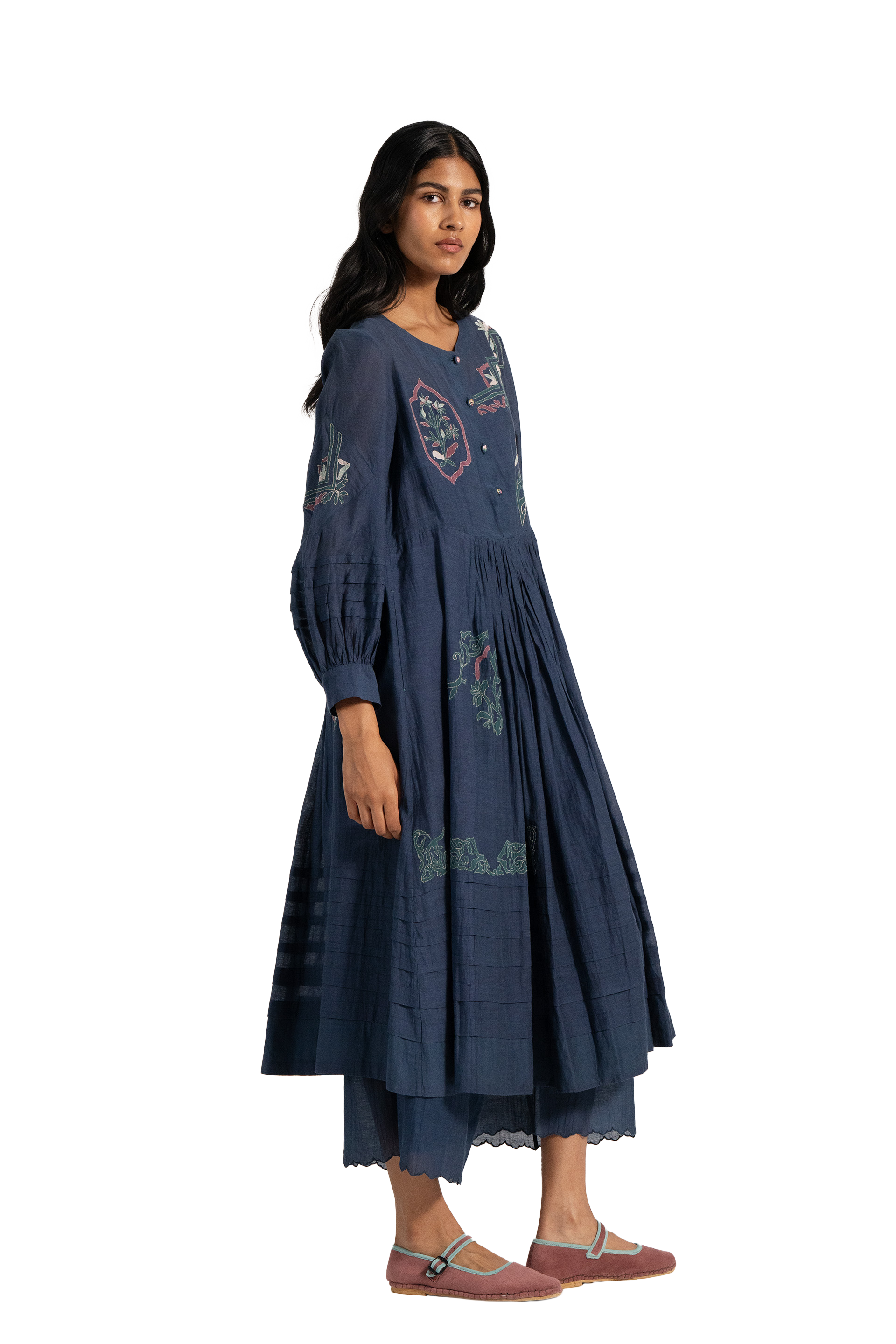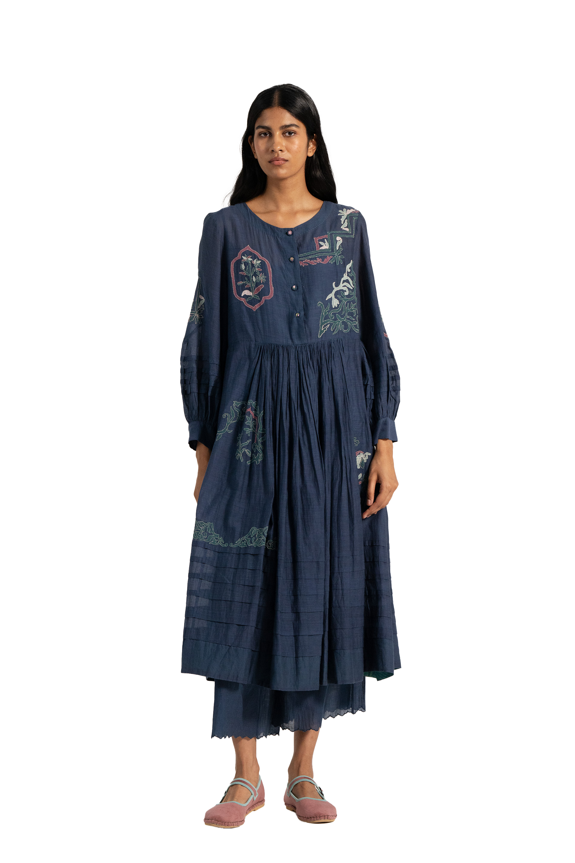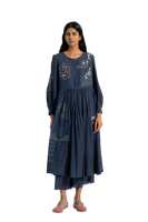 Round neck midi dress with applique detail on hem and puff sleeves in cotton silk blend.