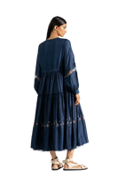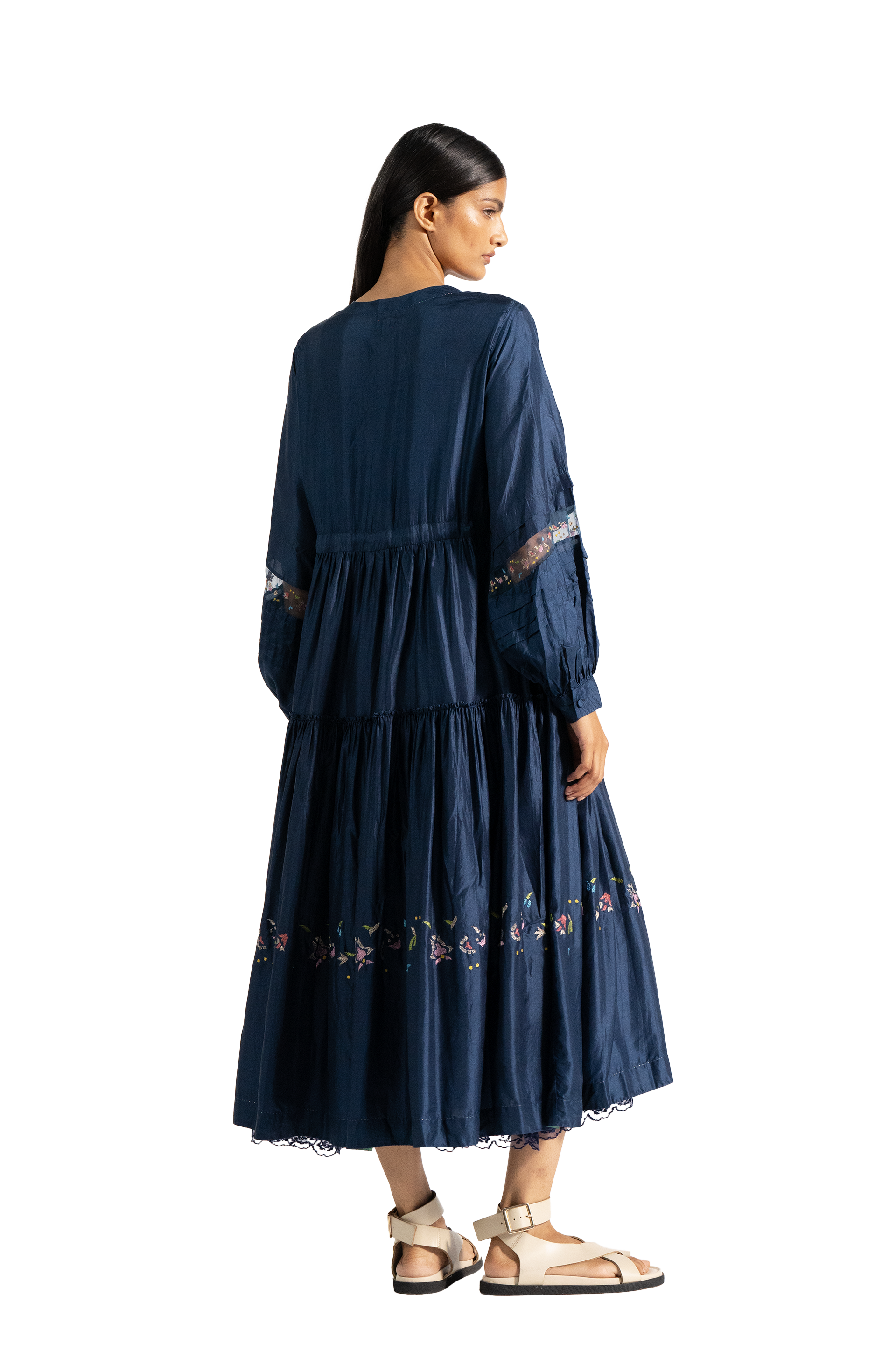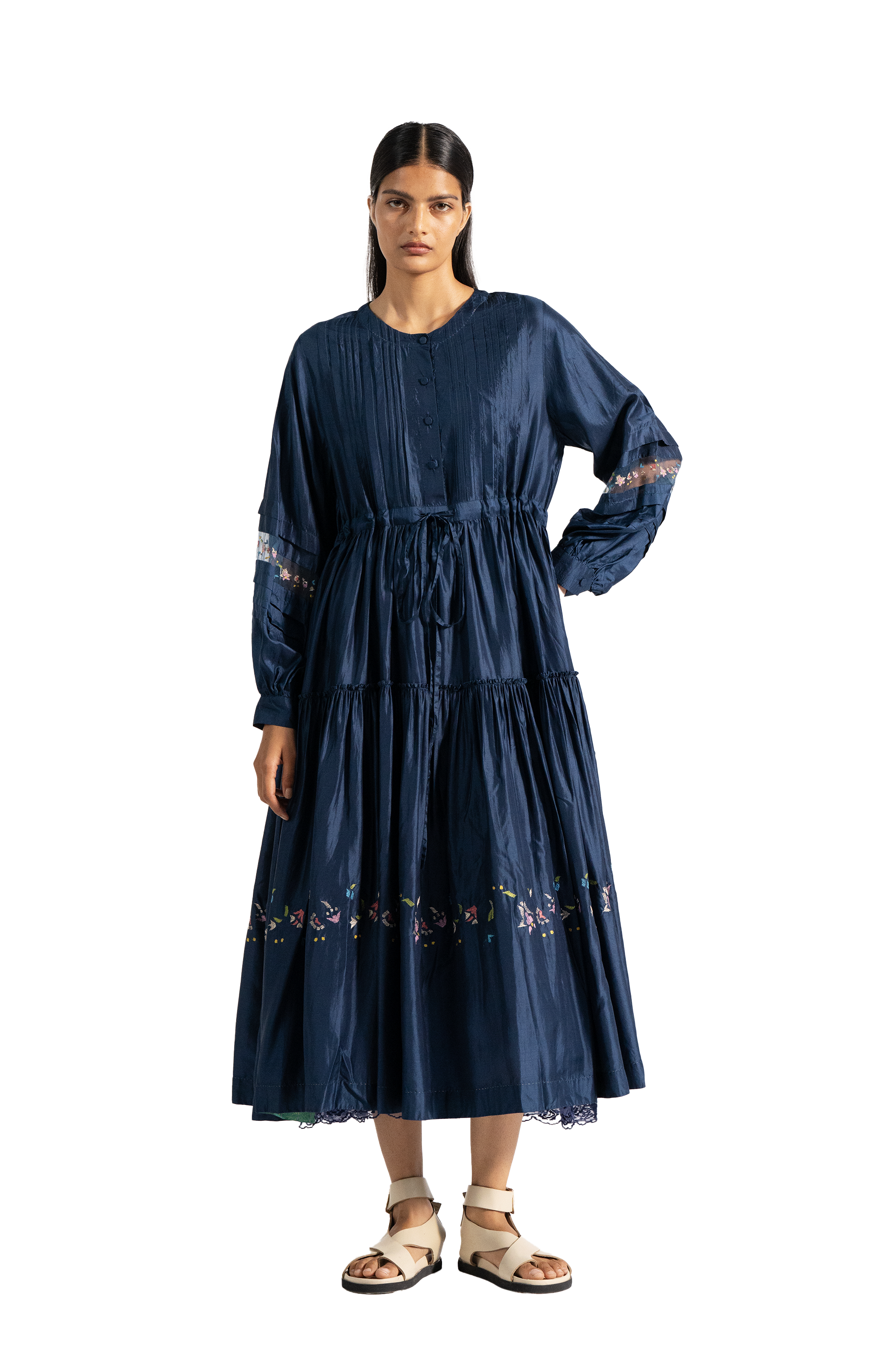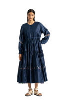 Round neck with tie up detail dress in silk blend with multicolor embroidery detail on sleeve and hem.