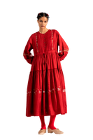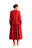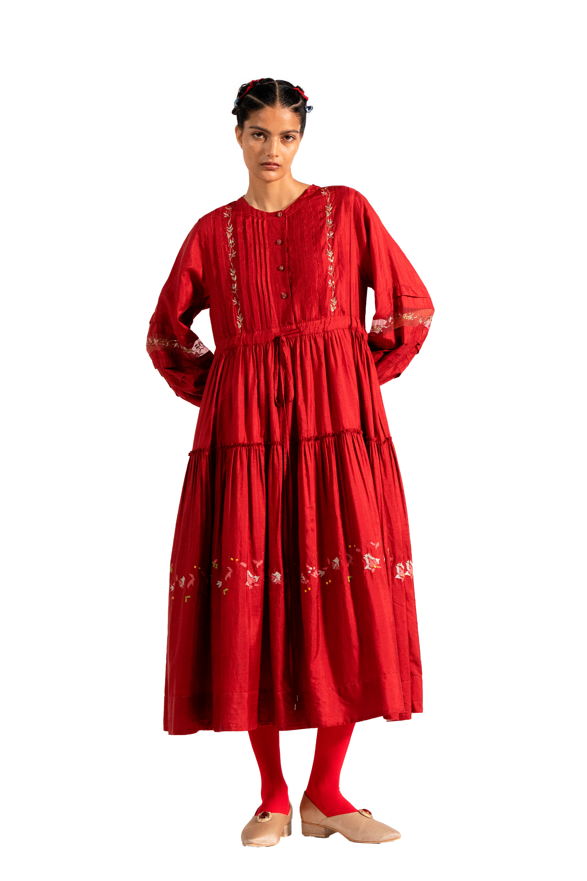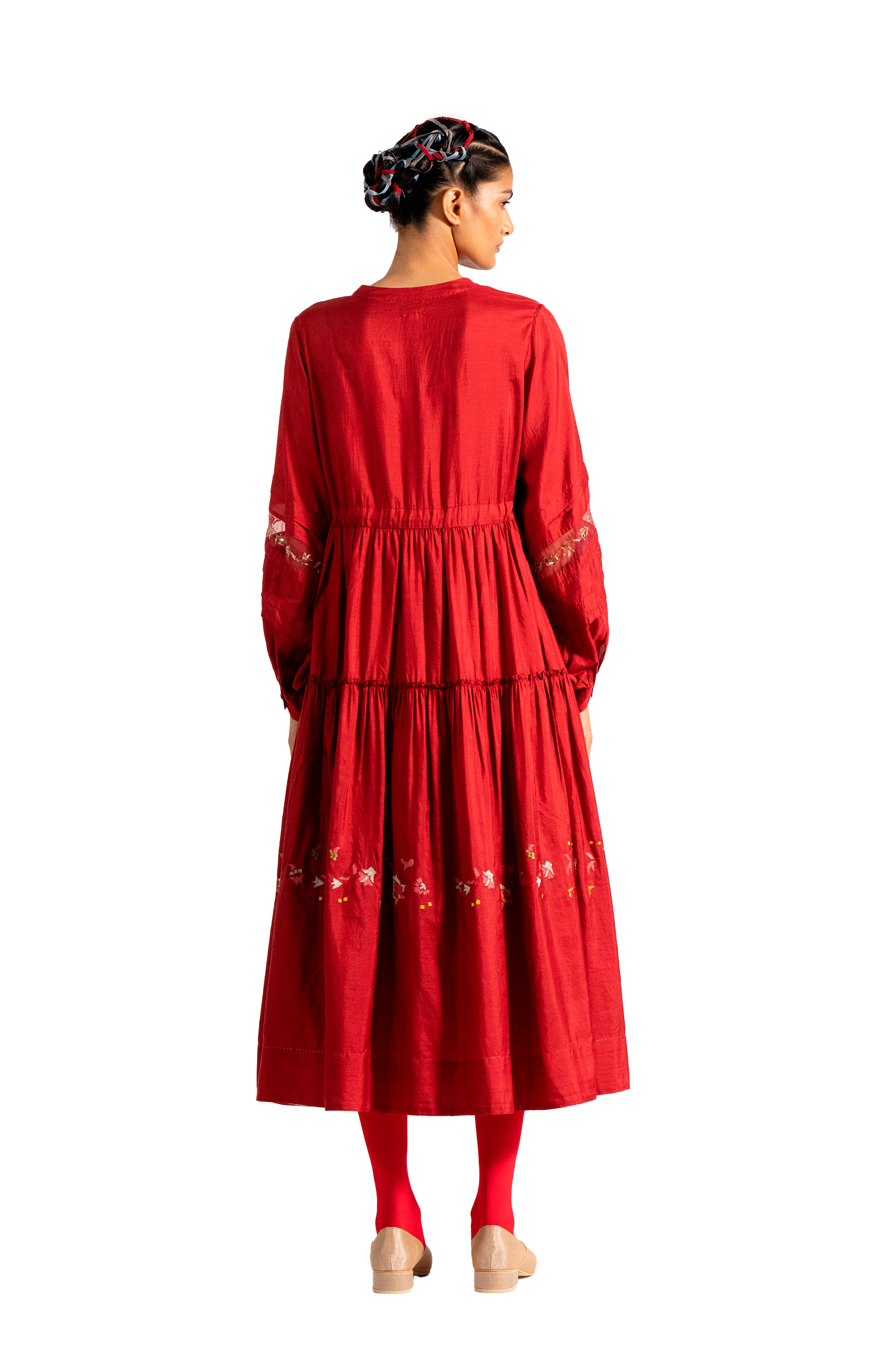 Round neck with tie up detail dress in silk blend with multicolor embroidery detail on sleeve, front and hem.