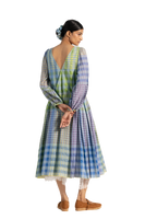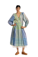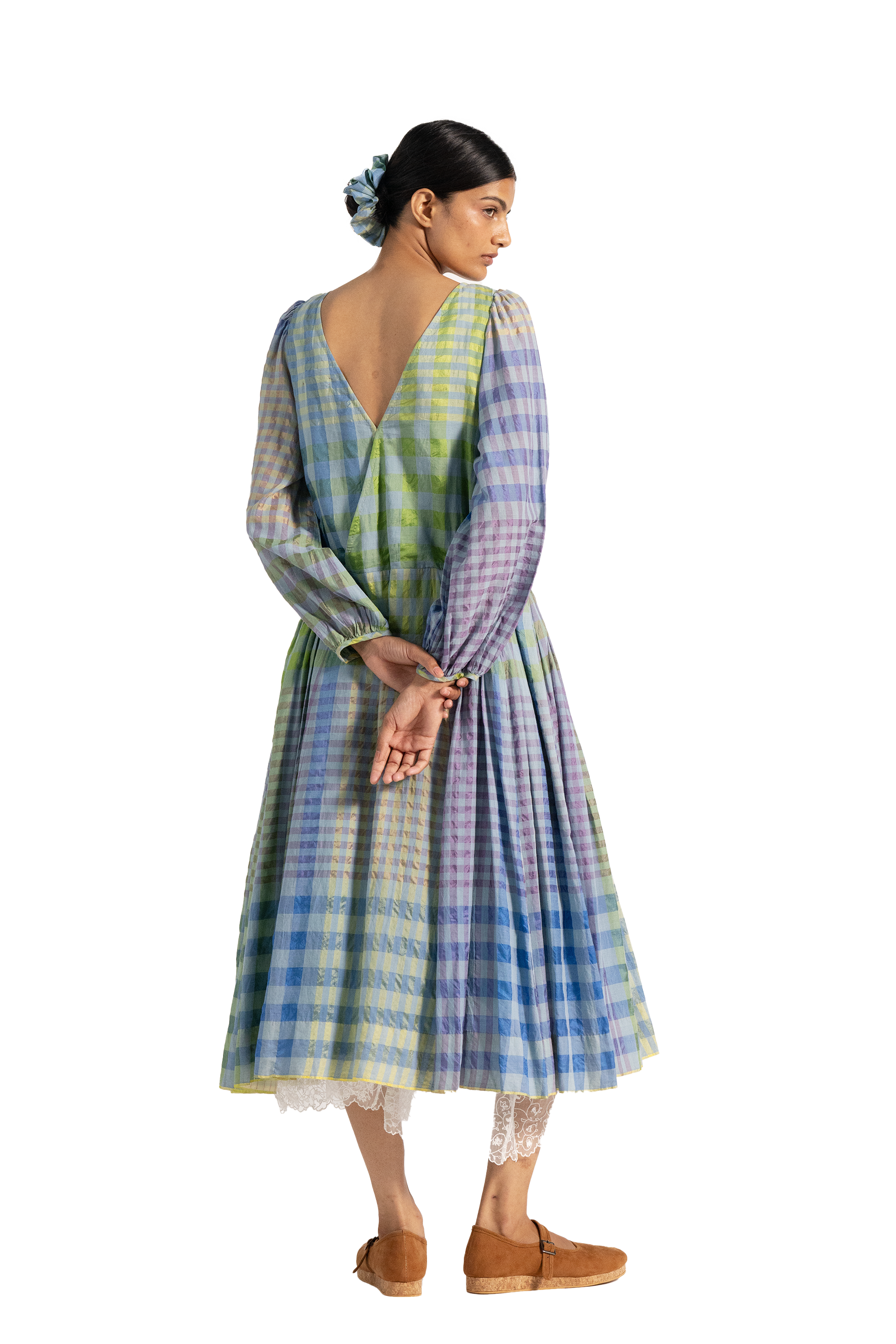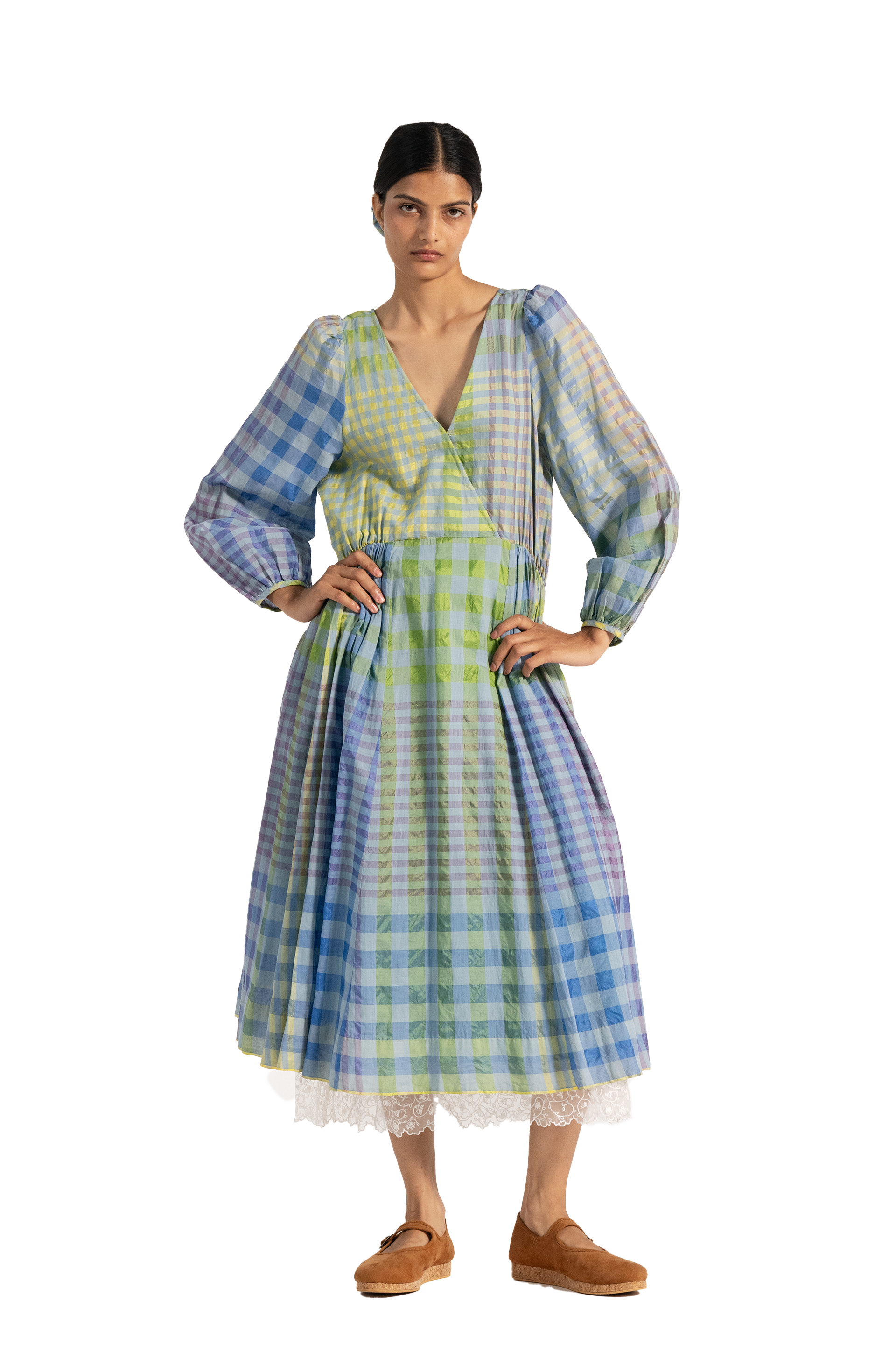 Multicolor checkered wrapped v neckline midi dress in cotton silk blend. With gathers and puff sleeves.
