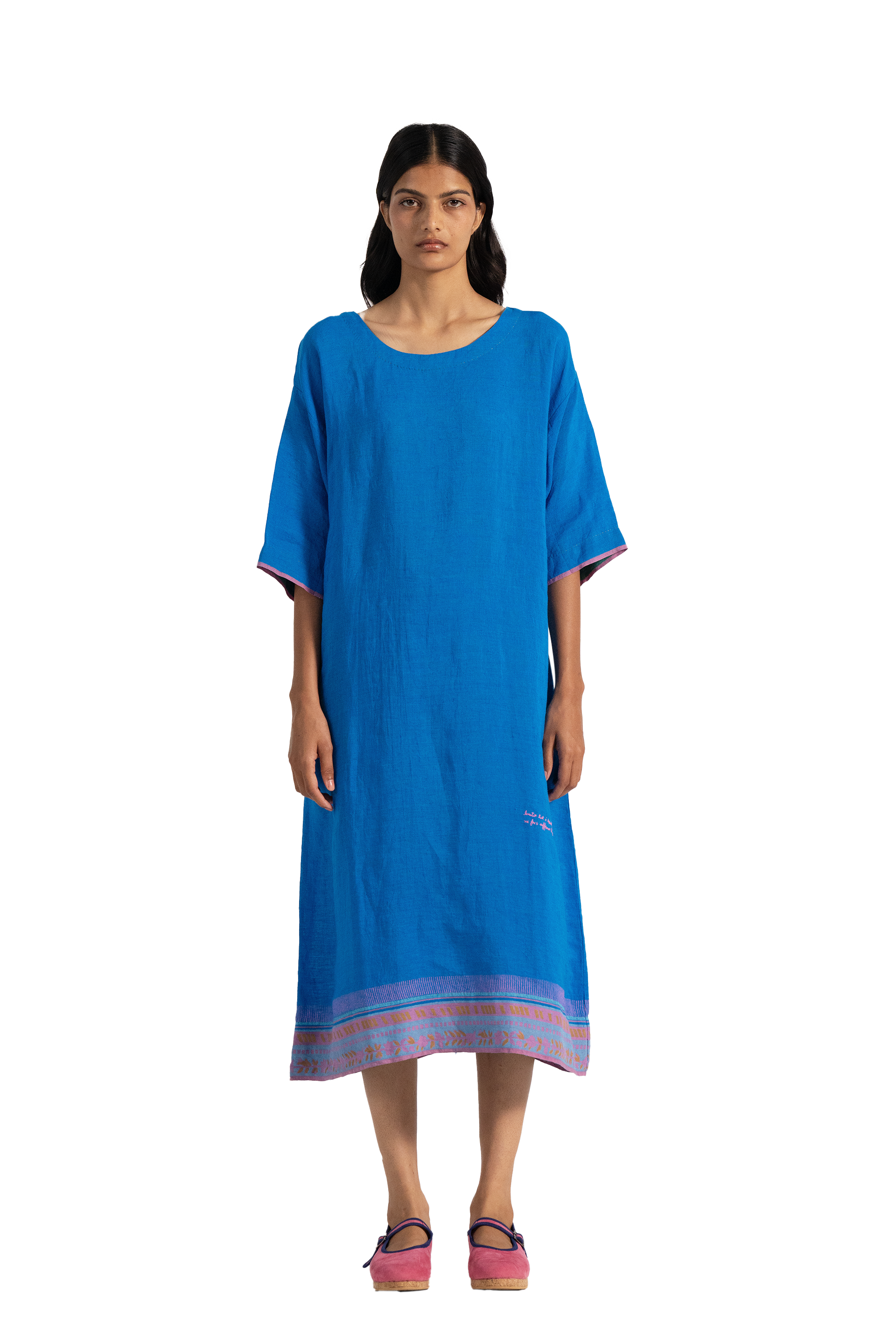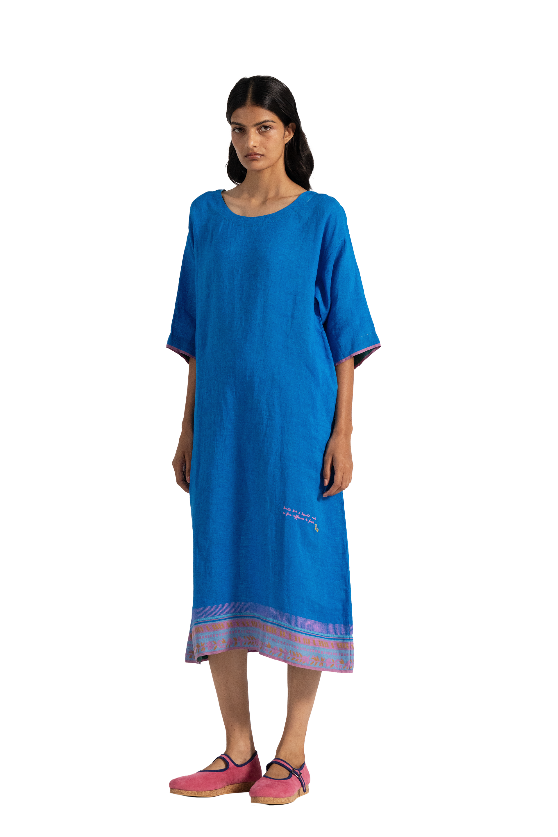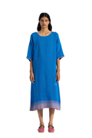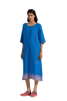 Vibrant blue relaxed fit tunic dress in 100% linen with multicolor handblock print bordered and text print hand embroidery on the side.