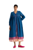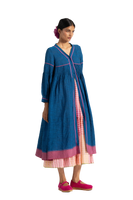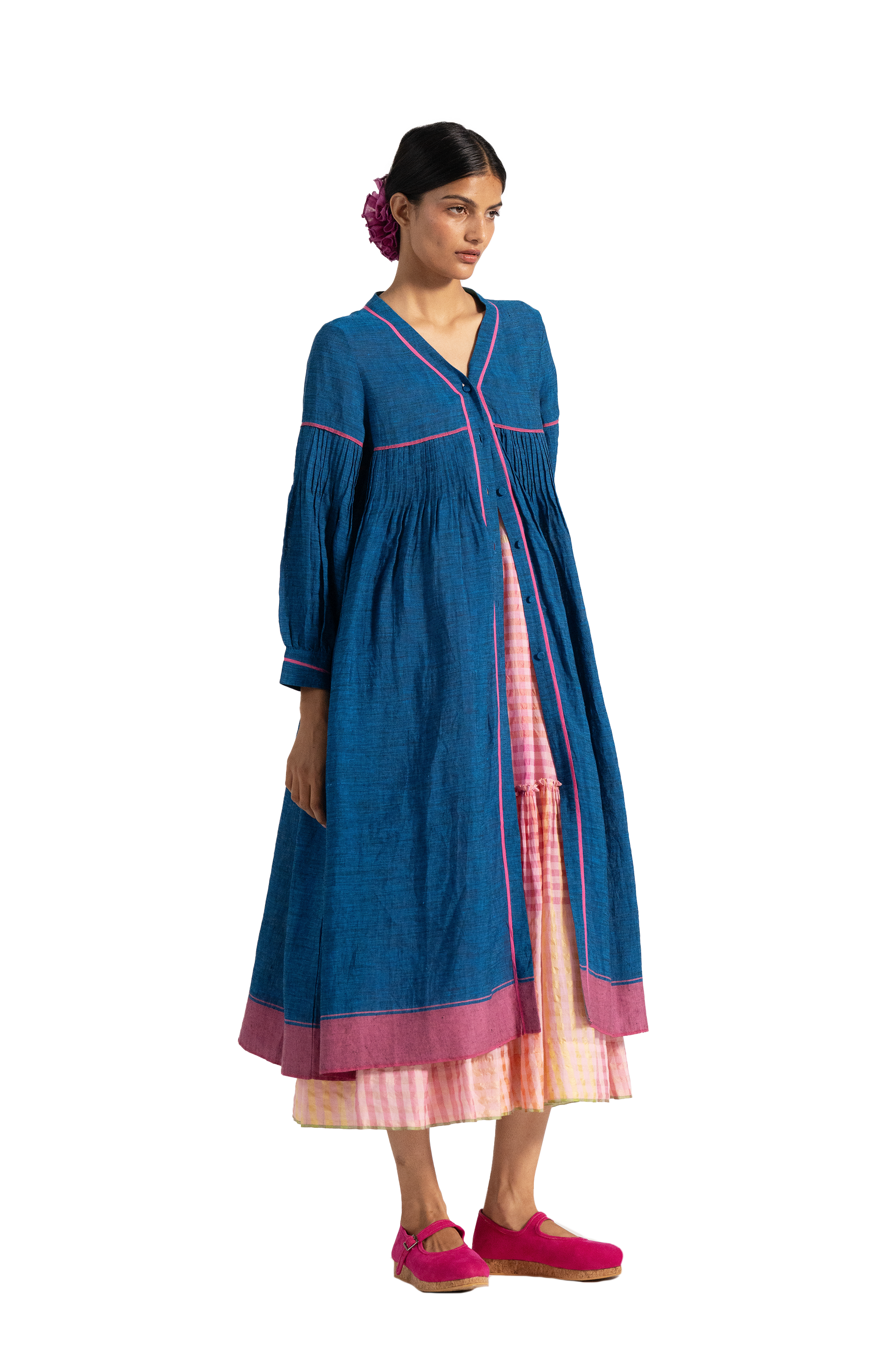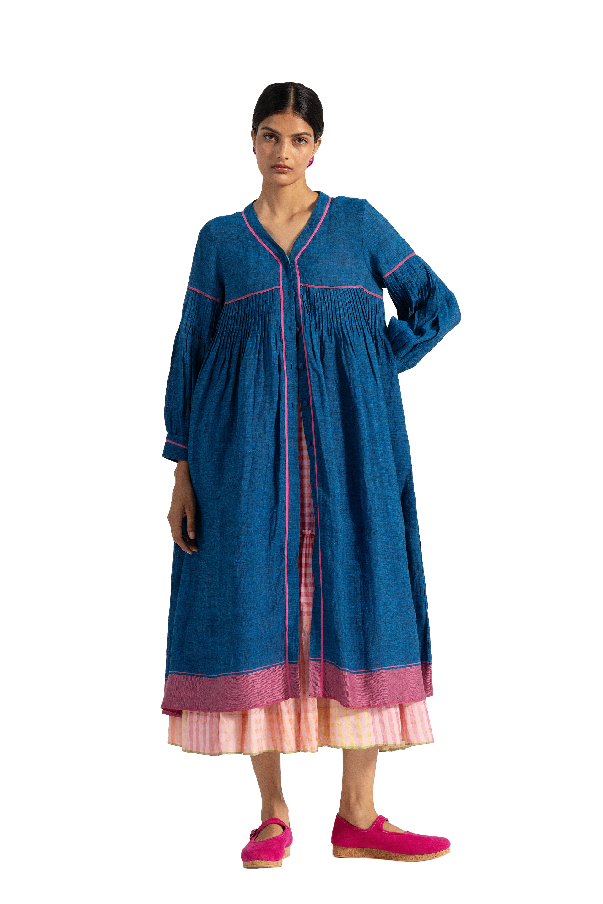 V neck button down dress in 100% linen. With all over pin tuck detail on bodice and contast selvedge detail.