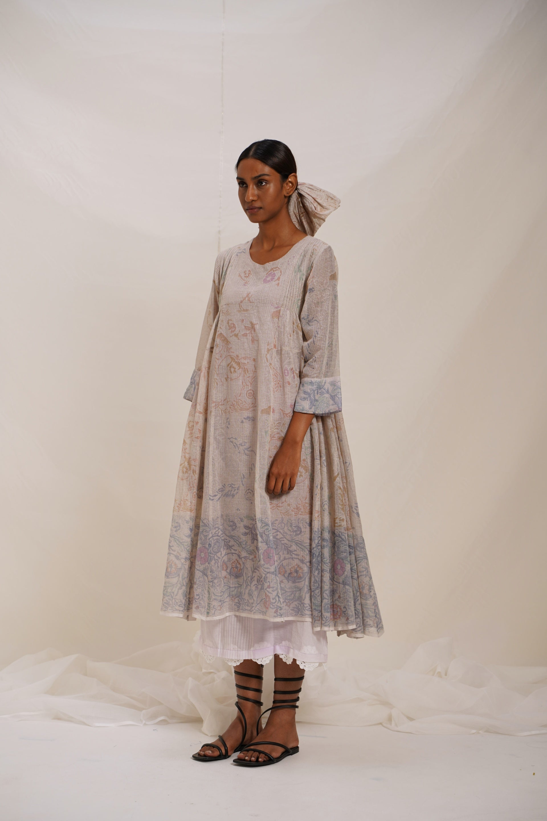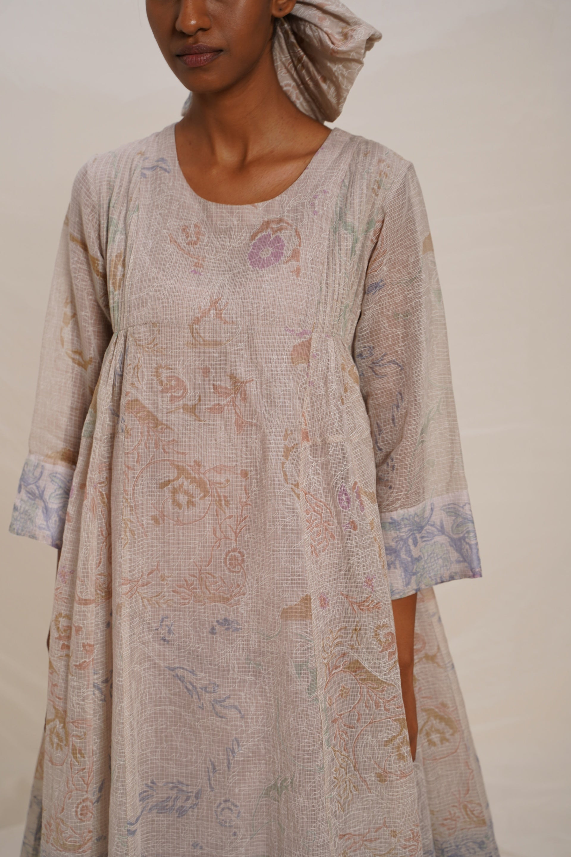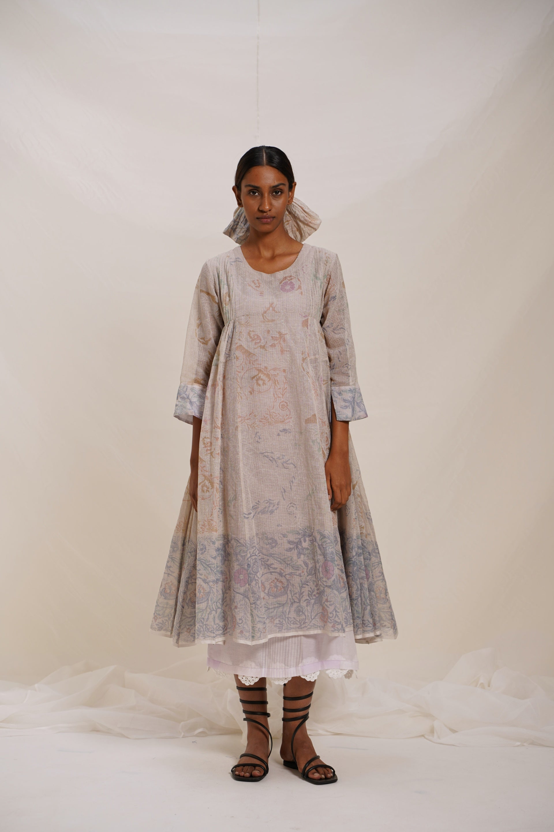 Traditional craftsmanship with this paneled midi dress, featuring an all-over hand block floral print and the airy charm of hand-woven kota doriya fabric. The print features delicate floral motifs, each carefully placed to create a harmonious pattern that flows beautifully across the dress with 12 blocks on top and 16 blocks on bottom. A princess seam and subtle pin tucks on the sides, enhancing the silhouette and providing a comfortable fit. Comes with an attached printed text lining.