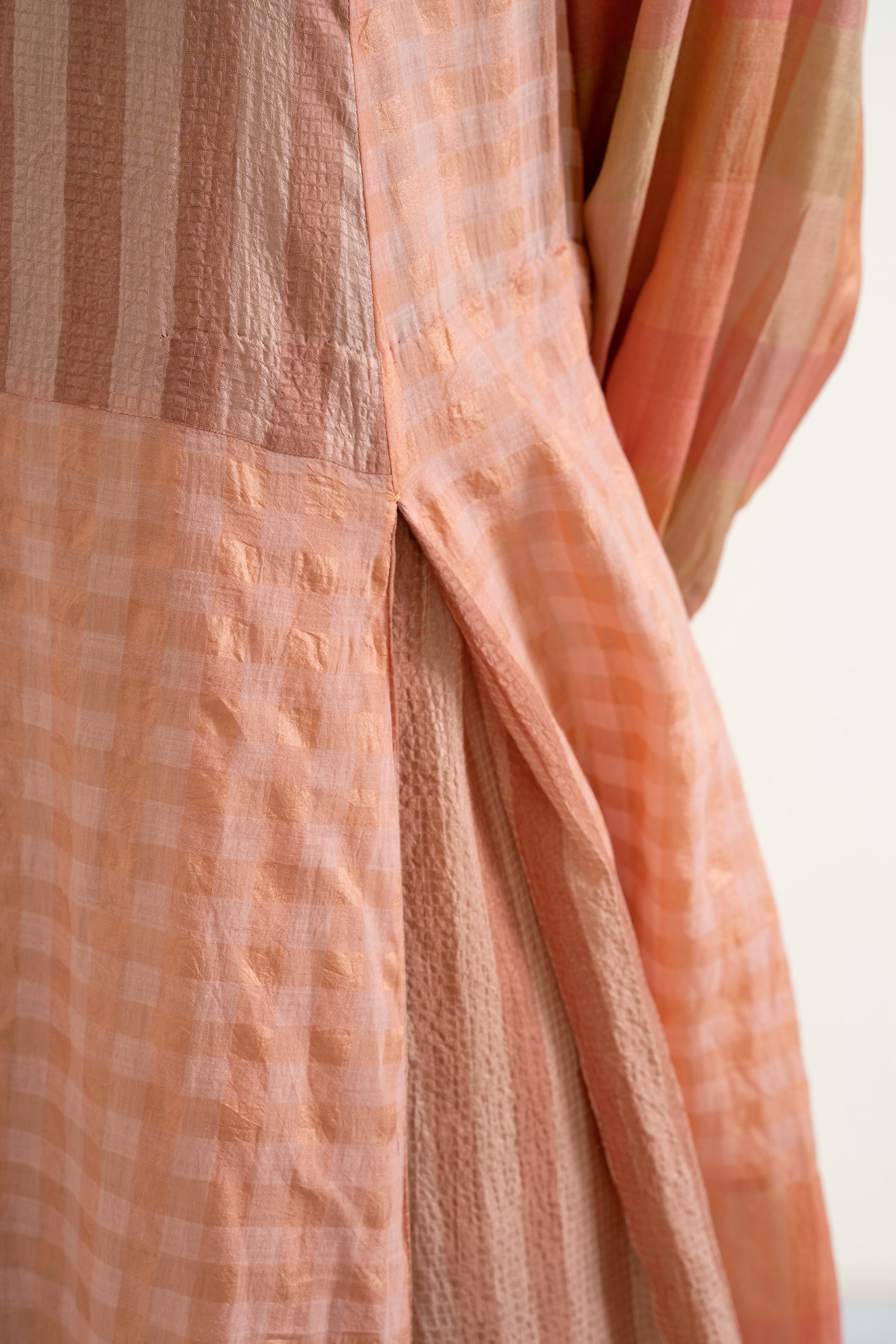Round-neck dress featuring patchwork in 100% silk with stripes and handwoven self-checked cotton silk
