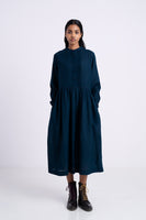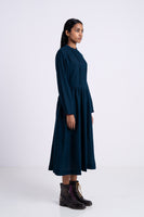 SILK DRESS WITH BAND COLLAR, HALF PLACKETS AND PIN TUCKS ON BODICE WITH GATHERED WAIST AND HAND EMBROIDERED BUTTONS