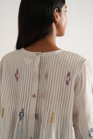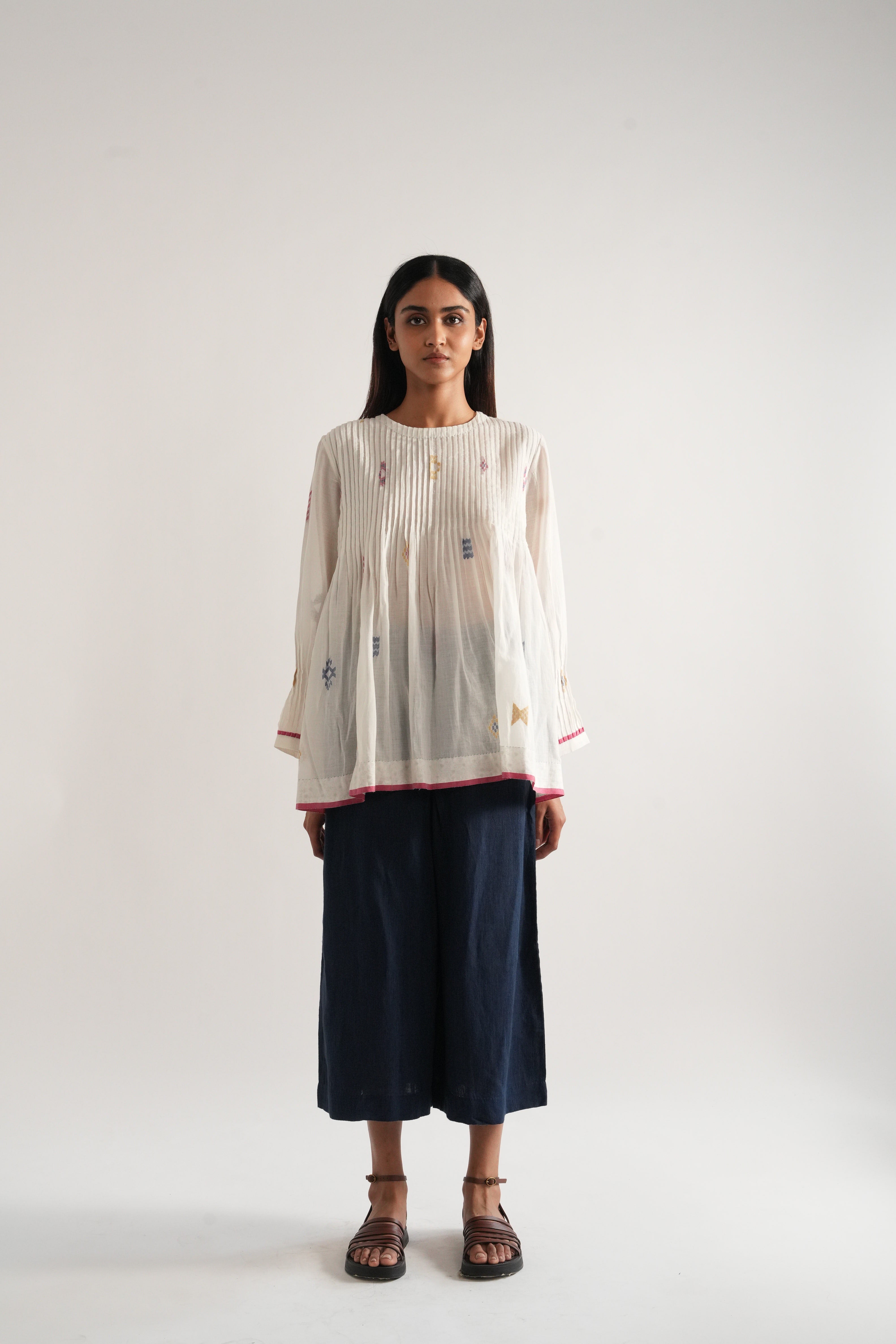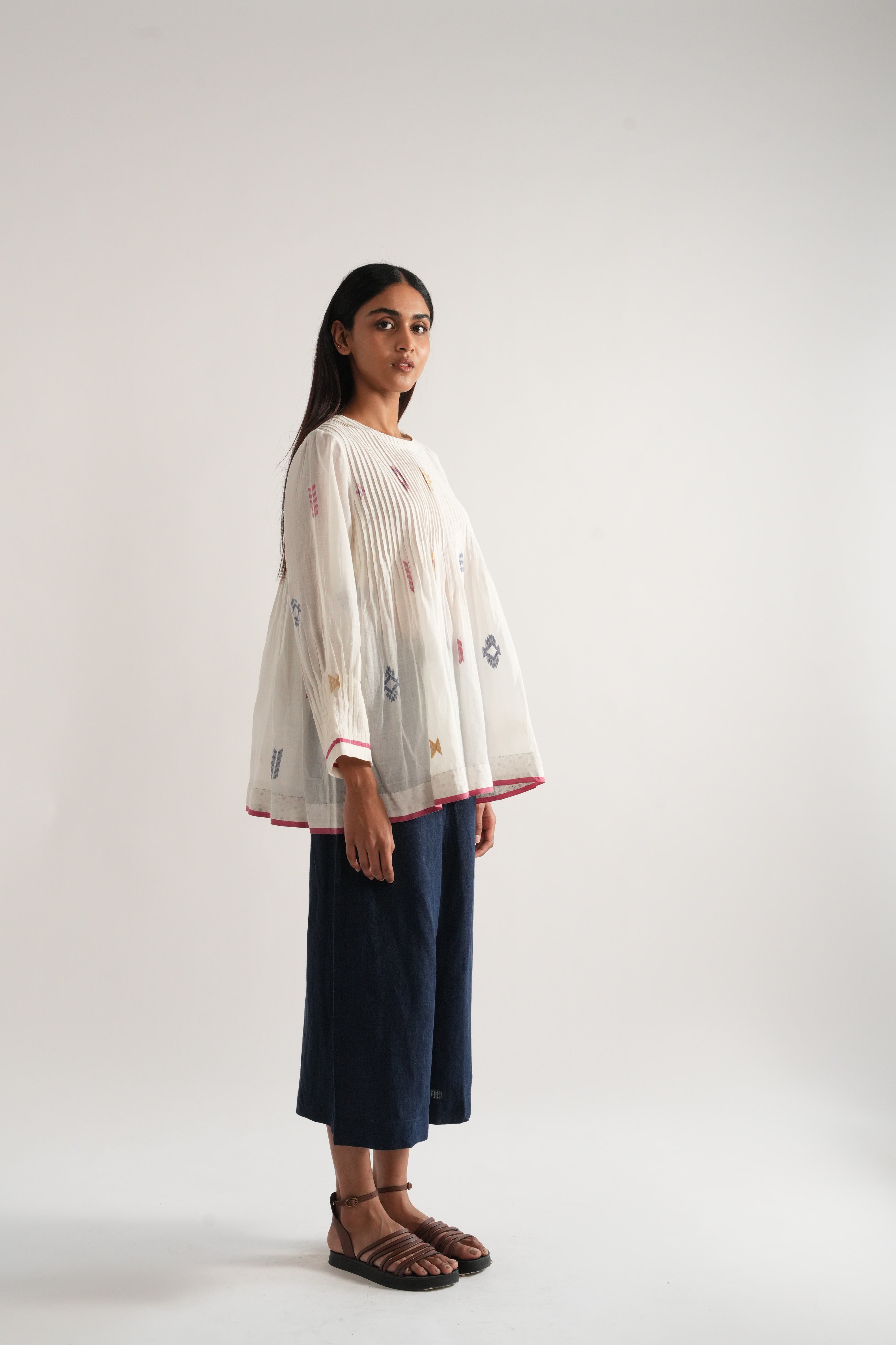 Relaxed fit allover pintuck top in handwoven cotton jamdani jacquard