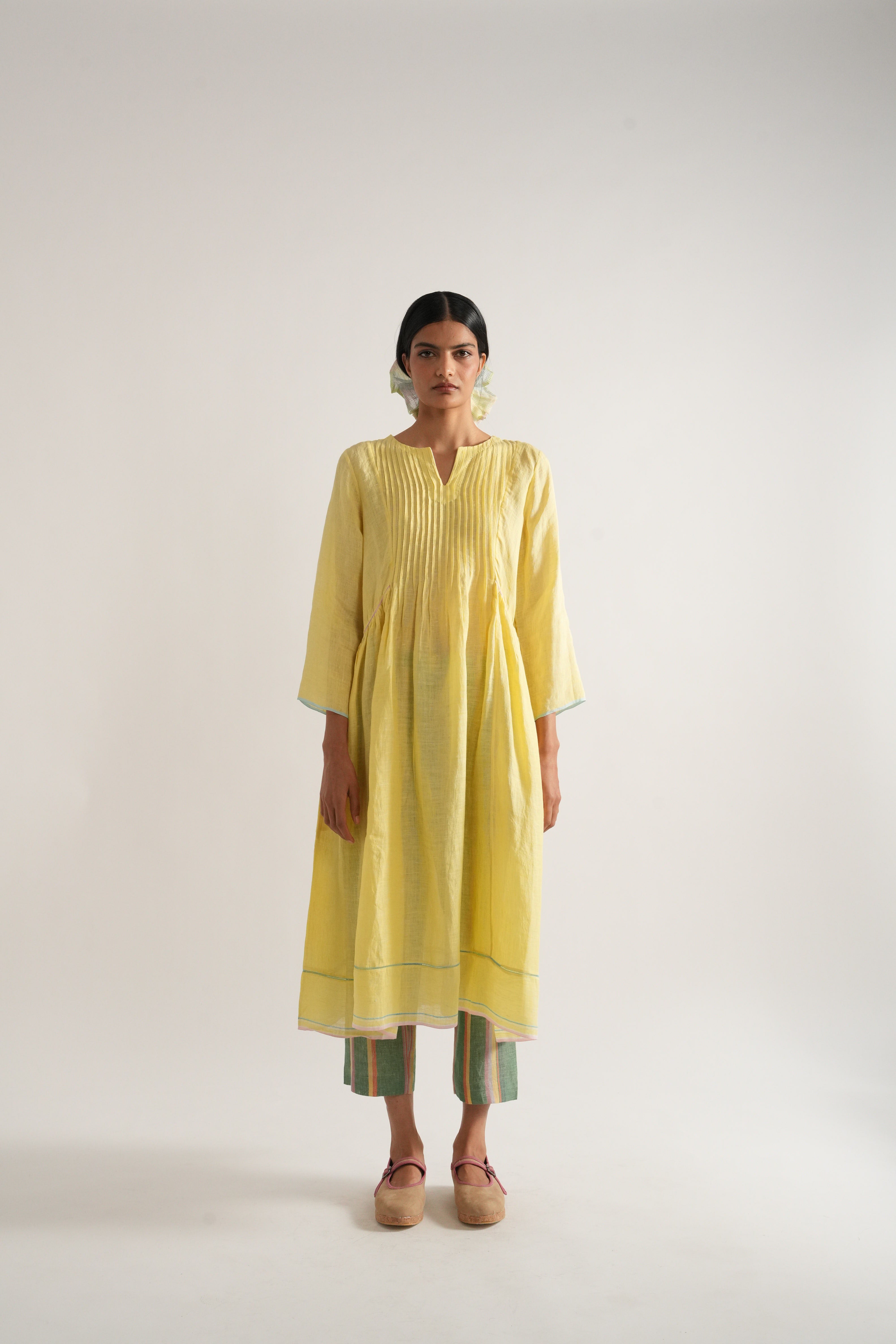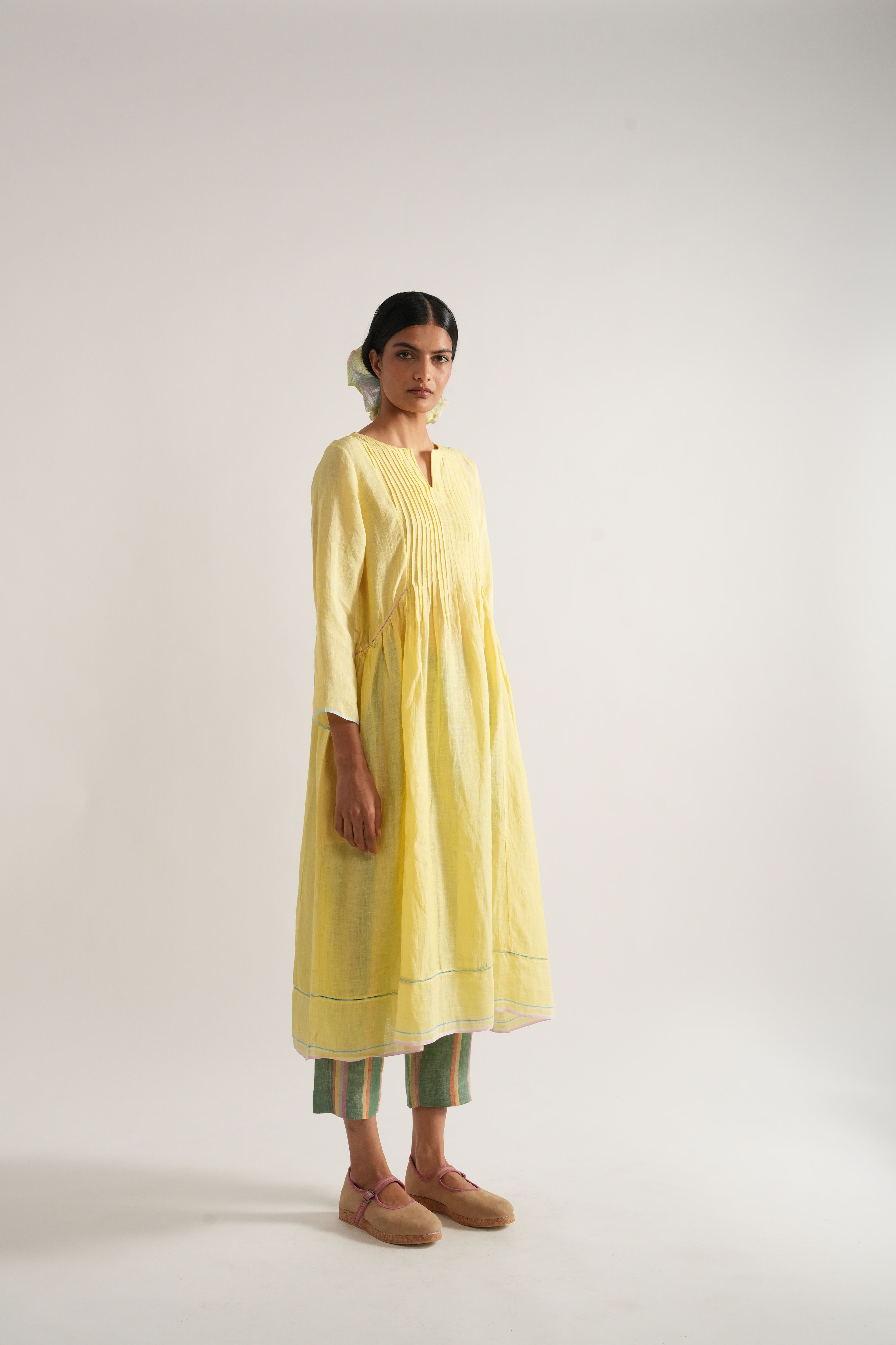 Round neck with centre cut midi length dress in linen with contrasting selvage detail