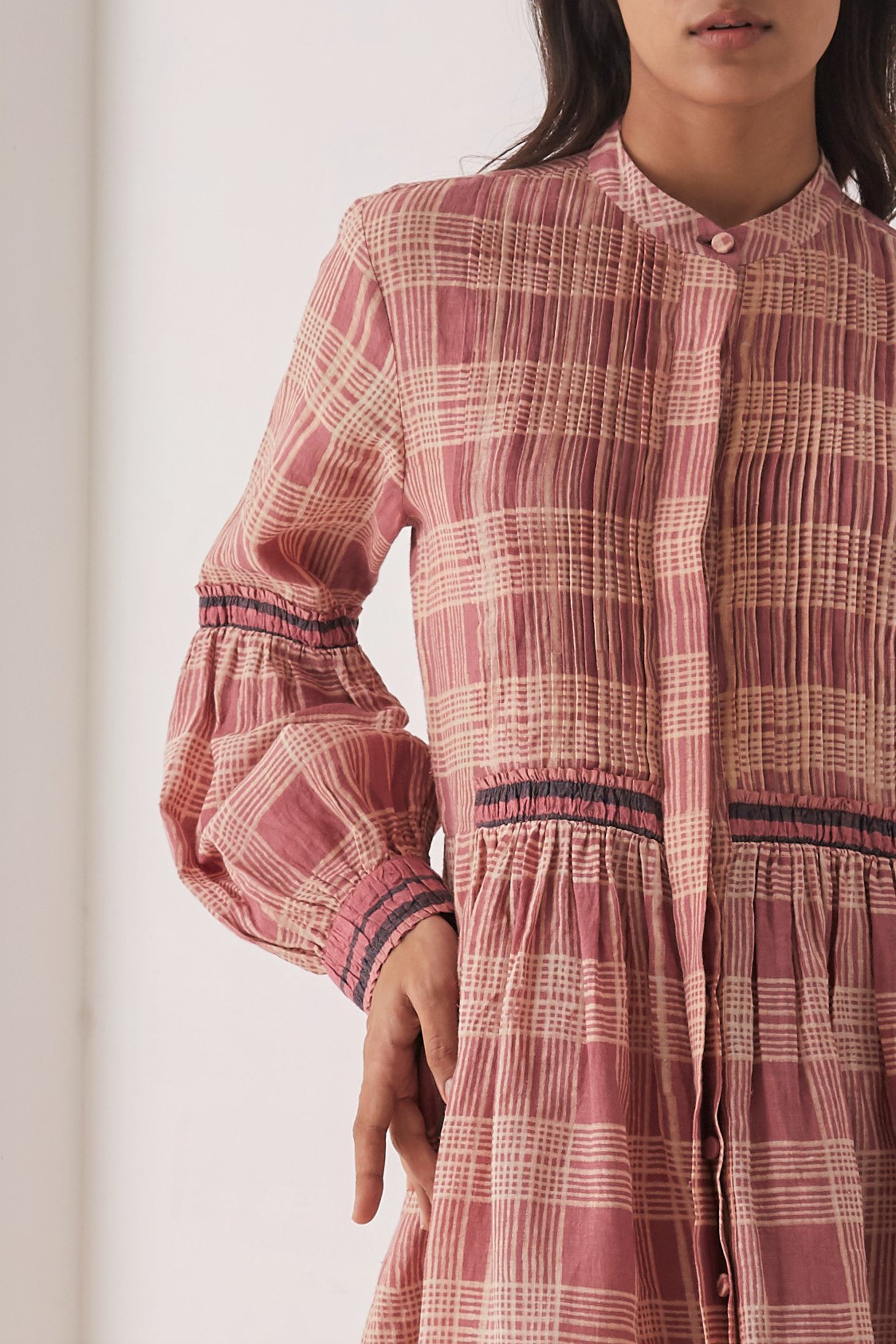 Handwoven linen dress in pink featuring discharge printed checks, with pin-tucks on the front and contrast selvedge detailing on the waist, hem and cuffs.