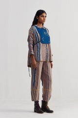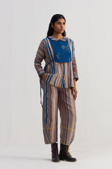 Round neckline side tye-up bib with curved hem cut detail, constructed in placement delicate kasuti motifs hand embroidery on 100% merino wool fabric. Finished with contrast collage handblock print 100% silk lining.