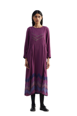 Round neckline side tye-up bib with curved hem cut detail, constructed in placement delicate kasuti motifs hand embroidery on 100% merino wool fabric. Finished with contrast collage handblock print 100% silk lining.