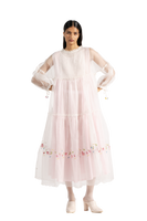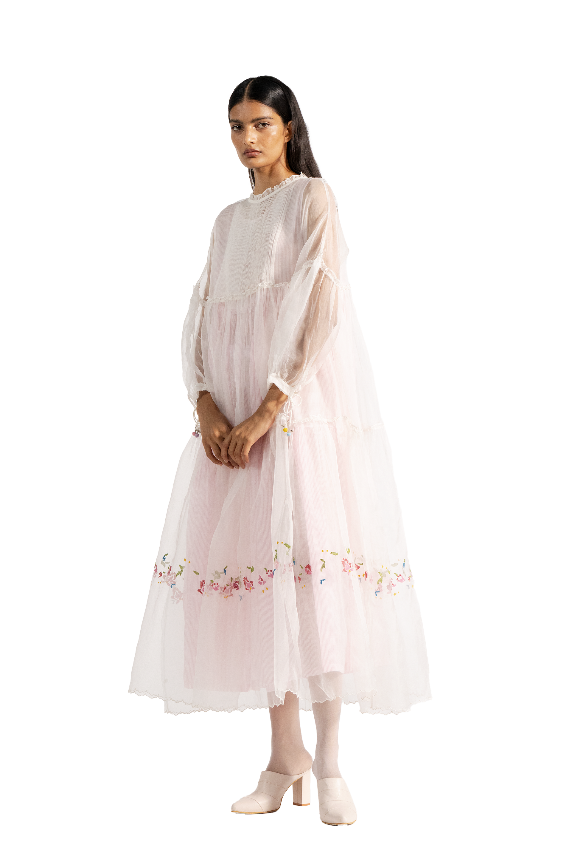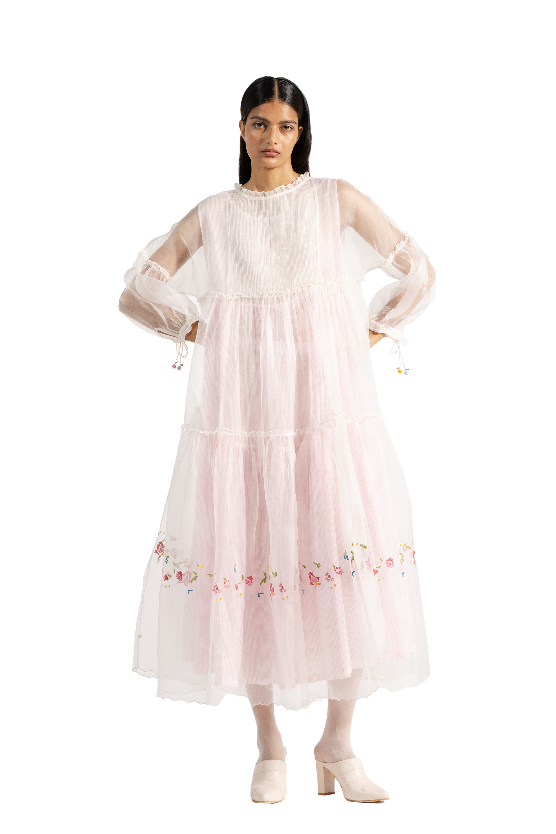 Relaxed fit maxi length tiered dress in 100% silk organza with multicolor floral embroidery. Comes with seperate lining.