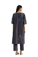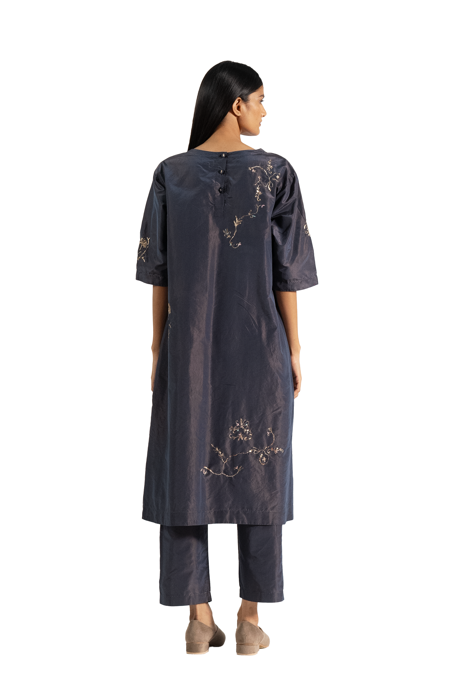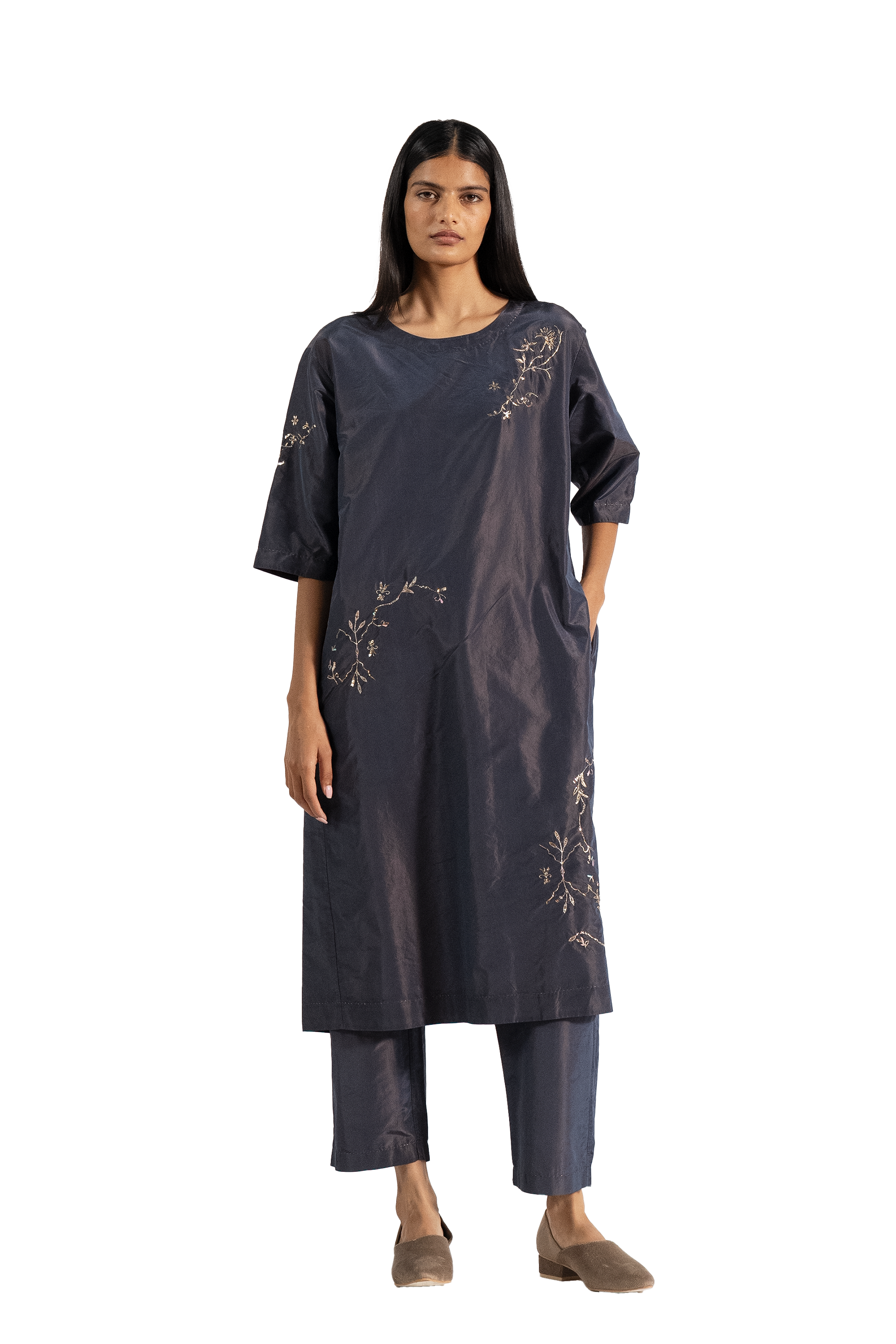 Round Neck, Semi Fitted Midi Length Kurta Dress With 3/4th Sleeves With Placement Hand Embroidery In 100% Silk Taffeta. Comes Along With A Pair Of Straight Fit Pants In Silk
