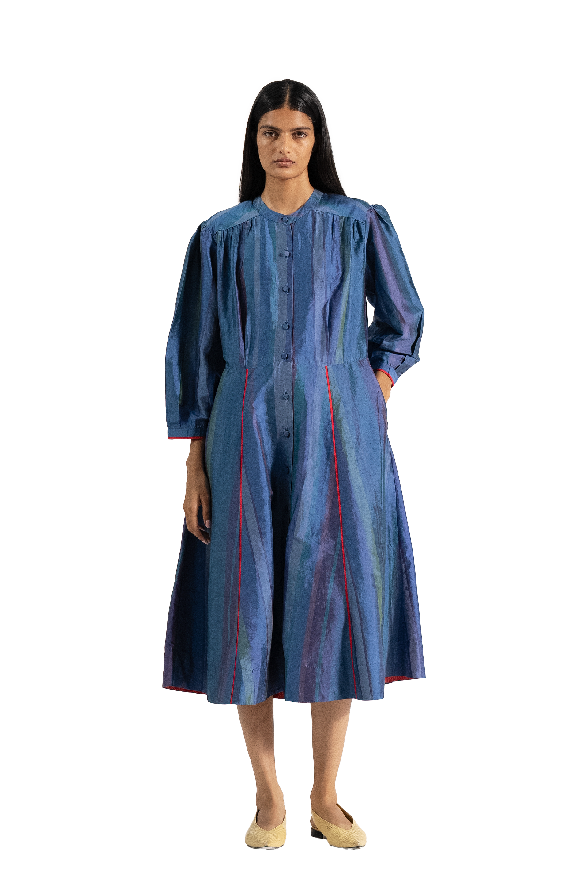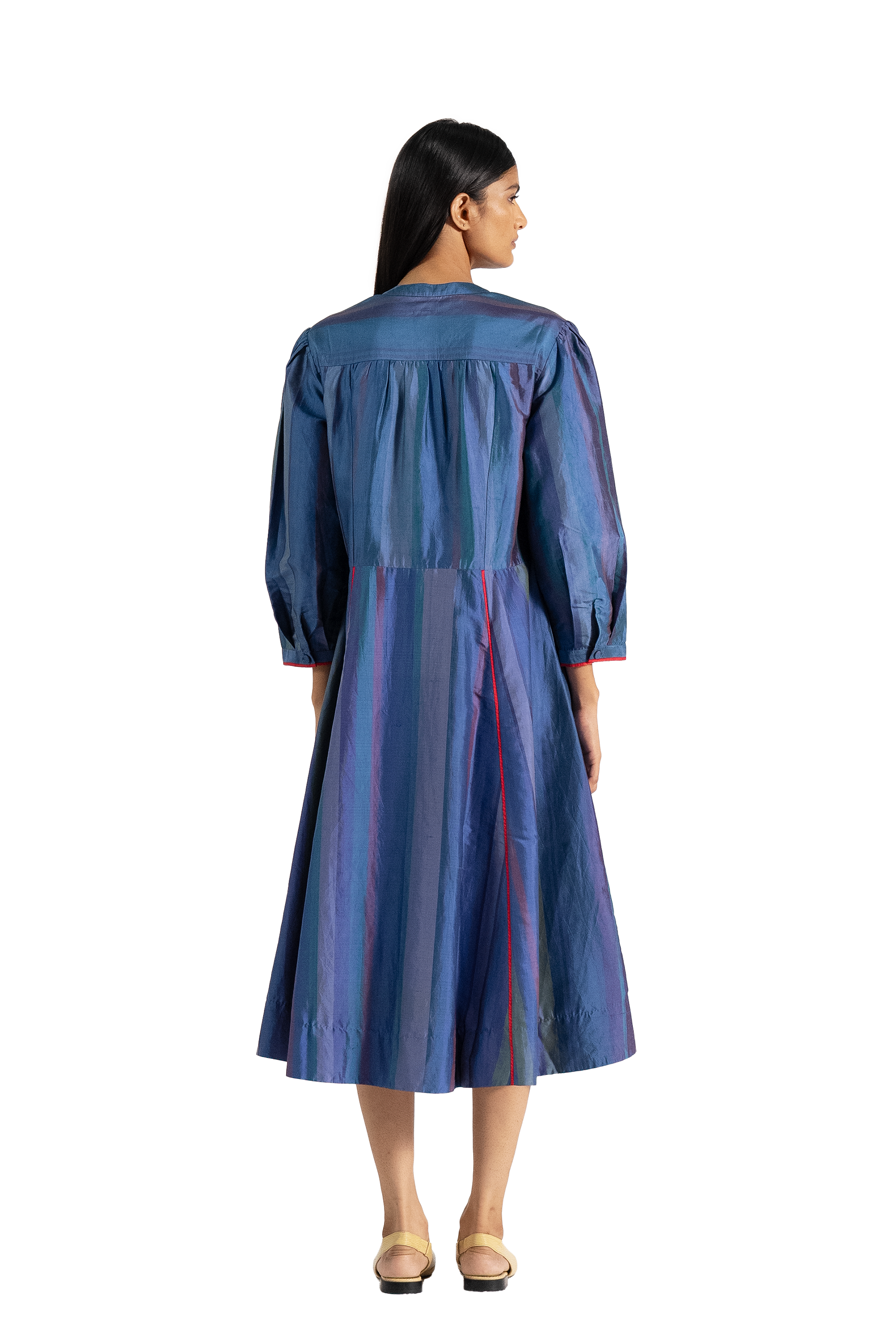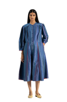 Relaxed Fit Midi Button Down Dress In Tonal Self Striper 100 % Silk