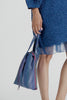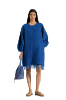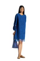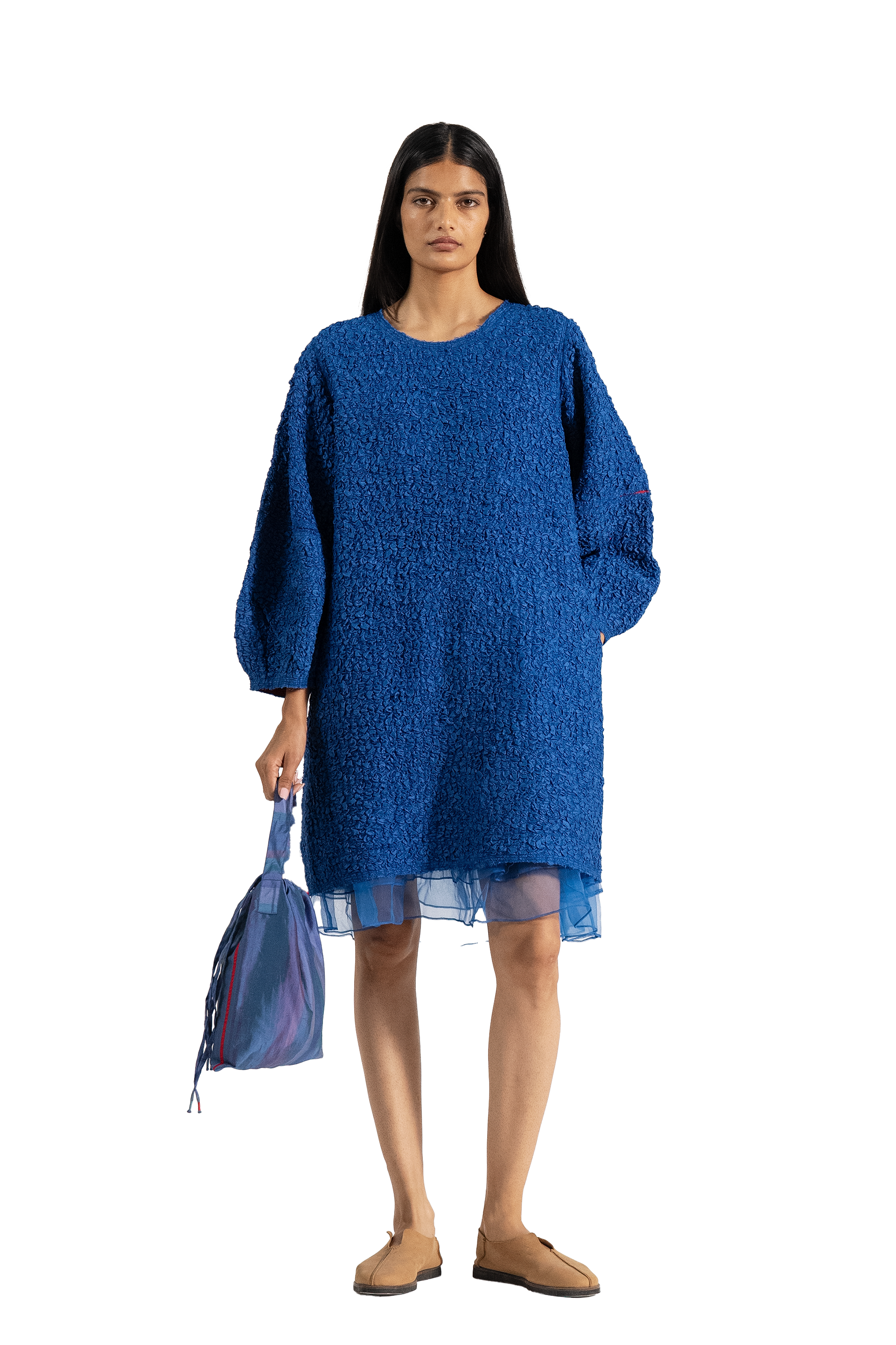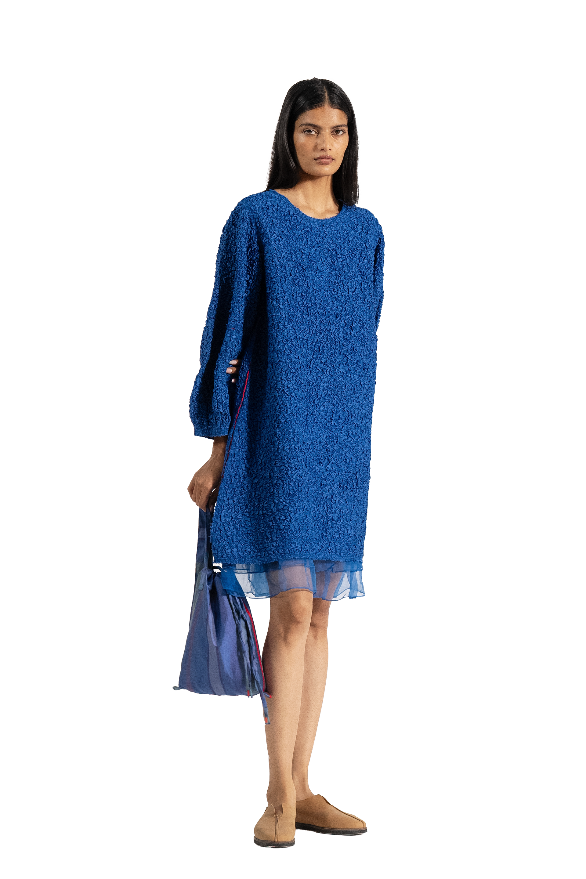 Straight Fit Round Neck Full Sleeved Knee Length Dress In 100% Smocked Textured Silk with attached organza trim.
