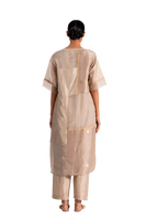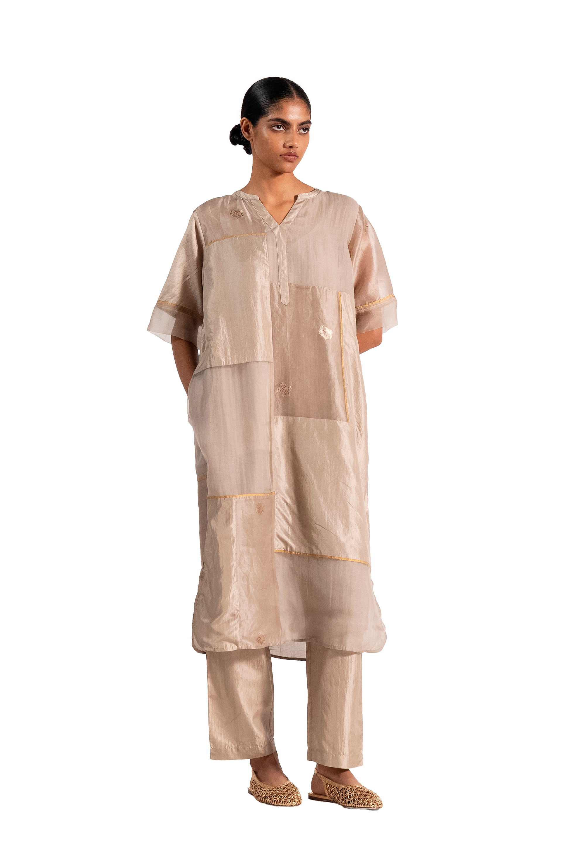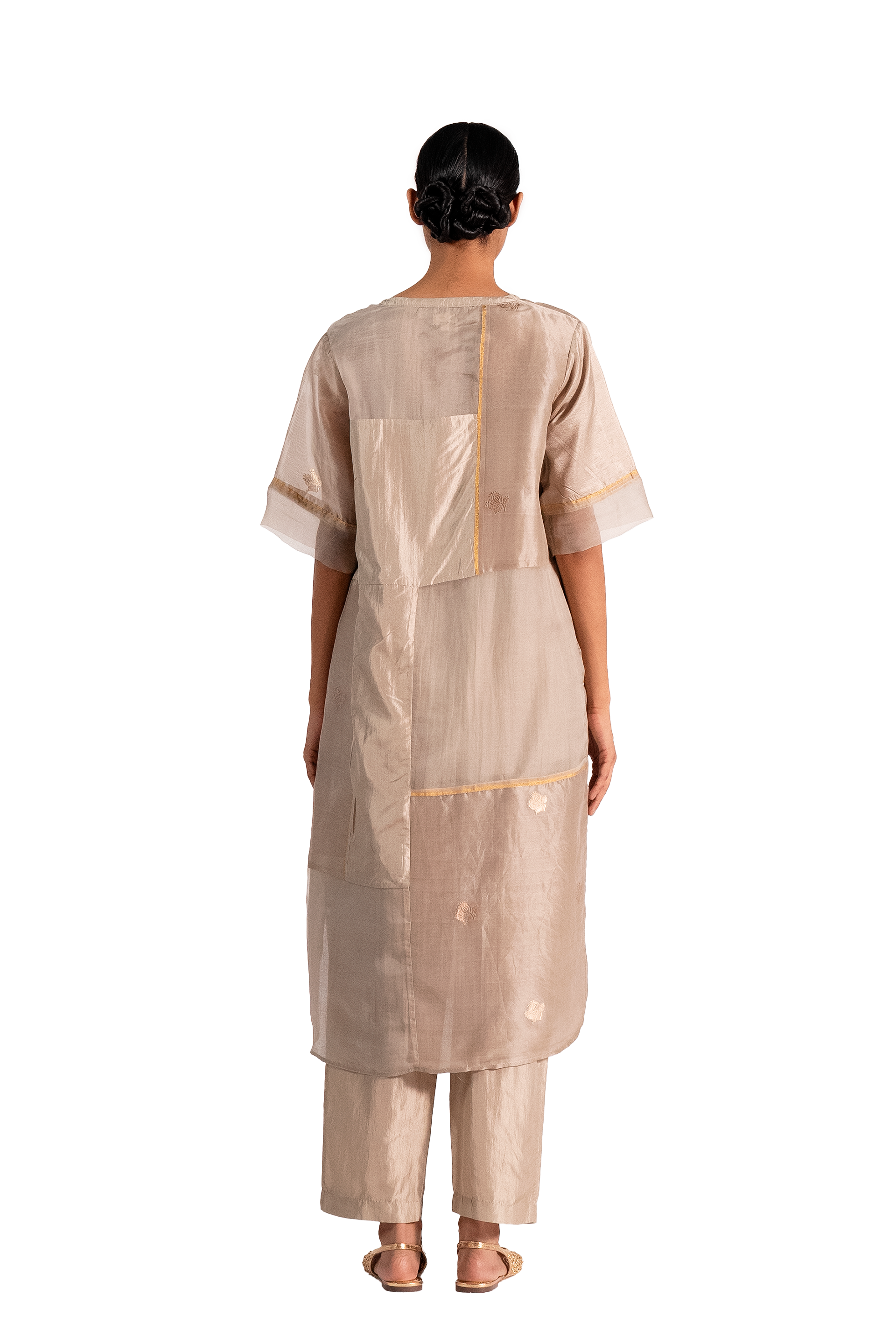 Straight Kurta With Curved Hems And Pachtwork Detail In Jaquard Butti Organza, Solid Organza & 100% Silk & Gold Binding. Comes With A Separate Cotton Silk Lining And Solid Silk Pants Lined Witth Handloom Cotton Silk.