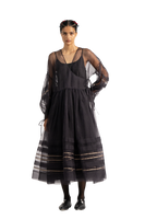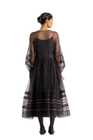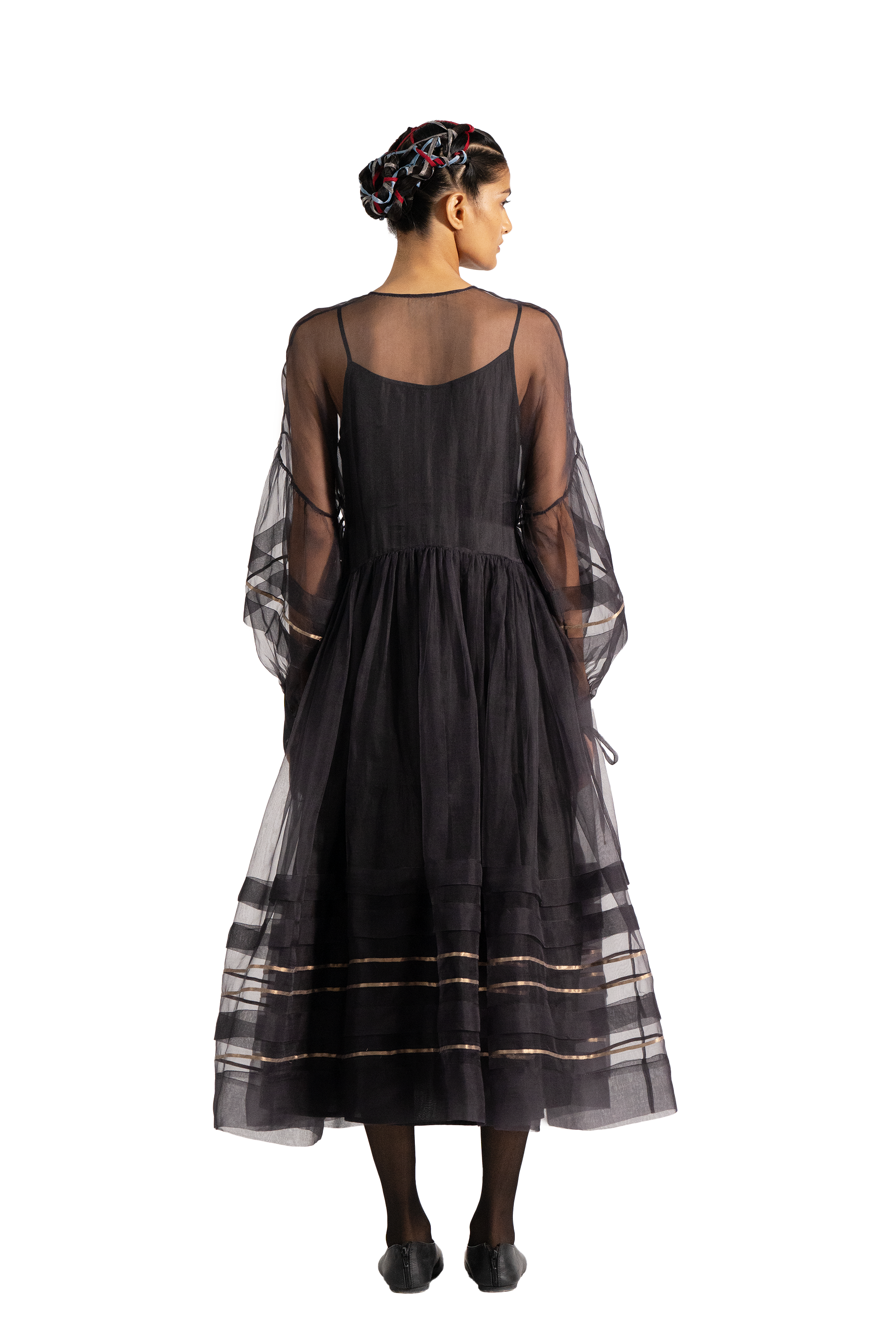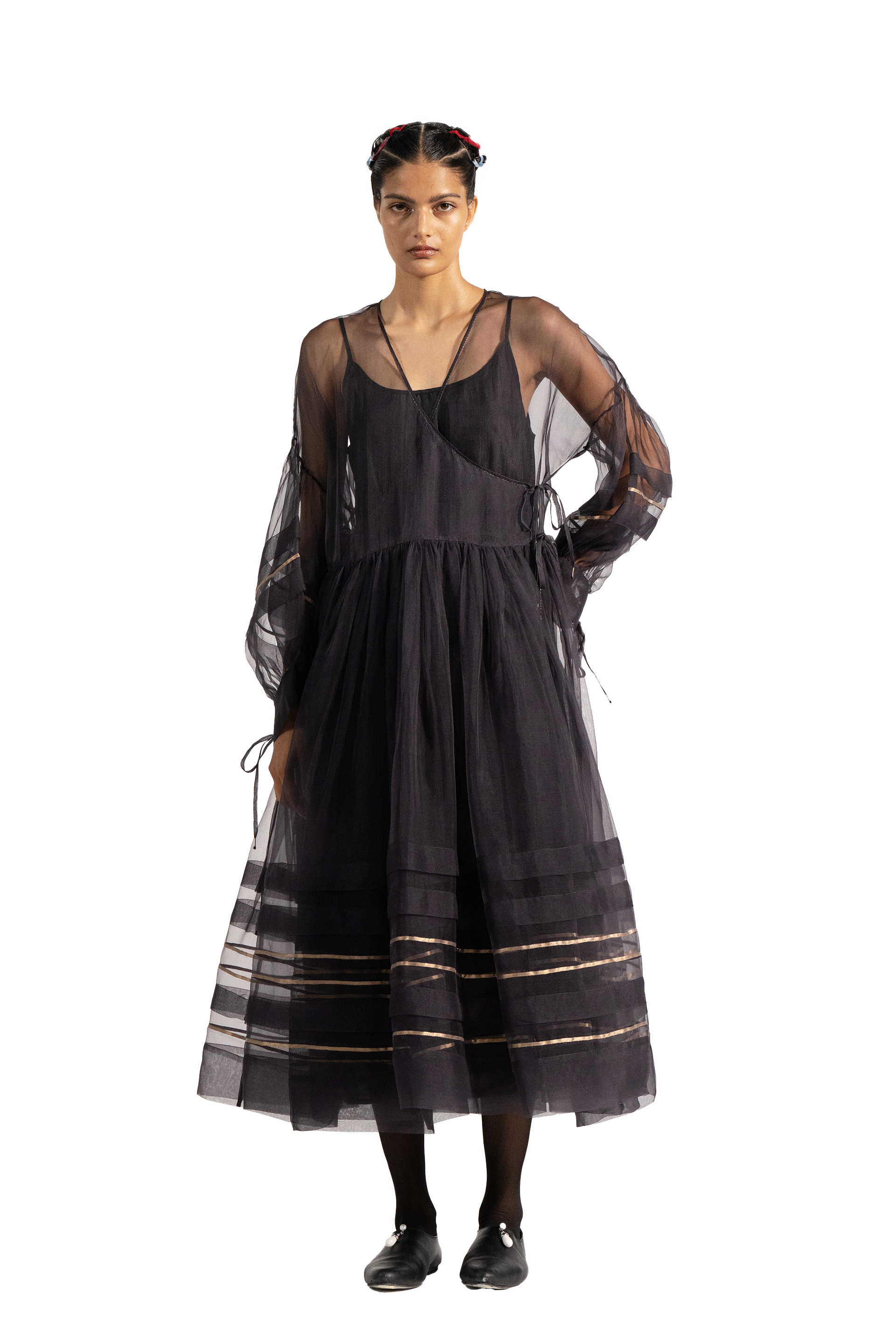 Oversized tiered wrap-around overlay dress in silk organza with golden silk brocade binding. Comes along with a complimentary cotton silk lining.