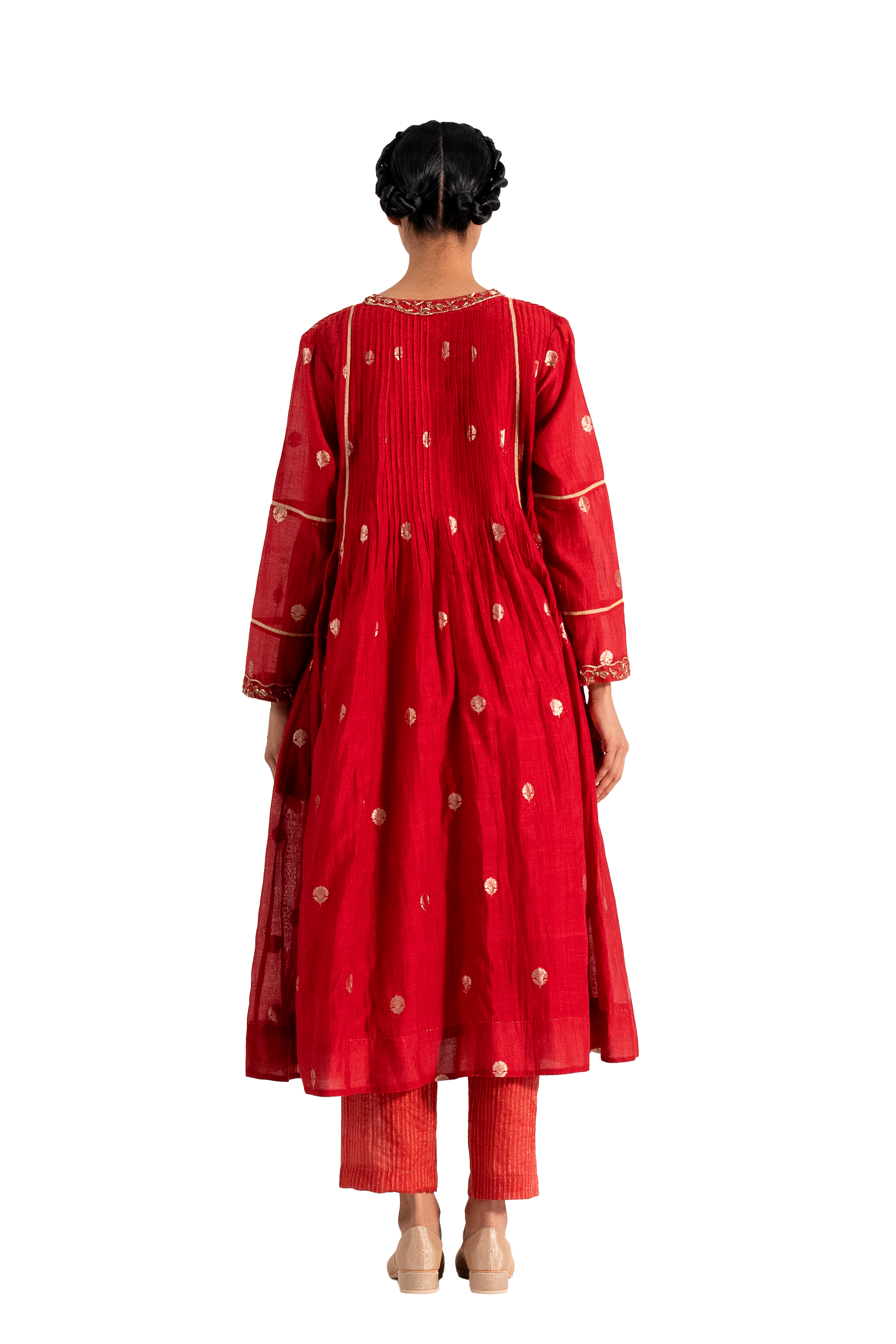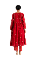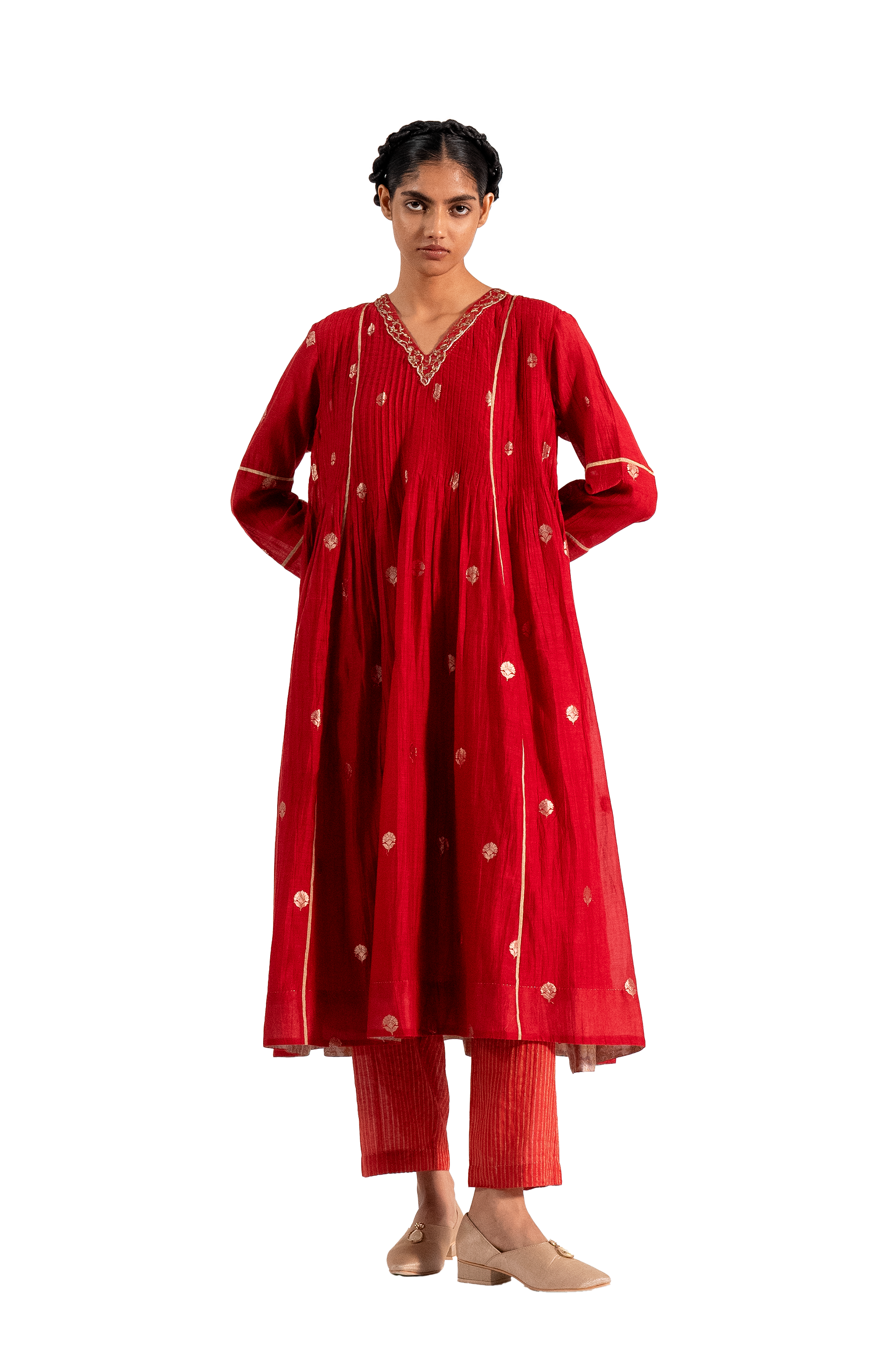 V Neck Semi Fitted Flared Midi Dress With All Over Butti Detail With Hand Embriodered Neckline And Sleeve Detail And Gold Biding. Comes With A Separate Cotton Silk Lining