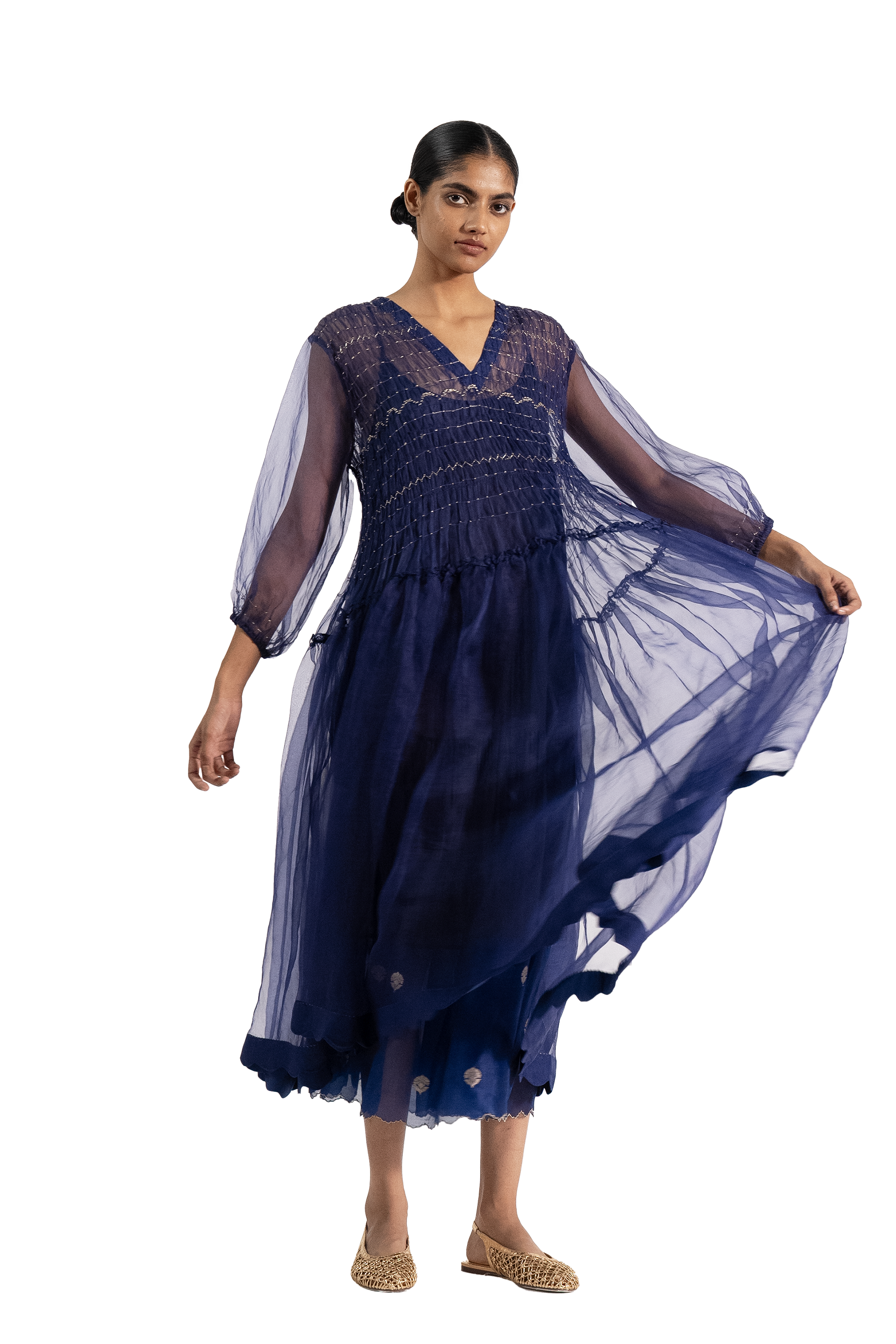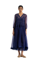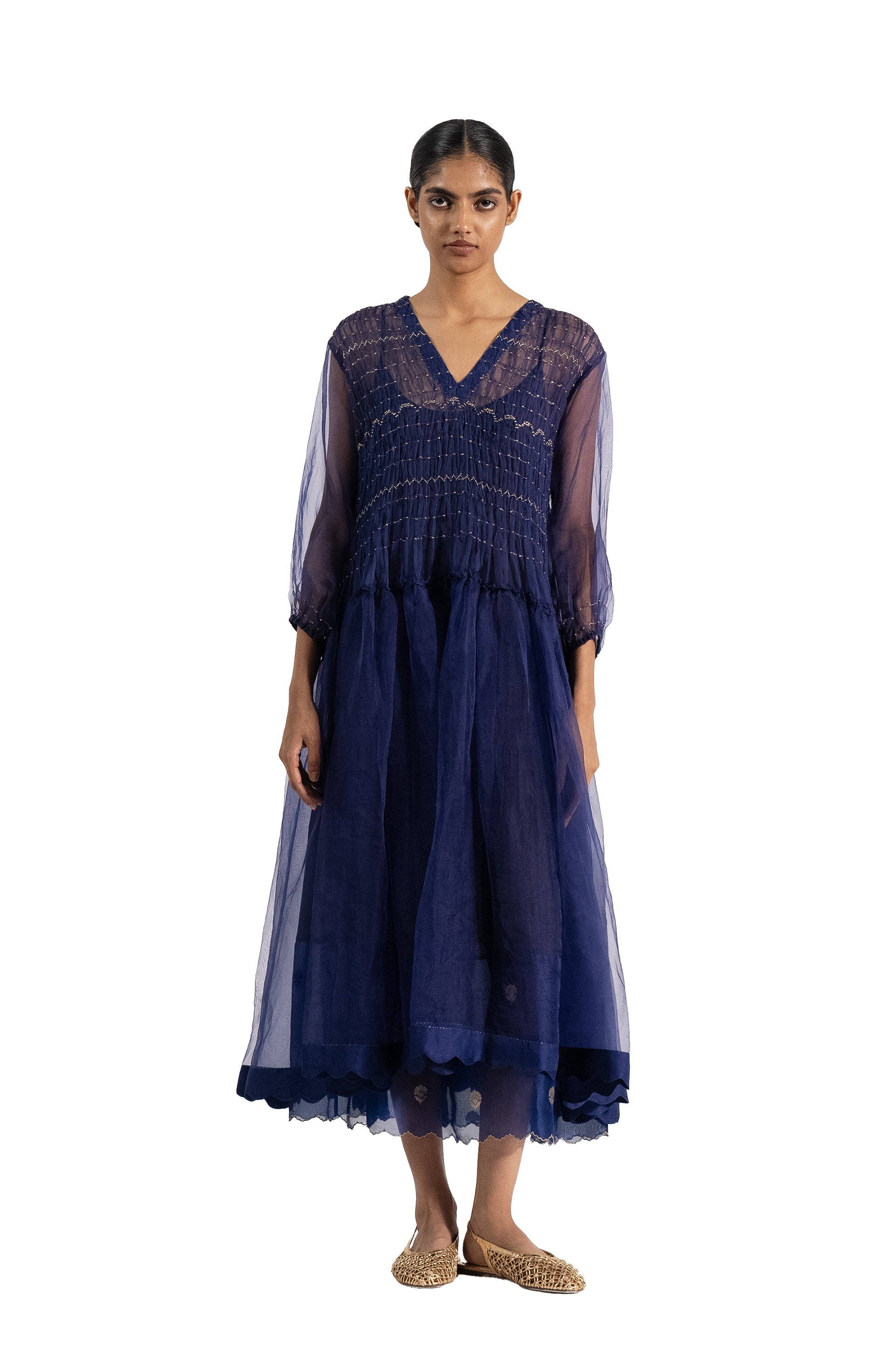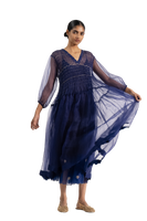Voluminous Tiered Dress With Hand Smocking In All Over Zari Thread Detail. Comes With A Cotton Silk Lining.