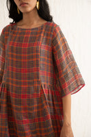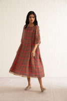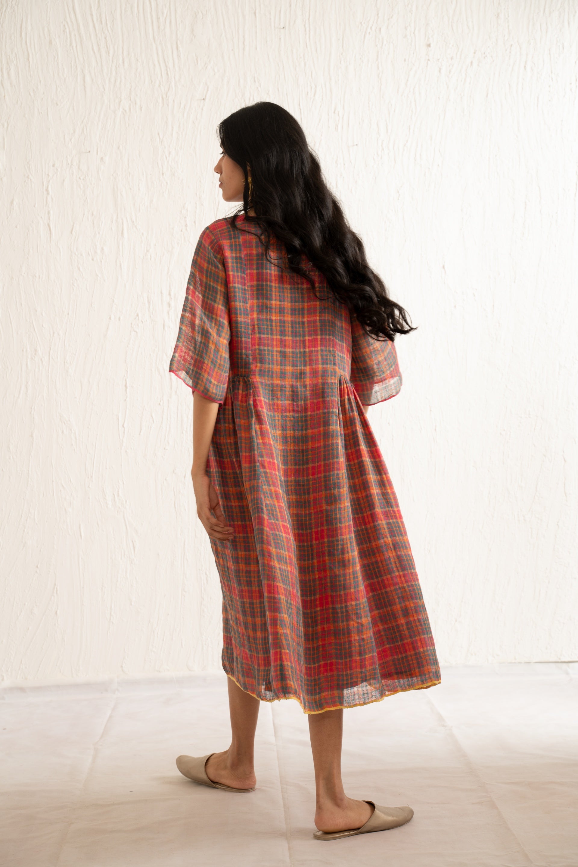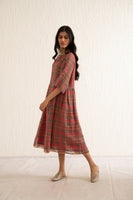 Midi length, multichecked dress featuring delicately crafted side gathers. The underlayer is an attached hand block stripper printed cotton silk lining