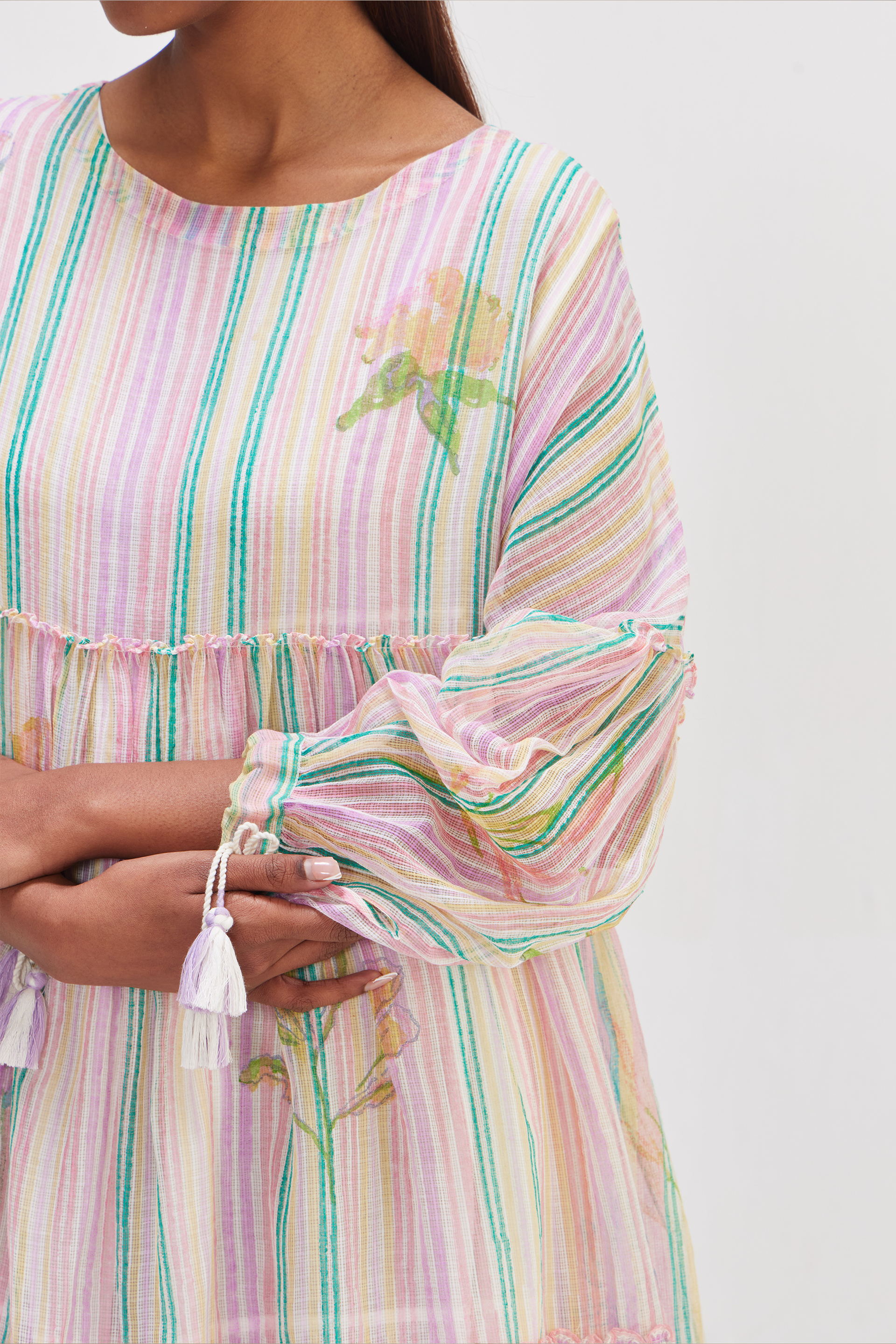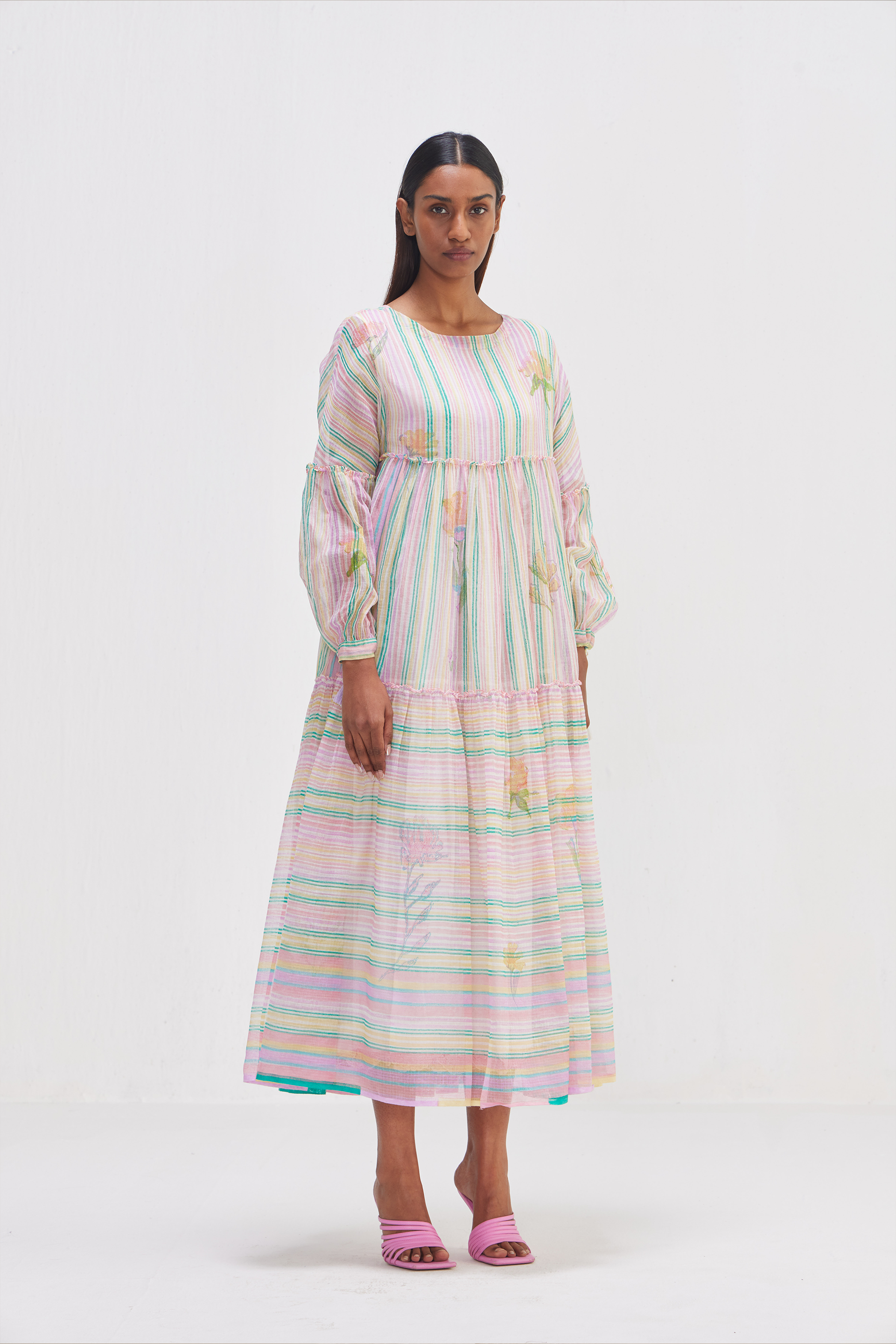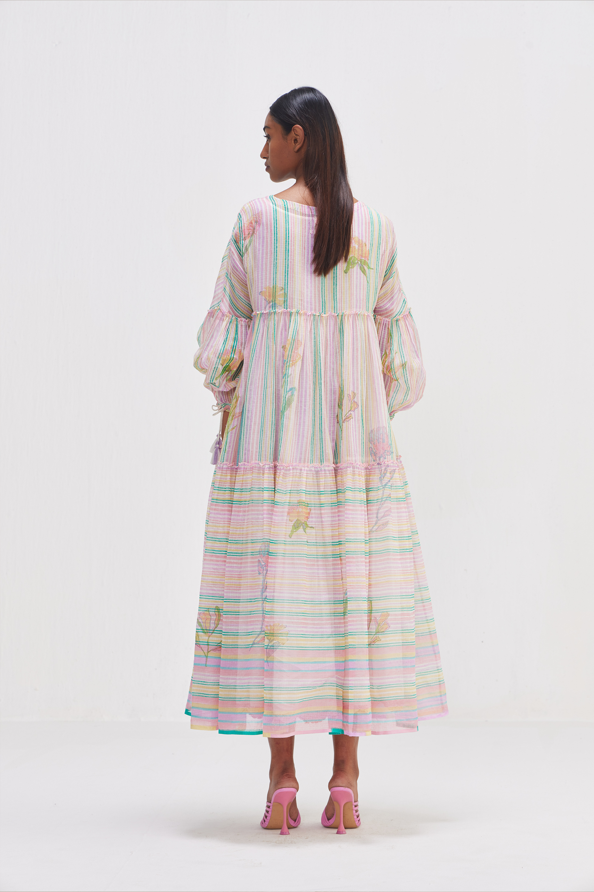 Tiered dress in multicolor striper hand block print and multicolor placement chunky floral print pattern. Comes with a seperate hand block text printed lining.