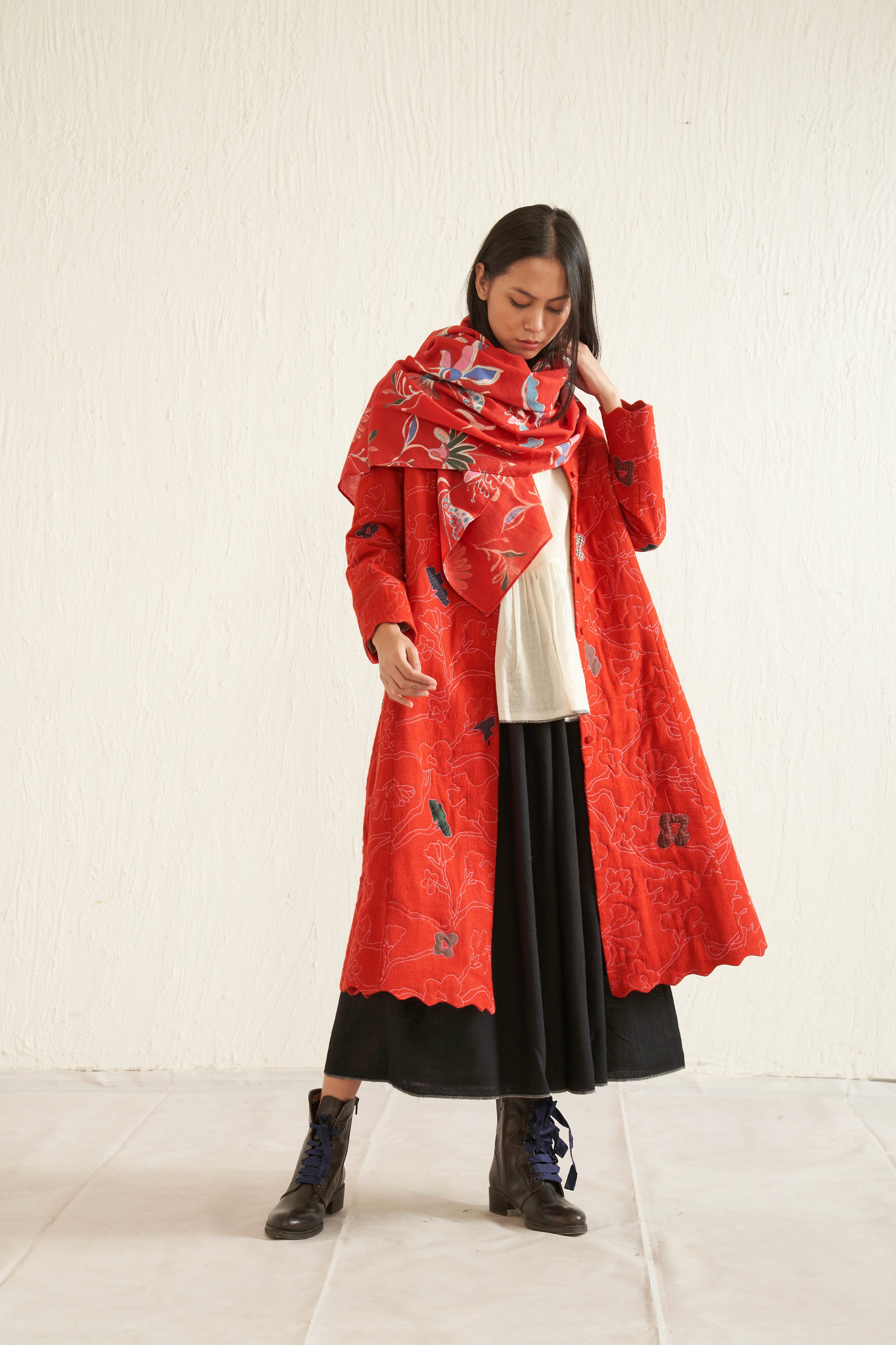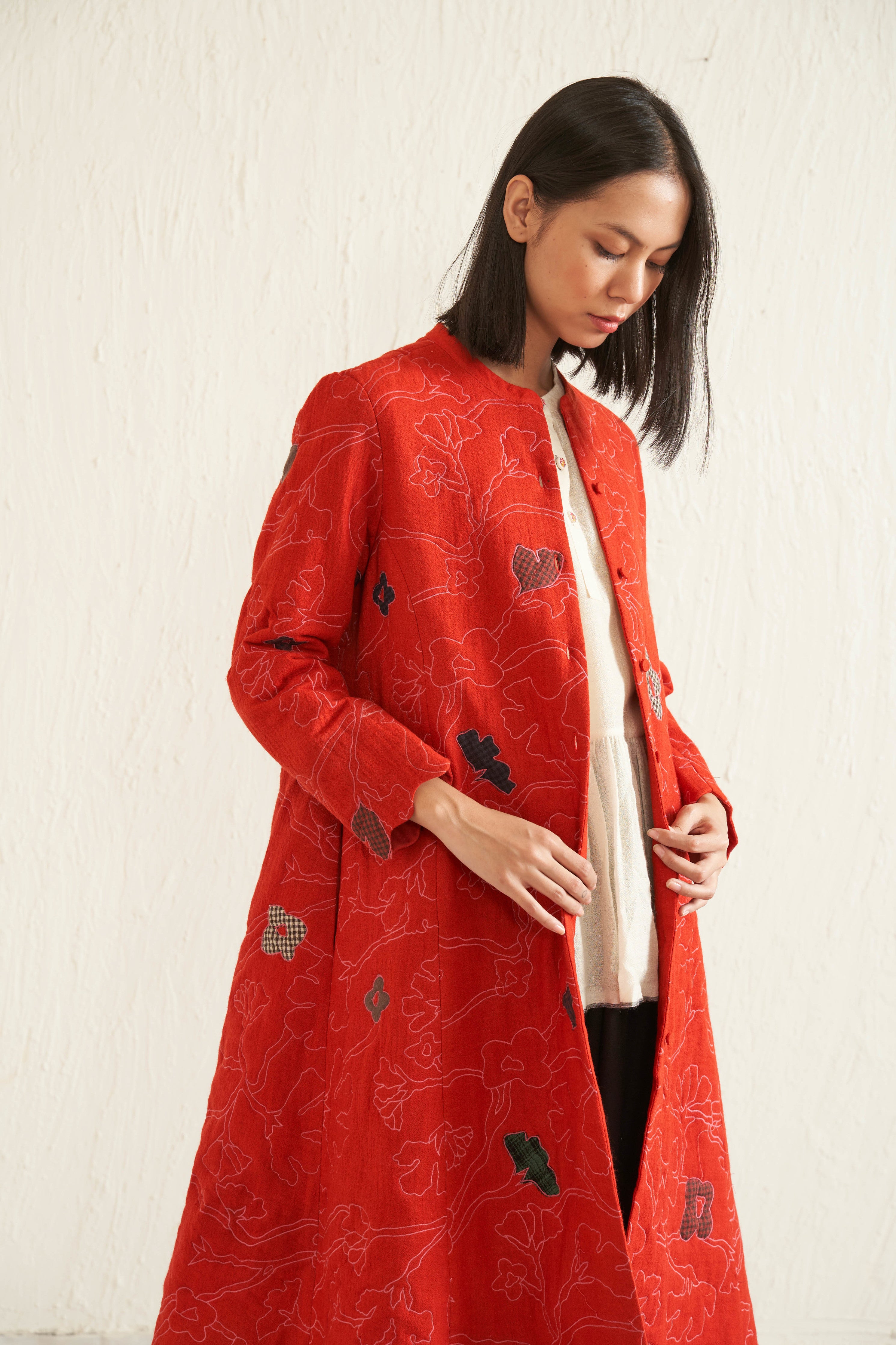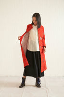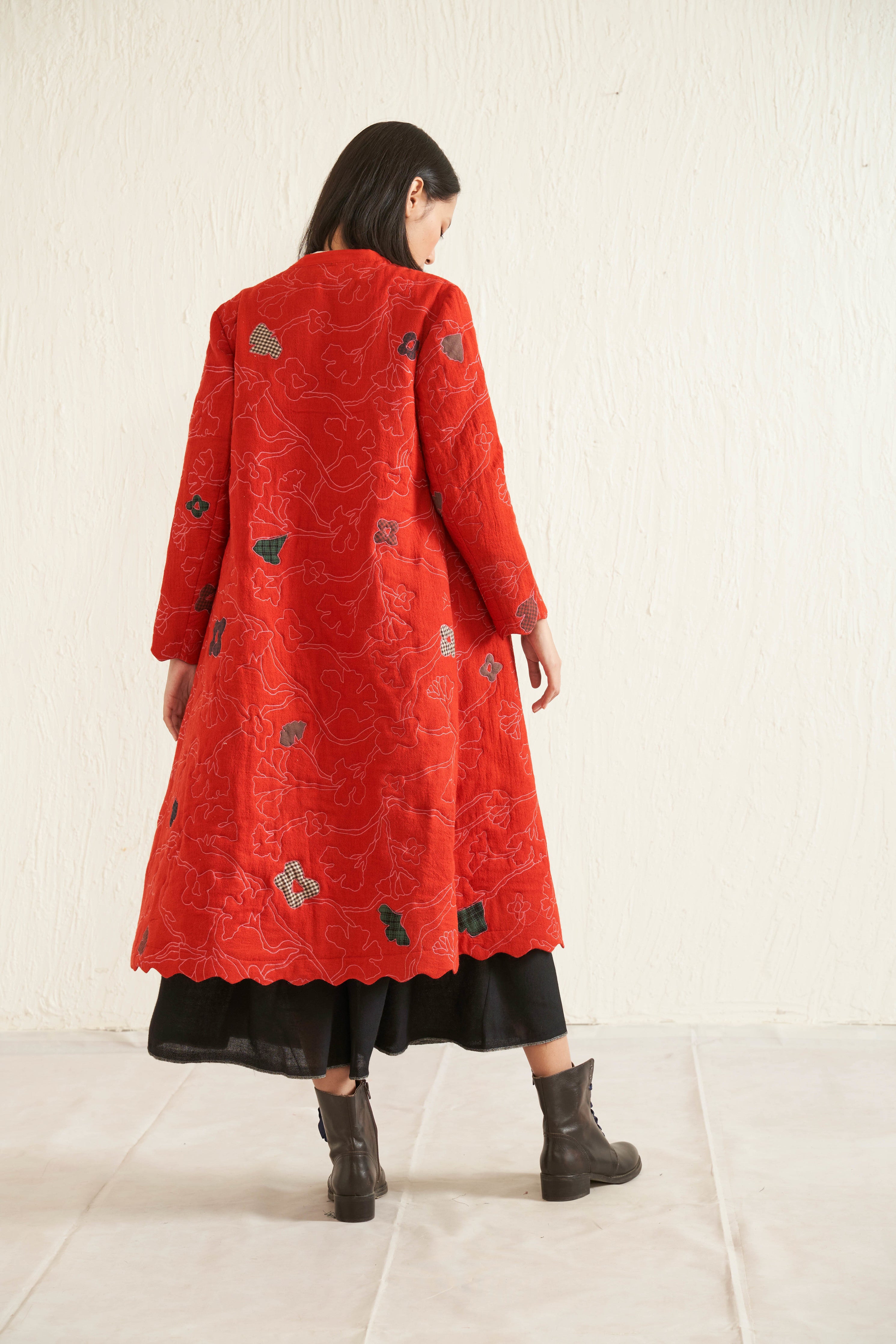 Red applique embroidered quilted jacket in pure merino wool. Comes with a  striper printed pure silk lining