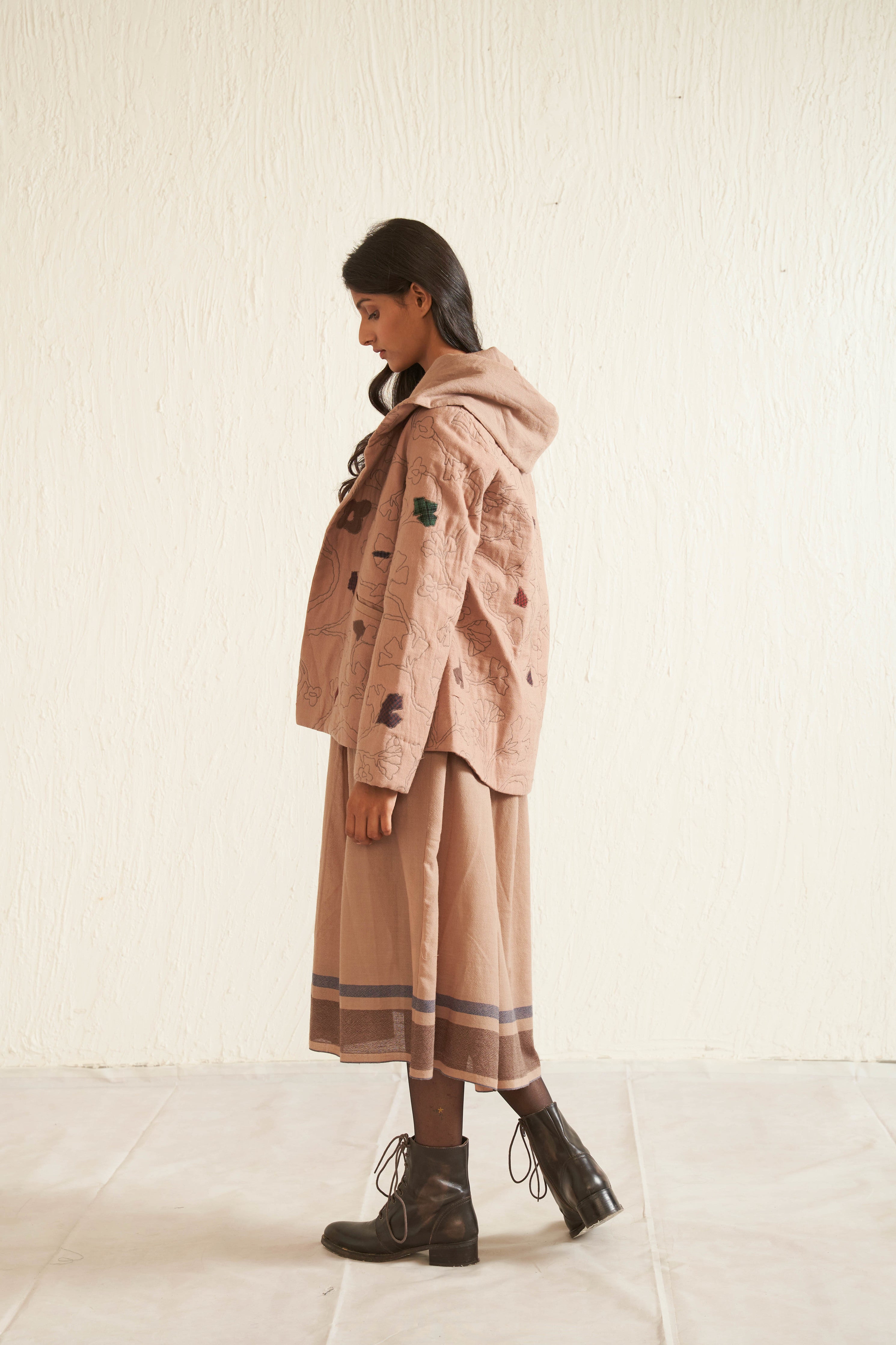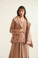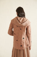 Multicolor applique embroidered quilted jacket in wool-silk blend with patchwork. Comes with a black abstract striper printed pure silk lining