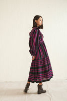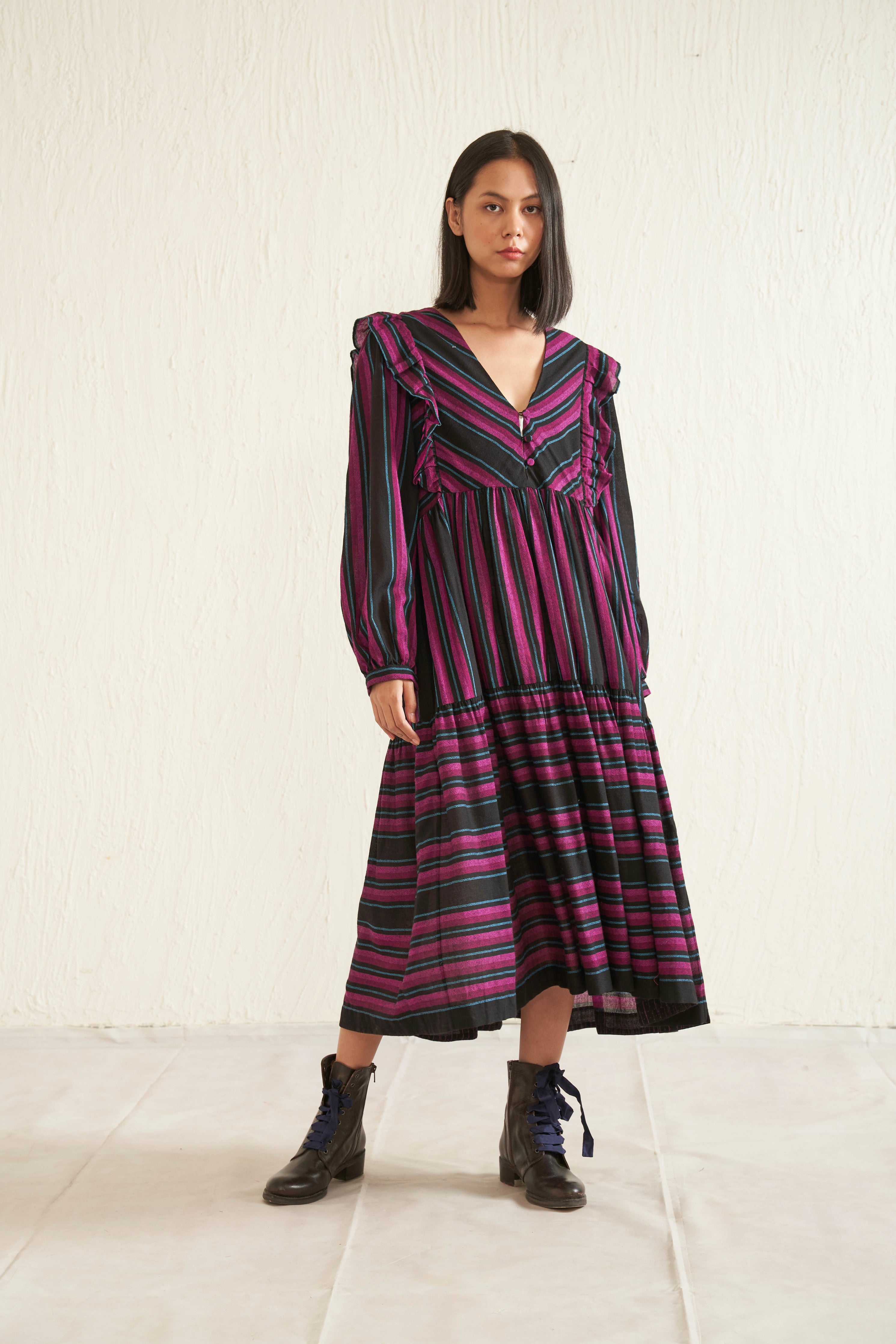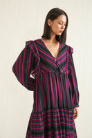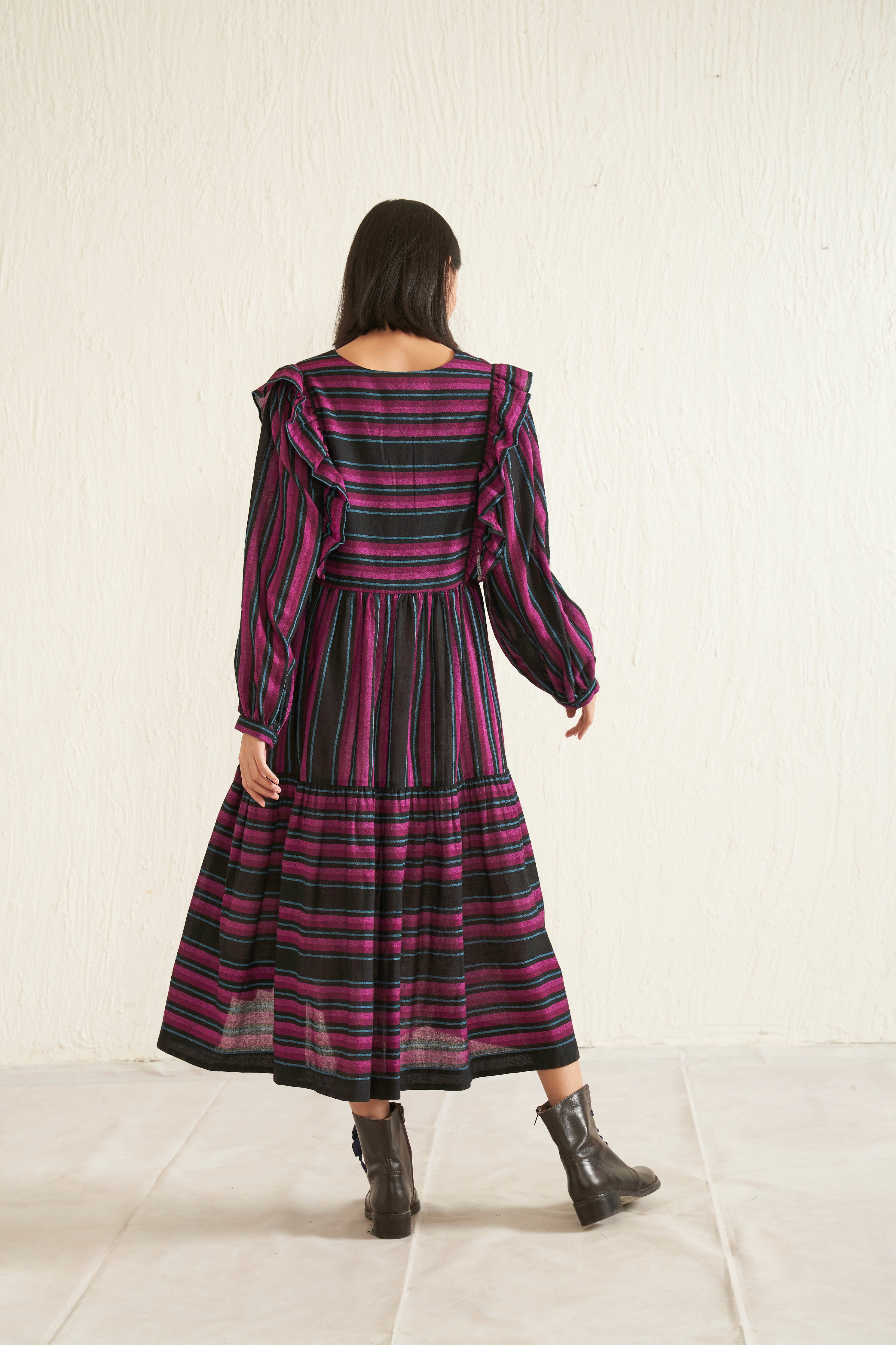 Black ruffle multi-striper dress in pure merino wool