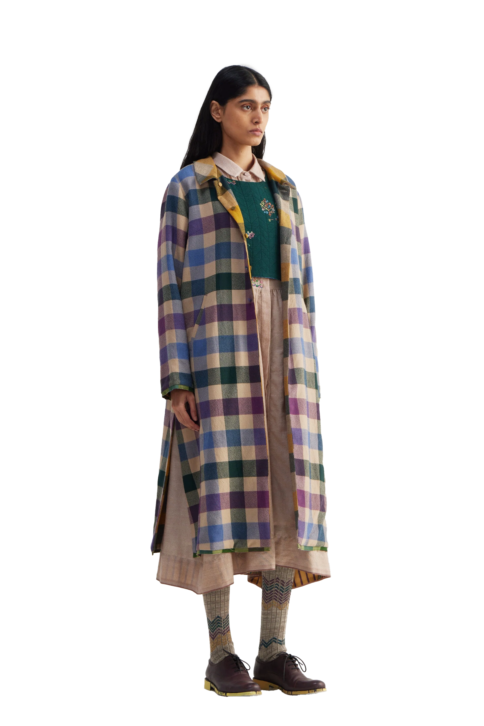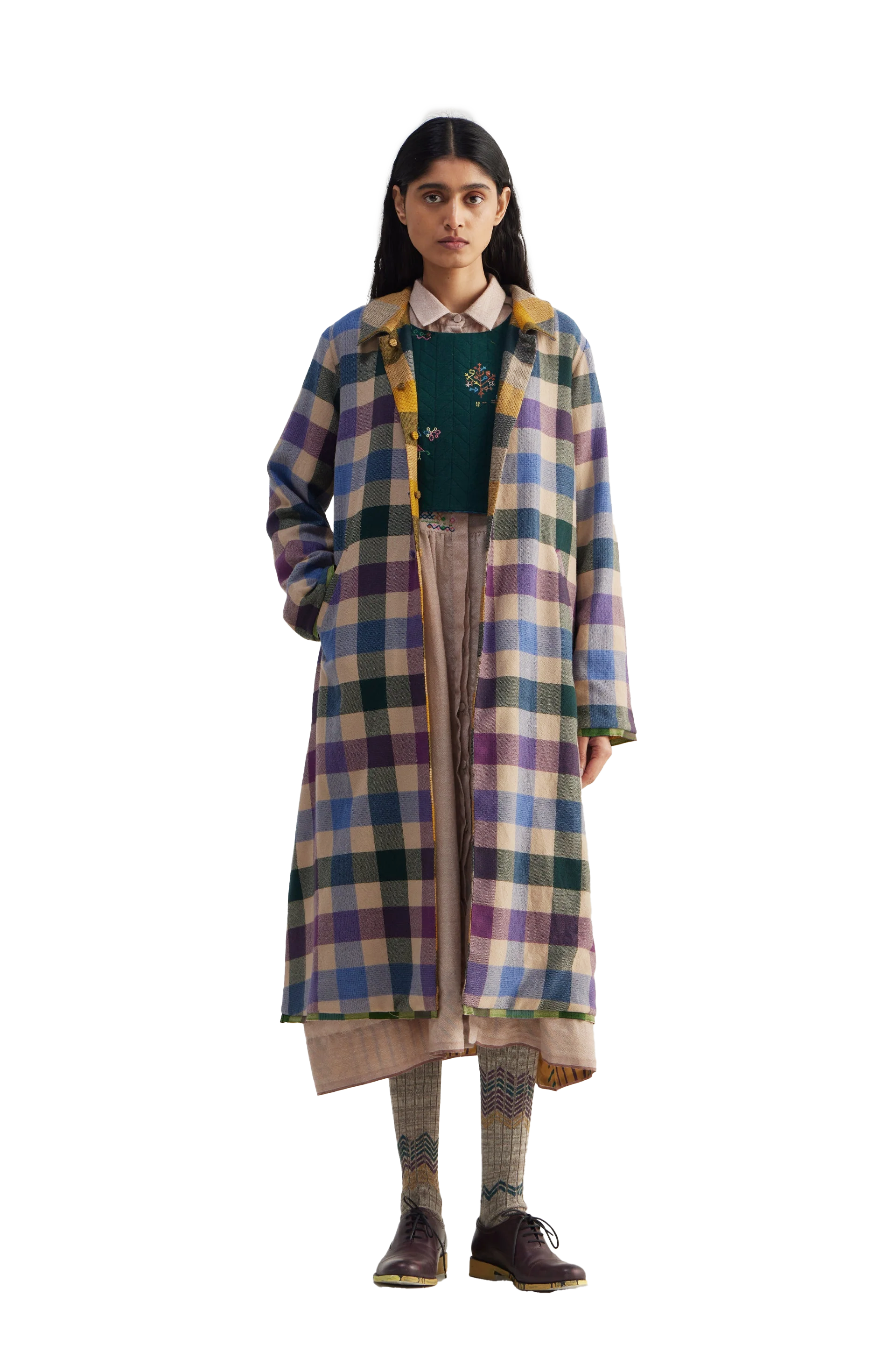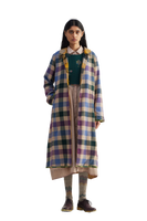 Reversible straight fit flat collar button down full sleeves jacket. Constructed in multicolor checkered 100% merino wool fabric. Finished with tonal selvedge detail insert on hem and sleeves.
