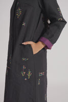 Straight fit button down jacket in placement delicate kasuti hand embroidery on quilted wool silk linen. Lind with handblock print silk lining.