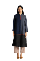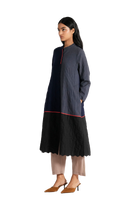 Button Down Midi Length A-line Jacket With Mandarin Collar And Scallop Deatil On Hem, In All Over Quilted Patchwork 100% Merino Wool And Wool Linen Silk Blend.