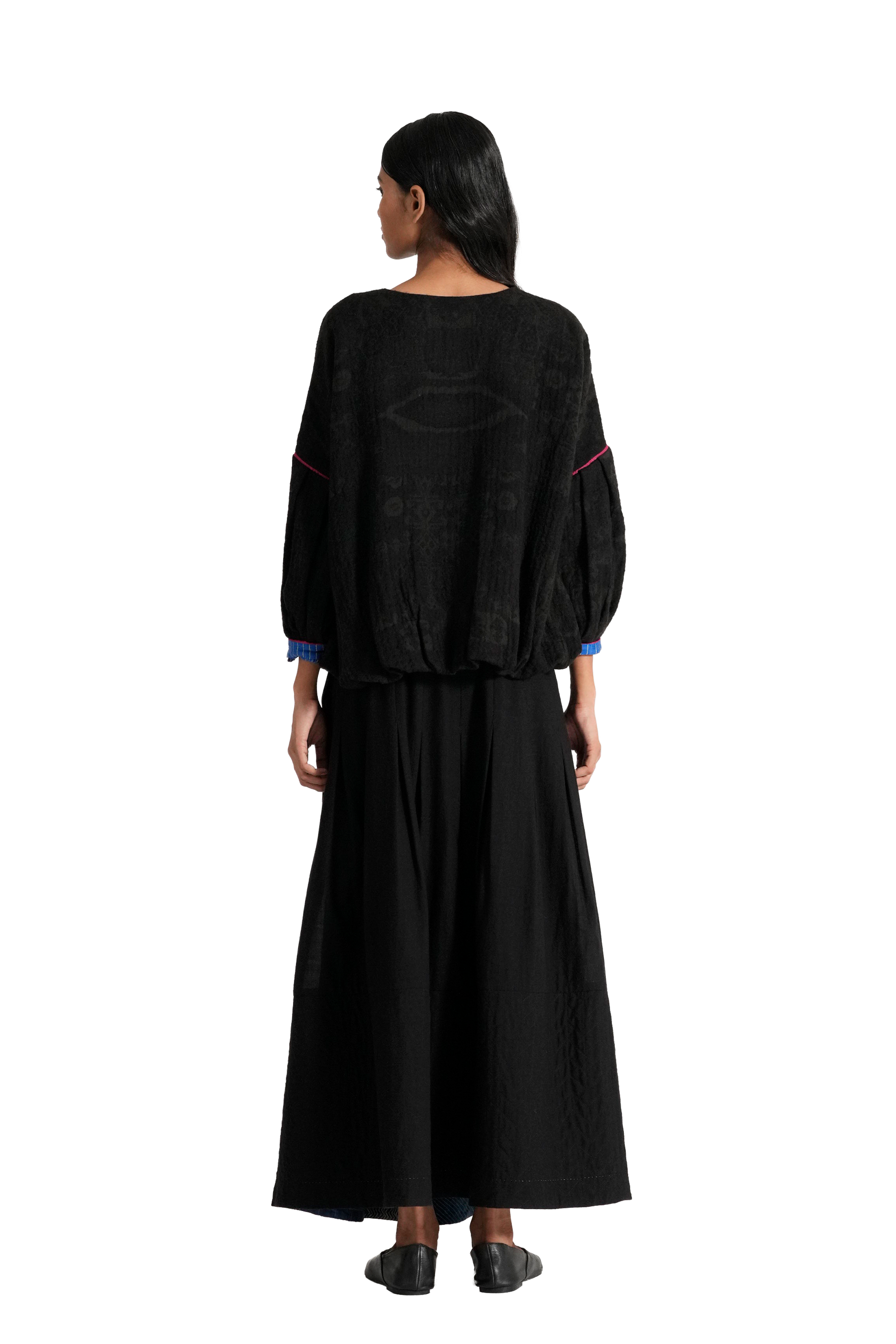 Front Open Balloon Shaped Jacket In Jacquard 100% Merino Wool. Comes Lined With Attached Handblock Printed 100% Silk.
