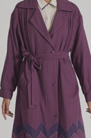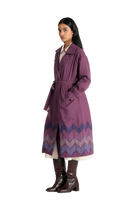 Relaxed fit double breasted long jacket with multicolor chevron on hem in 100% merino wool jacquard fabric. Lined with handblock print 100% silk.