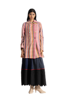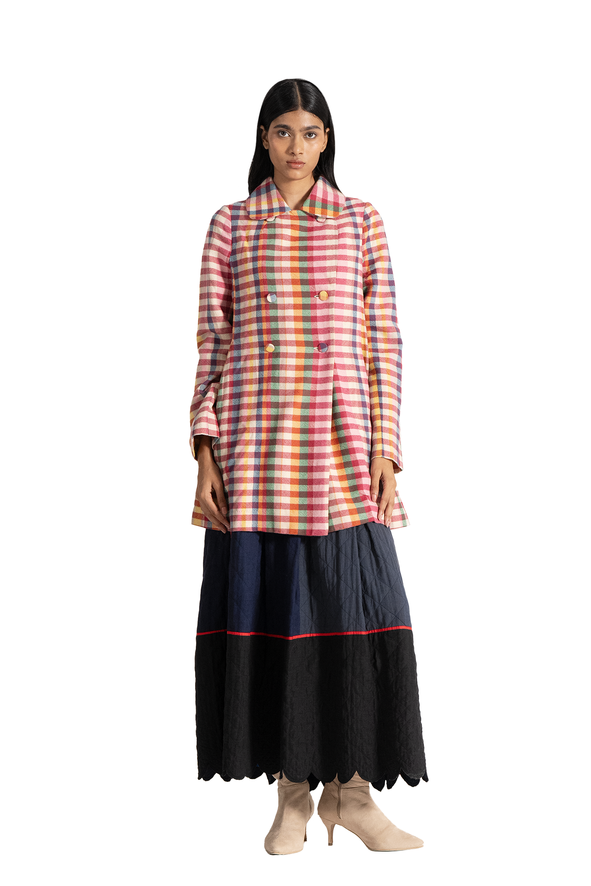 Knee Length Slim Fit Double Breasted Jacket In Multicolor Self Checkered 100% Merino Wool. Lined With Handblock Print 100% Silk.