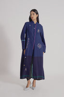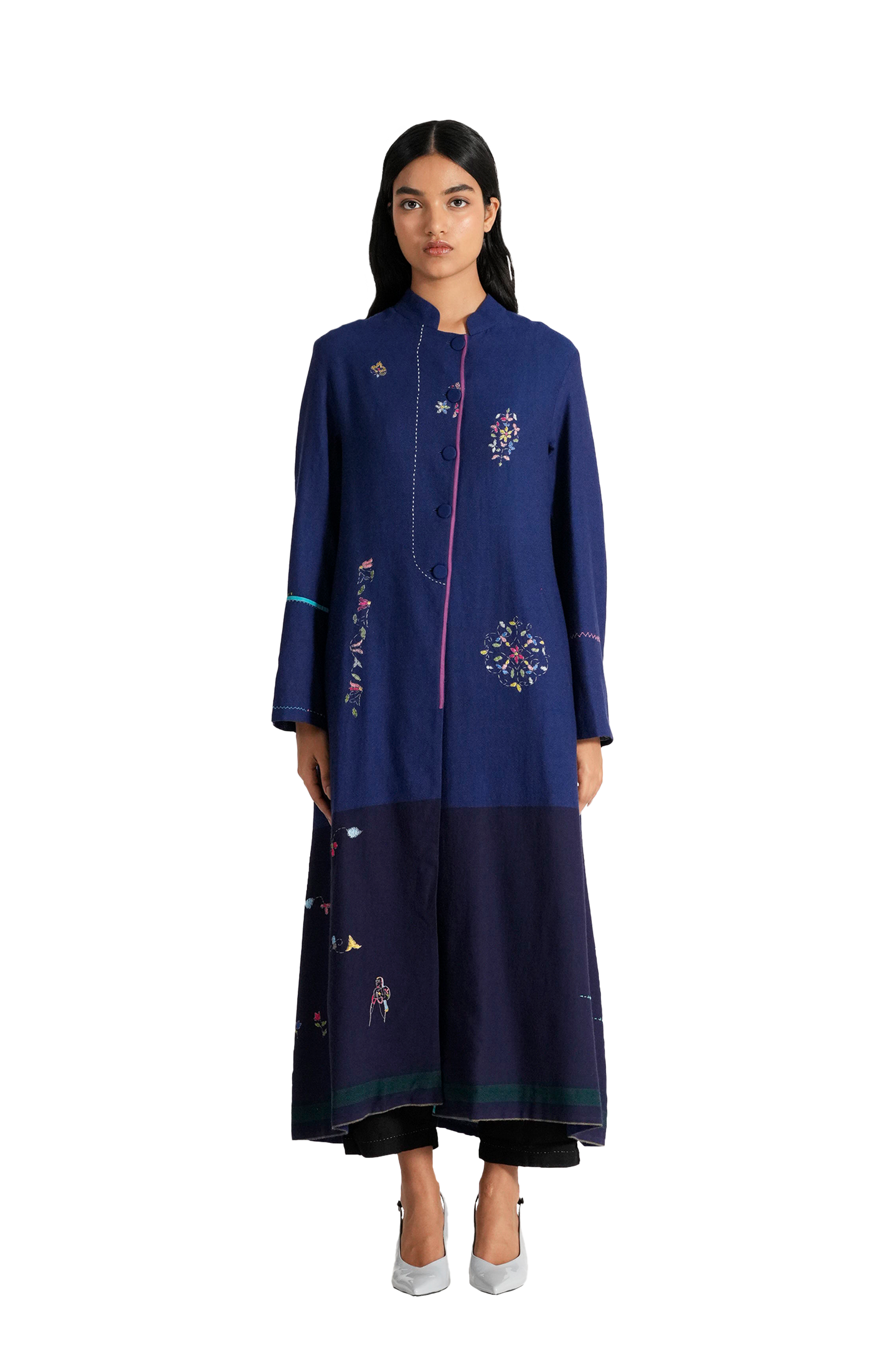 Button Down Straight Fit Long Jacket With Multicolor Delicate Hand Stitch Details And Floral Placement Hand Embroidery On 100% Merino Wool. Lined With Handblock Printed 100% Silk